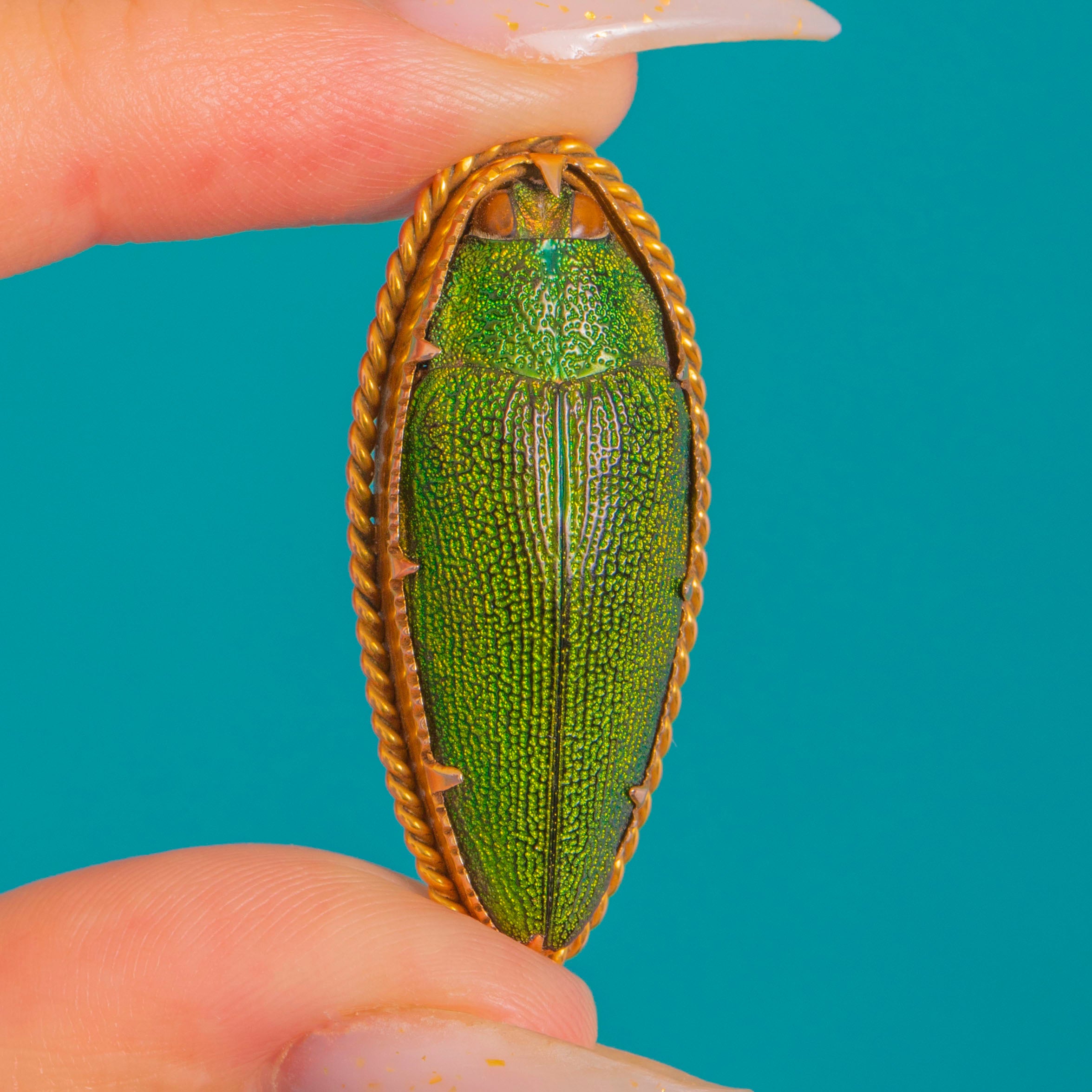 A striking late Victorian curiosity, this navette brooch pairs a vivid iridescent beetle elytron with a warm 9ct Gold rope‑twist frame. The glossy wing shimmers emerald to blue‑green with golden flashes, its natural longitudinal veining celebrated within an open‑backed, recessed bezel for pure, unfoiled colour. The minimalist single‑element composition and elegant marquise outline nod to the period’s Egyptian Revival and natural‑history fascinations.
