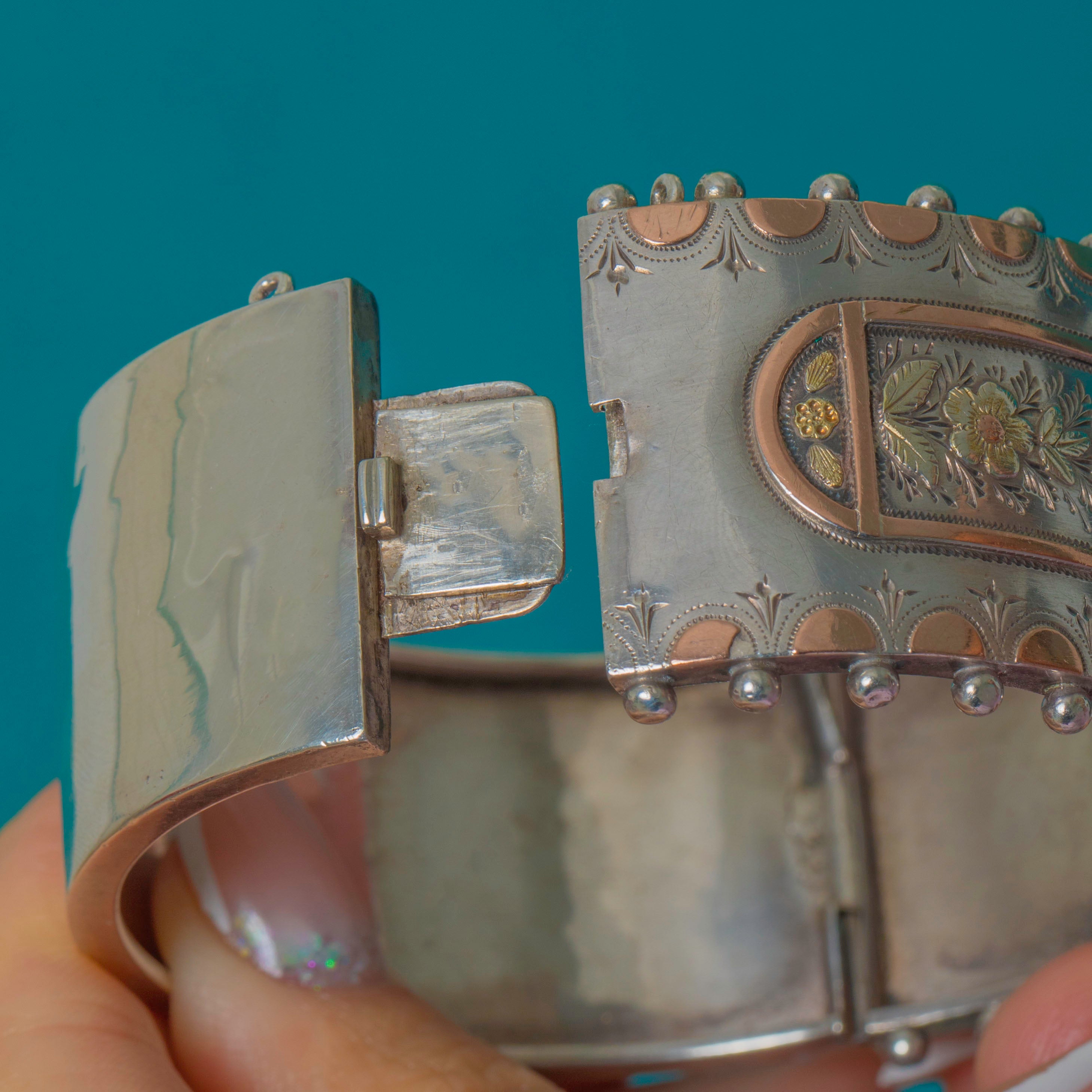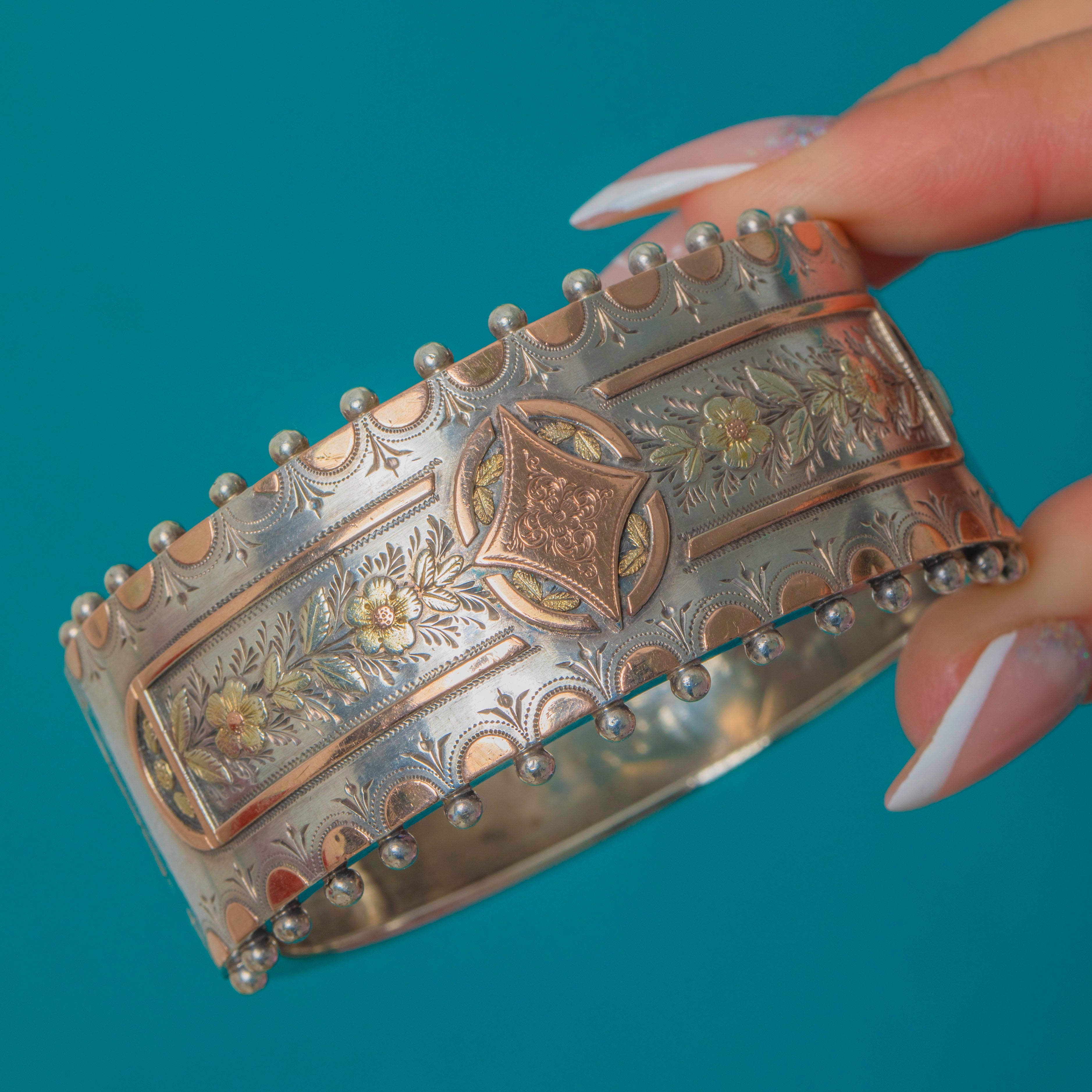 VERY GOOD: The engraved Silver and Rose Gold detailing remains crisp with only light surface wear in keeping with age. The hinge and clasp operate perfectly. There are some minor dings to the rear of the bangle, typical for Victorian pieces, but not noticeable when worn.