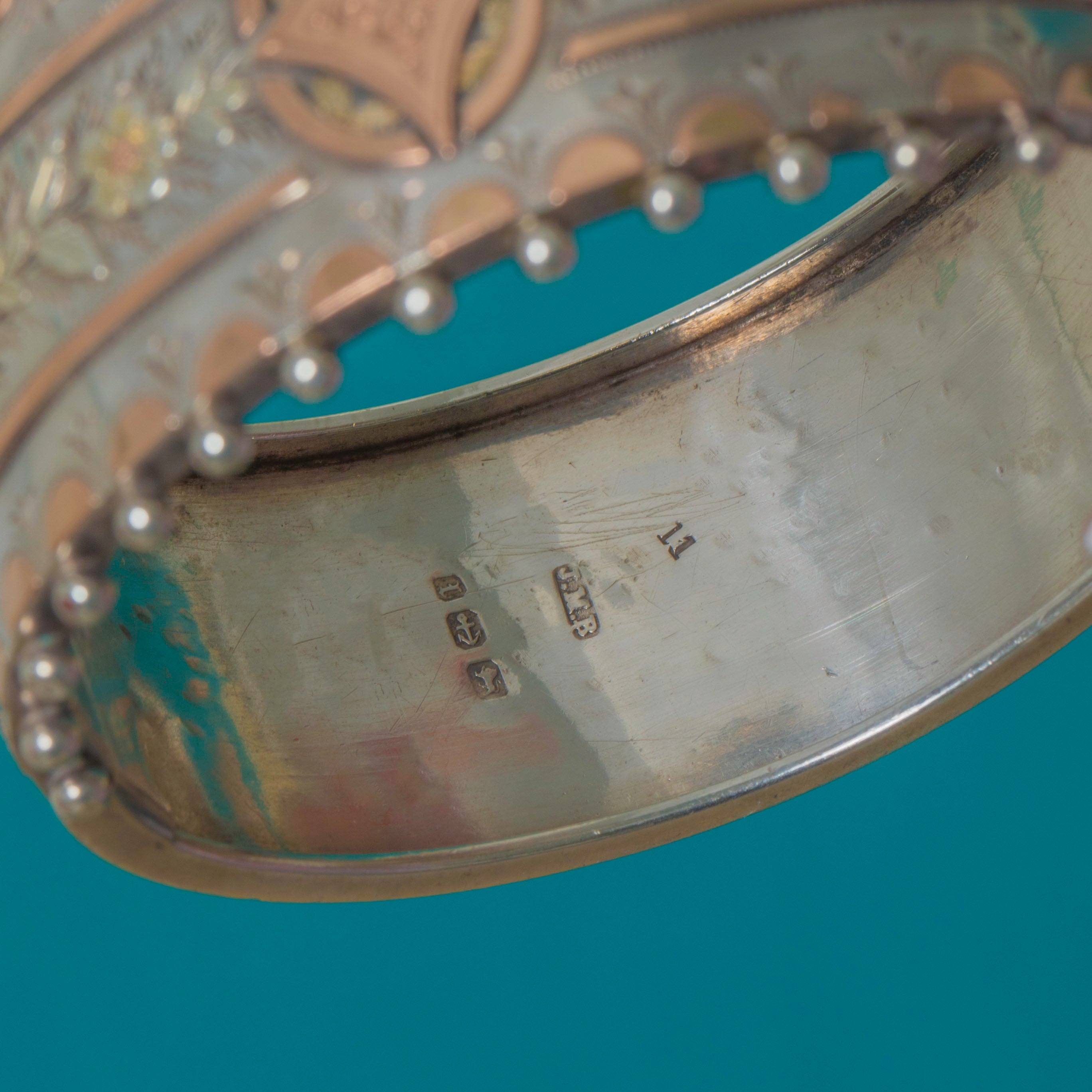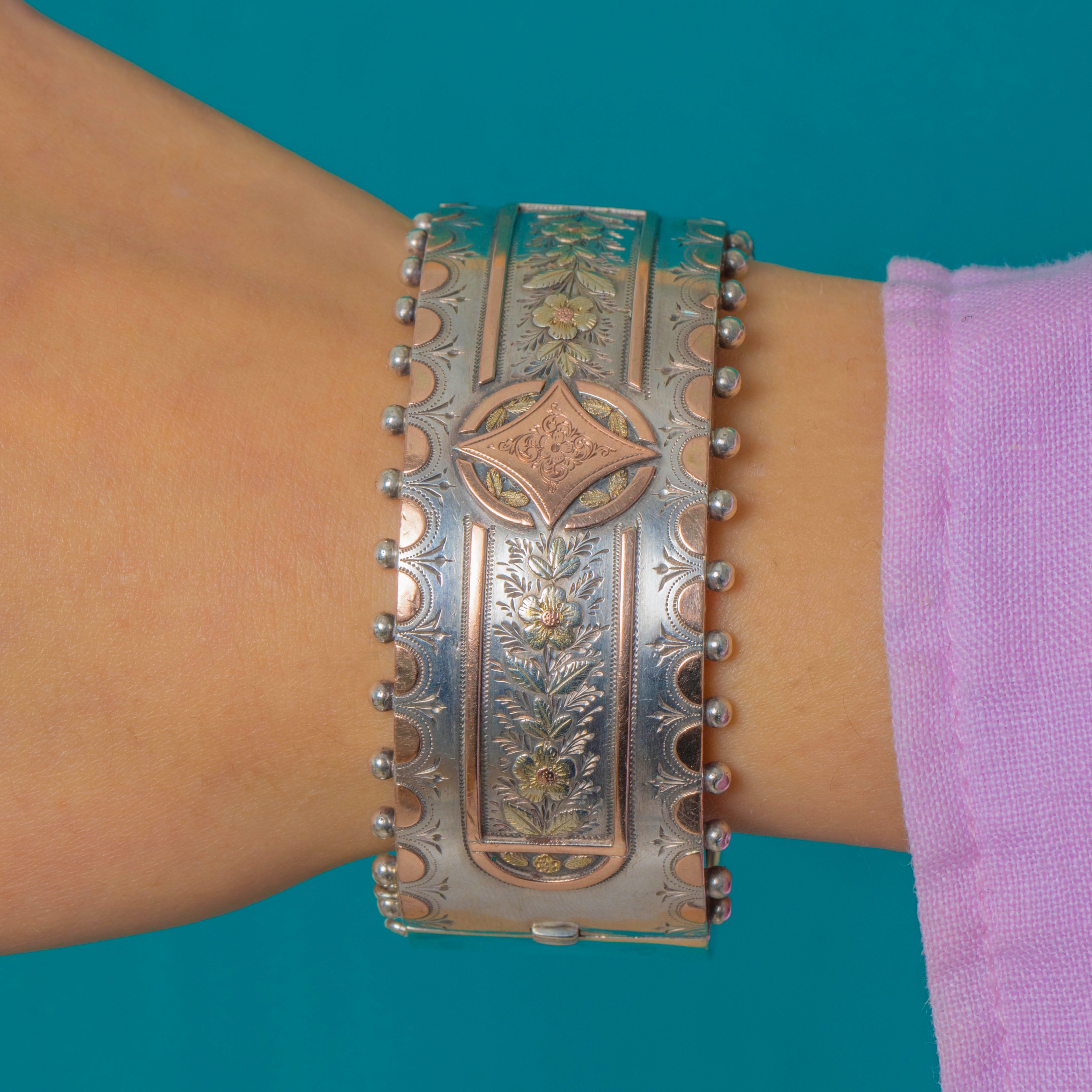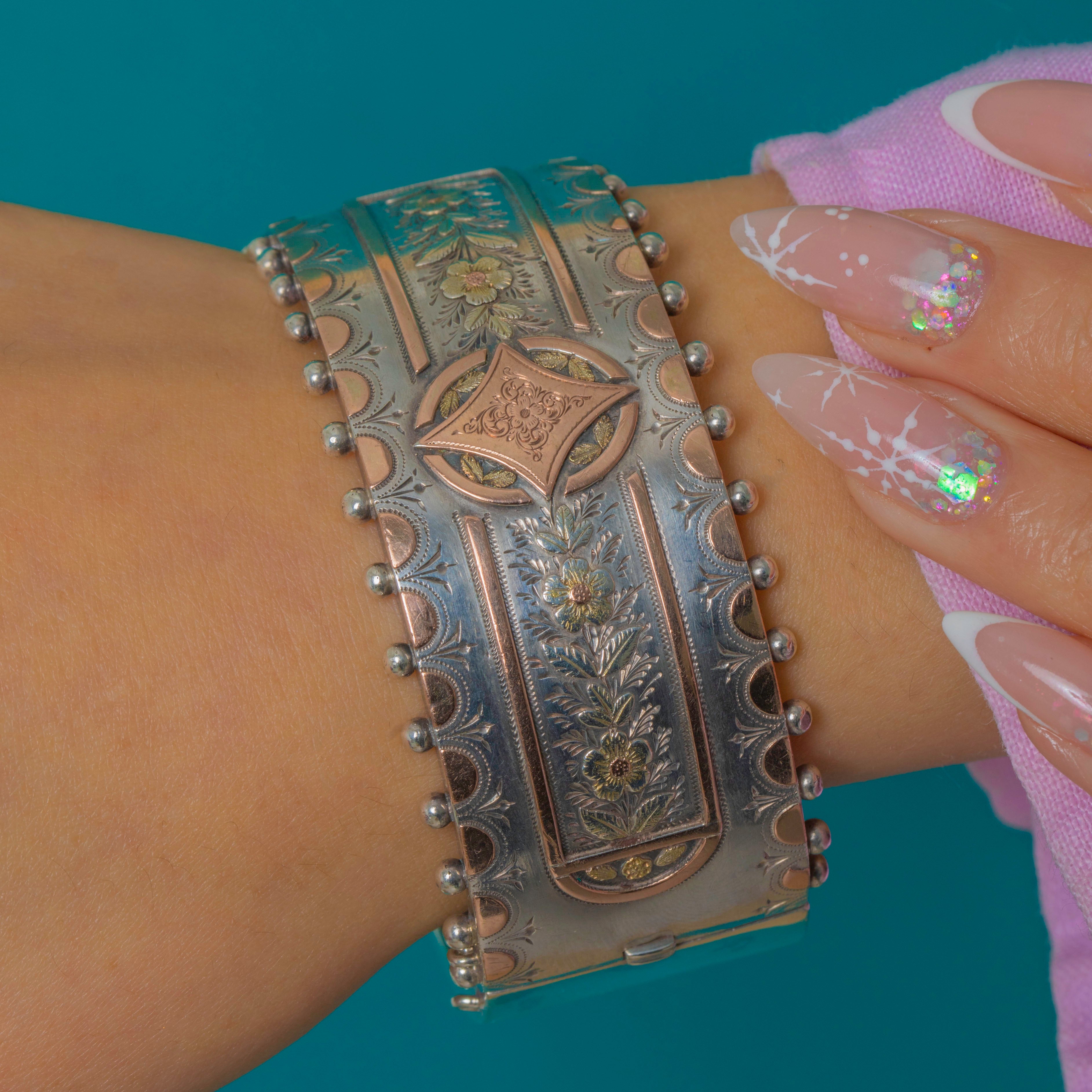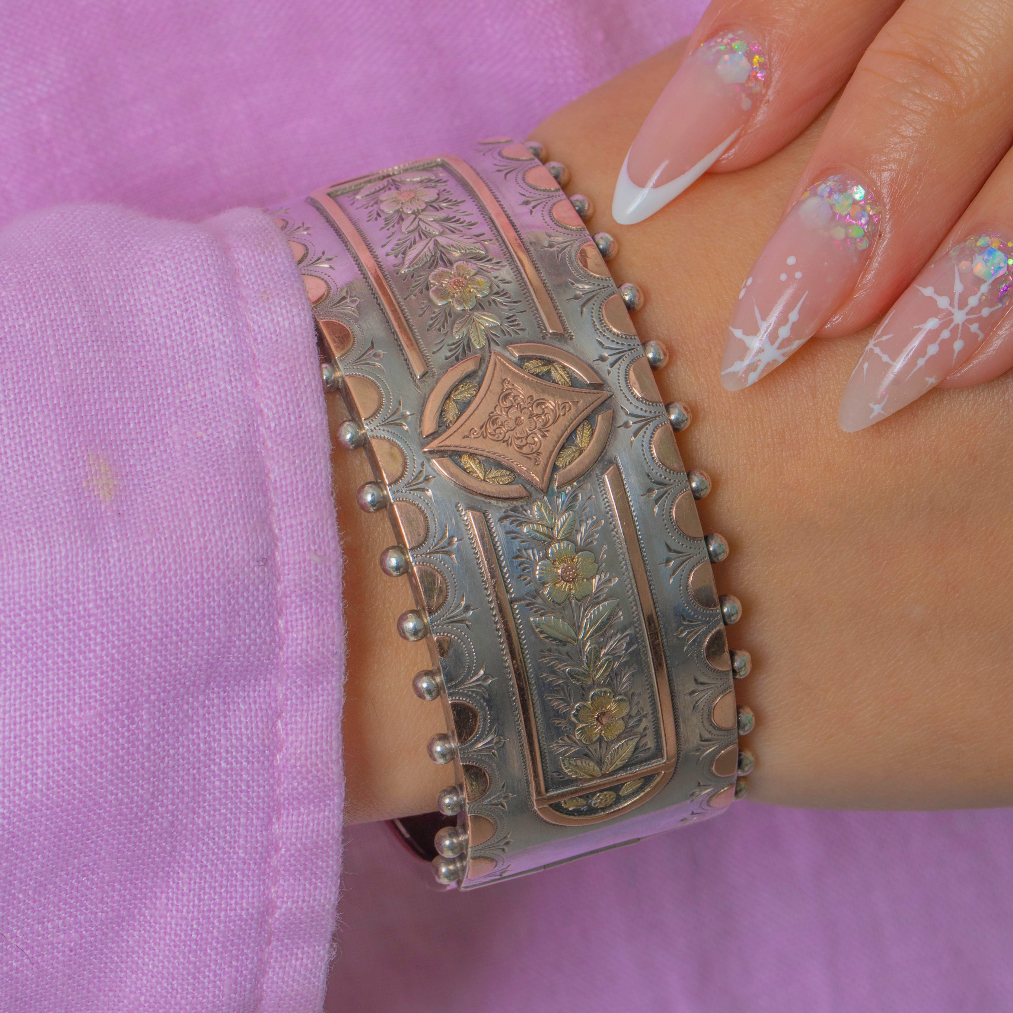This Victorian Aesthetic bangle, dated 1885, is an exquisitely crafted piece combining Sterling Silver with warm Rose Gold geometric details. The bold, architectural design is characteristic of late-19th-century taste, with crisp engraving and contrasting precious metals creating a striking visual effect.