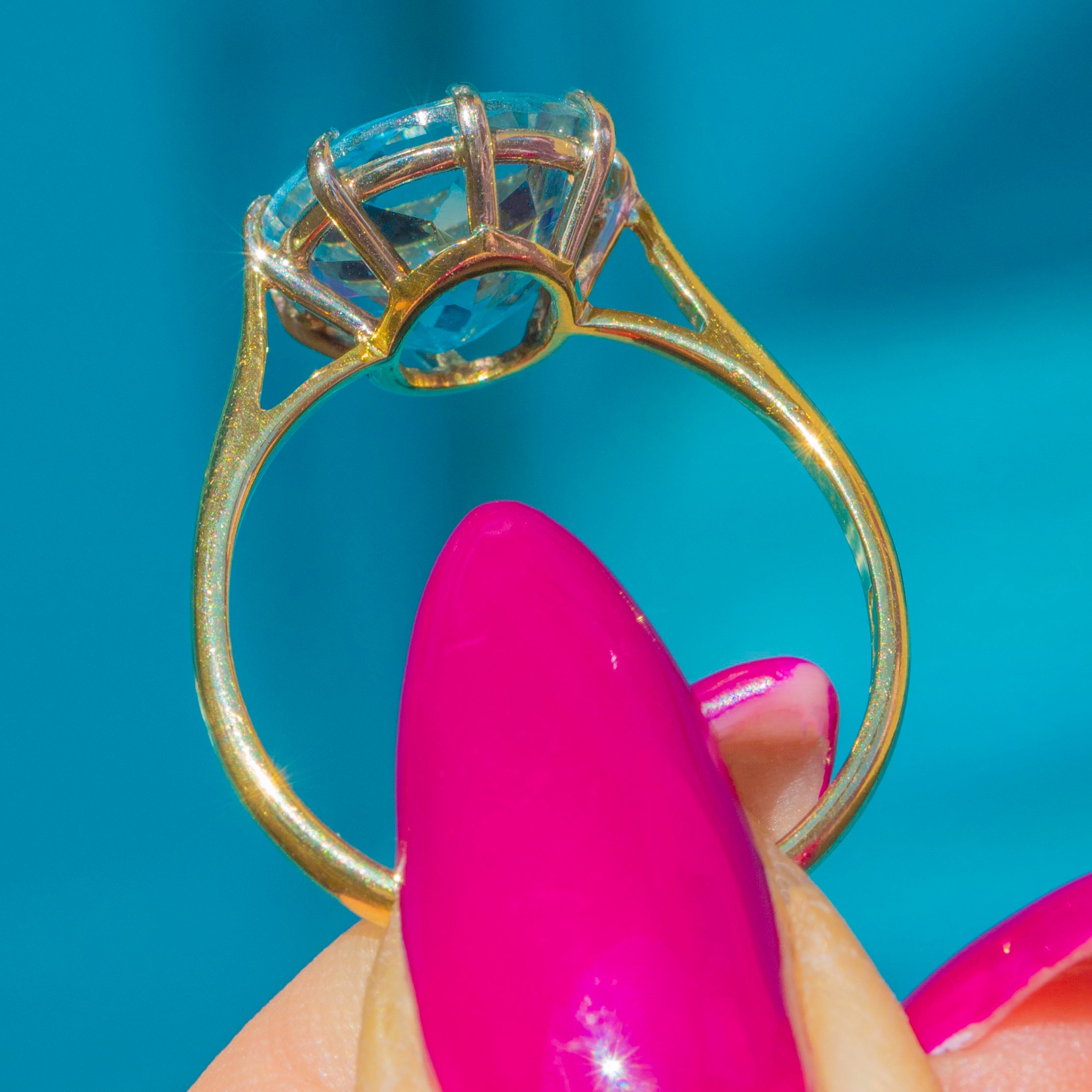 The Aquamarine is set within buttery 18ct Gold claw settings and rests on a smooth, glossy band, providing ample finger coverage. This striking ring is fully hallmarked and dated to 1983 - it simply radiates vintage charm!