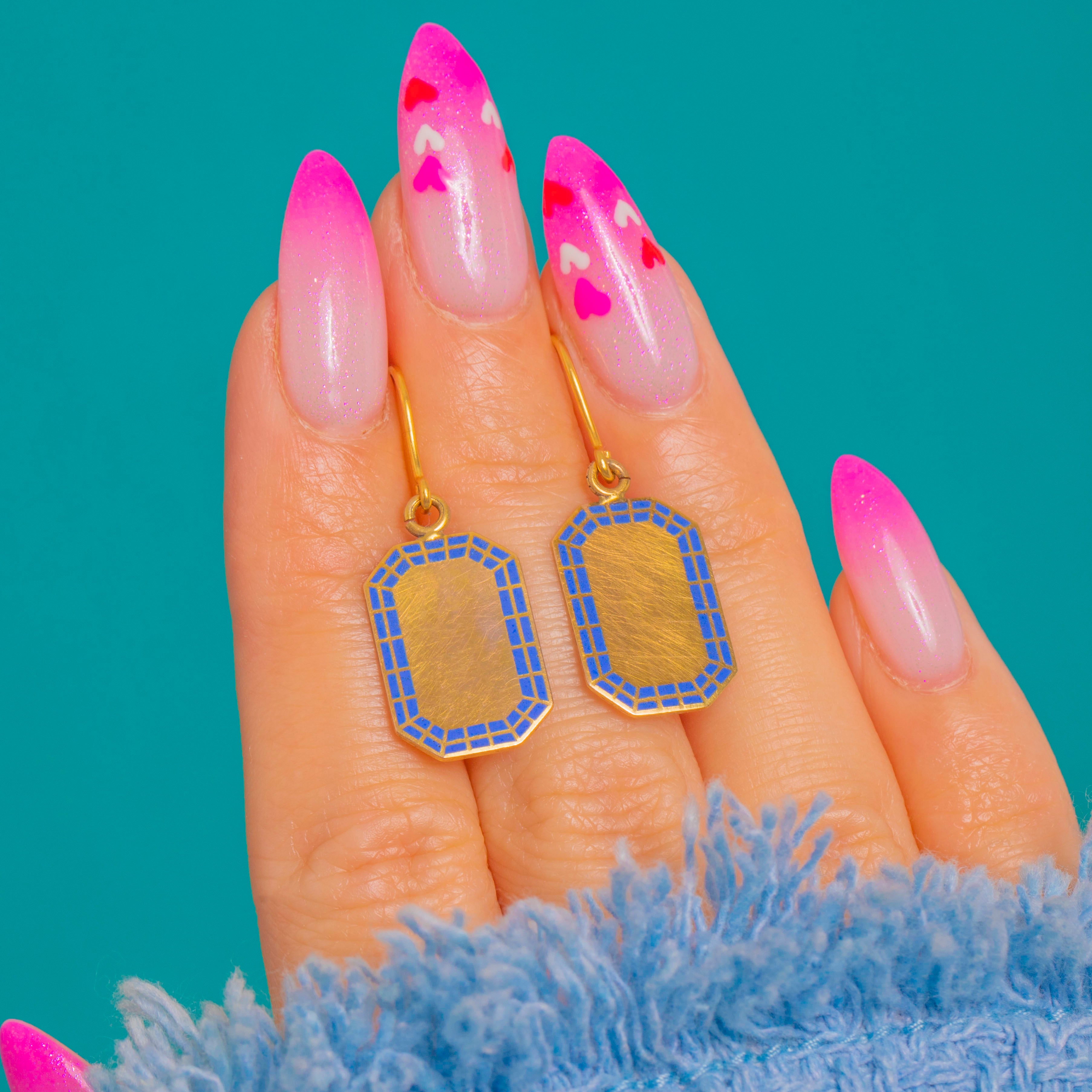 Sleek geometry meets vivid colour in this elegant pair of Art Deco 9ct Gold drop earrings. Each petite plaque is framed by a segmented border of rich cobalt-blue Enamel, drawing the eye to a softly brushed central field for a chic, architectural finish. The clean lines and octagonal-rectangular silhouette feel wonderfully graphic and effortlessly refined.