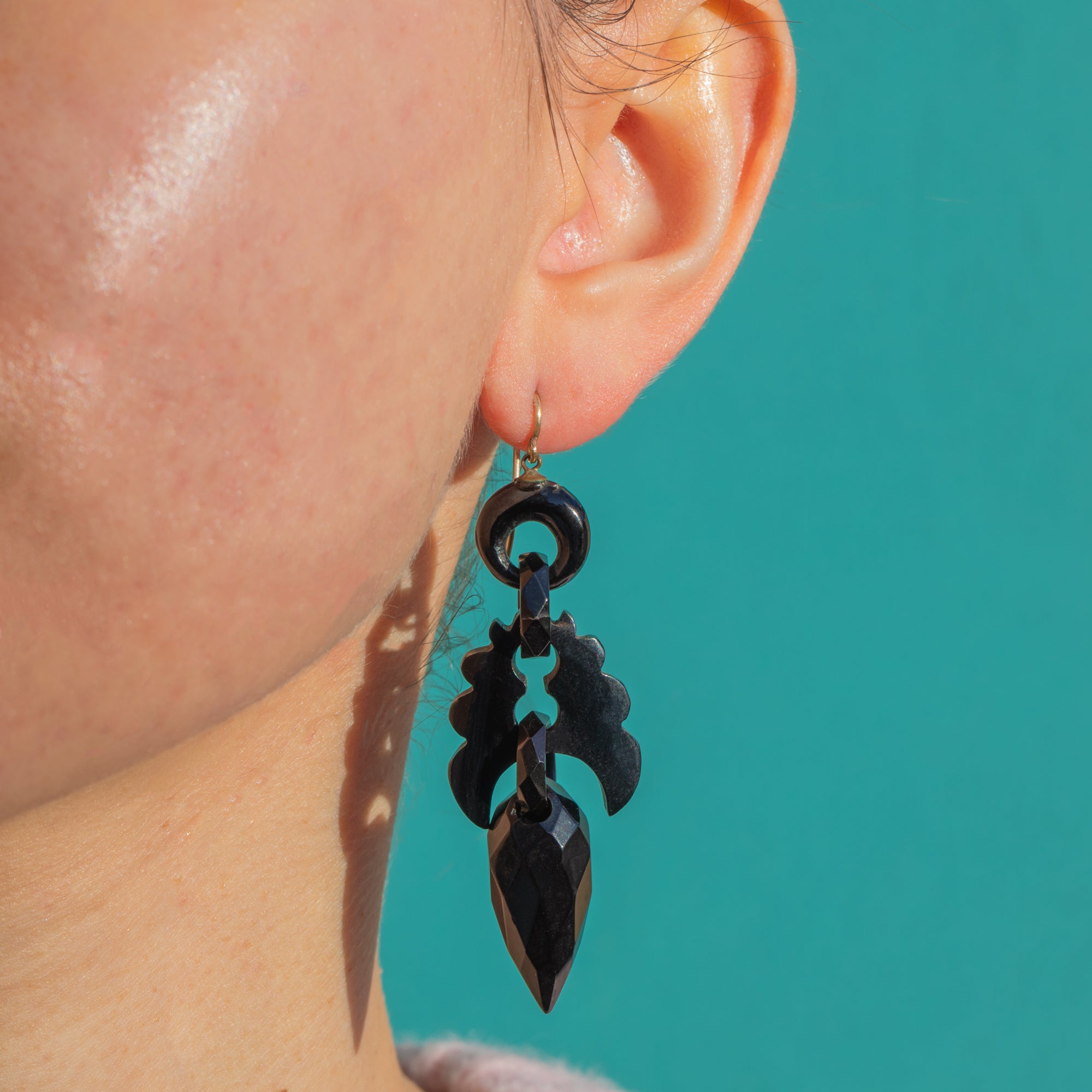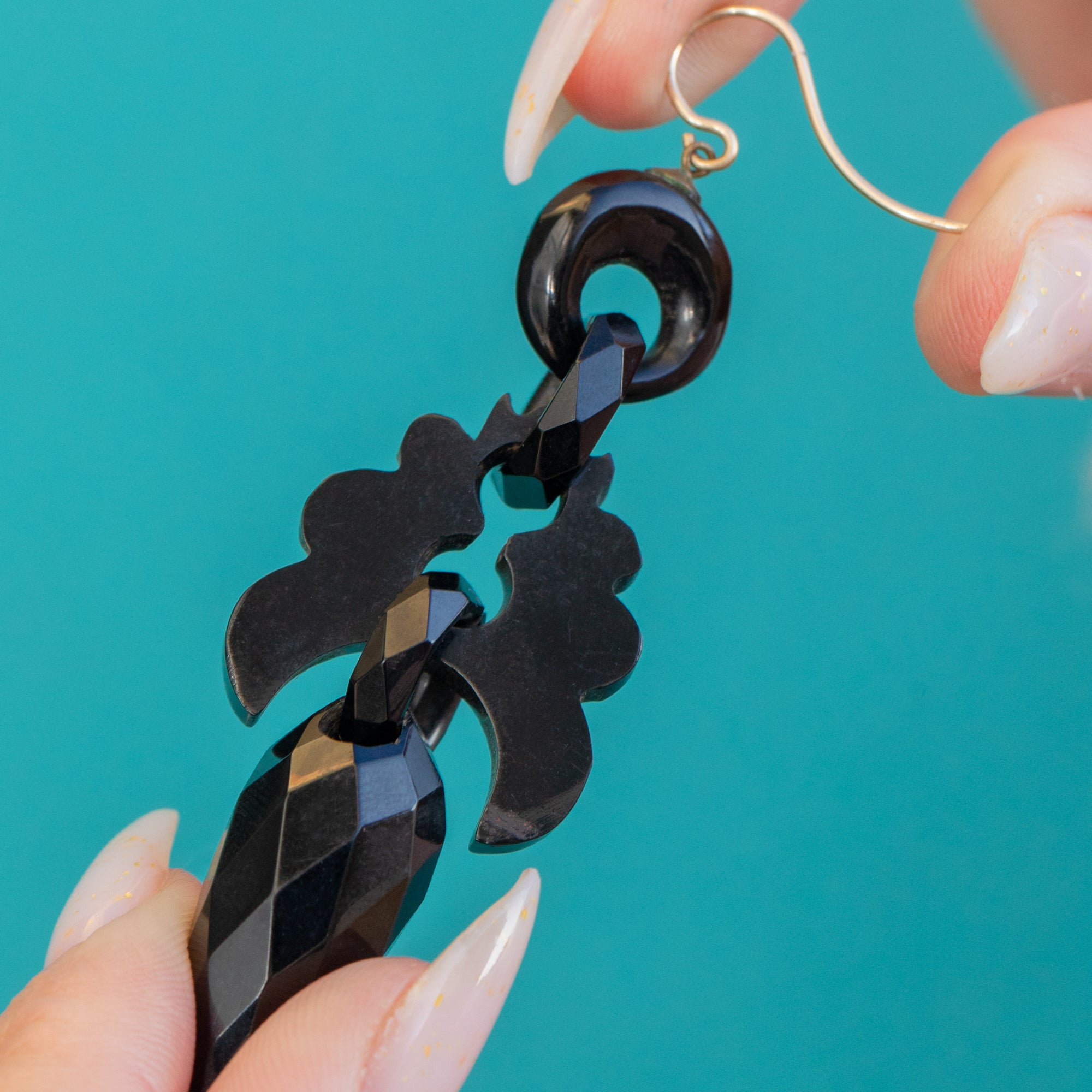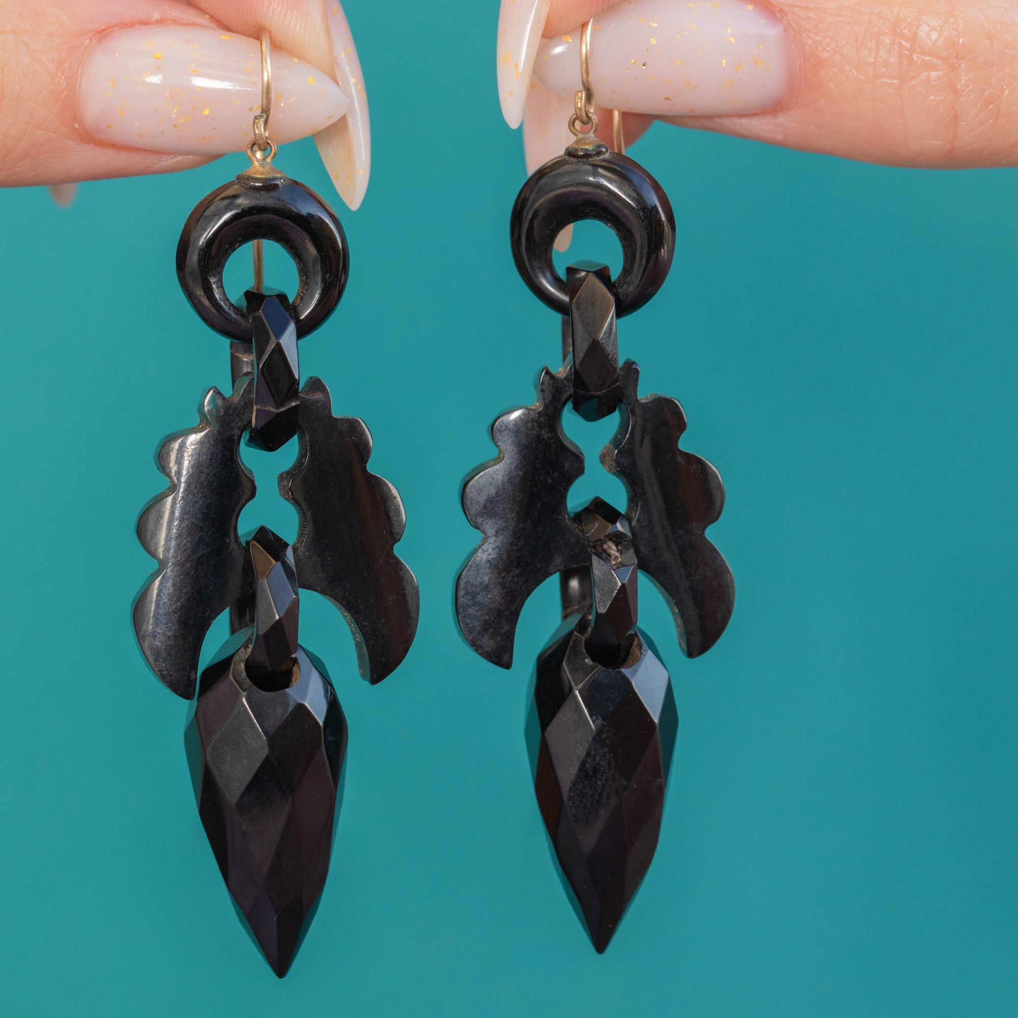 Finished with 9ct Gold shepherd-hook fittings, these earrings balance bold presence with graceful light-play across the crisp facets and pierced details. A timeless choice for collectors and stylists alike, they bring a touch of Victorian drama to any look.