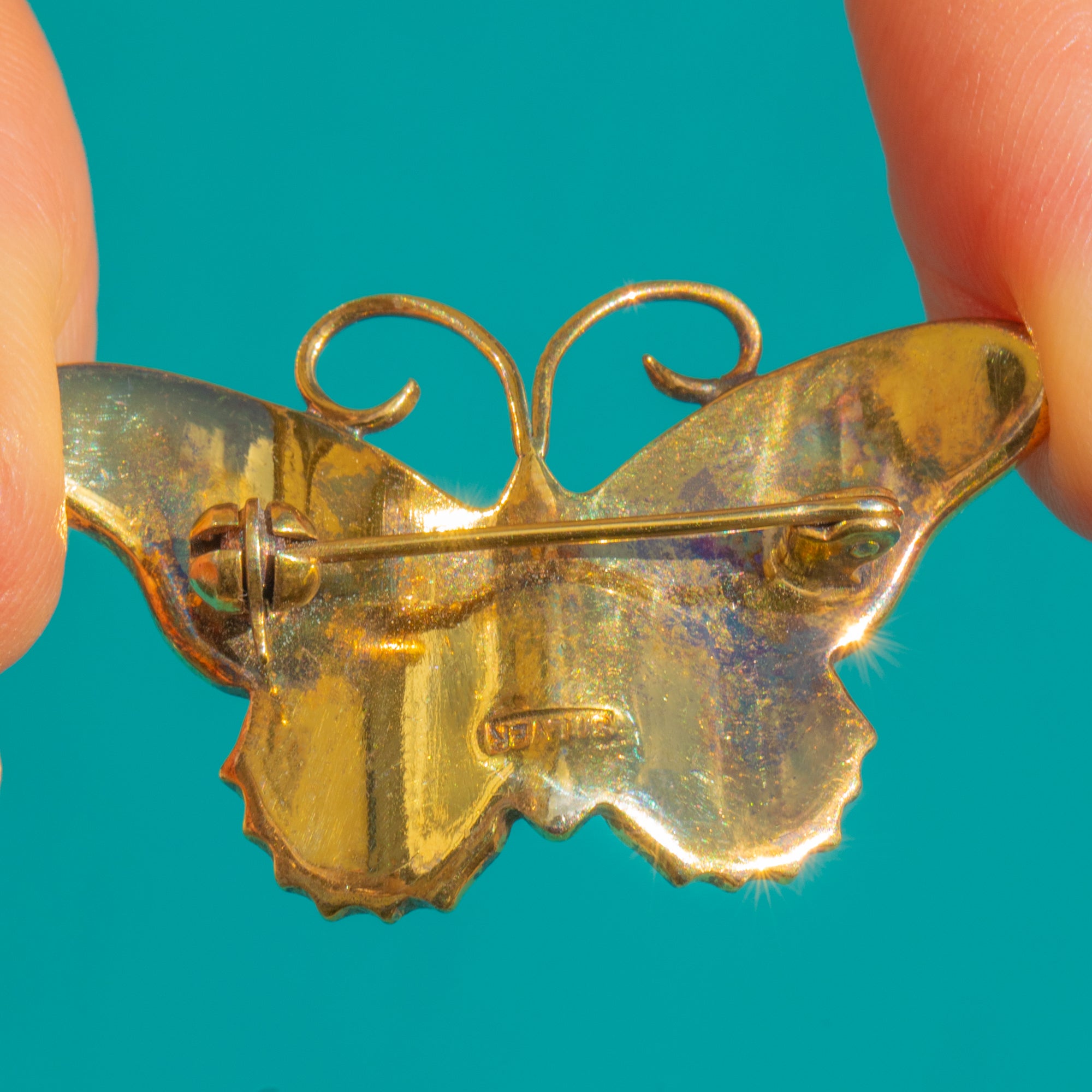 This joyous butterfly brooch captures the light with glossy Yellow Enamel wings delicately flecked with fine black speckling. The scalloped lower wings and radiating striations create beautiful movement and texture, while curled antennae add a charming, naturalistic flourish.