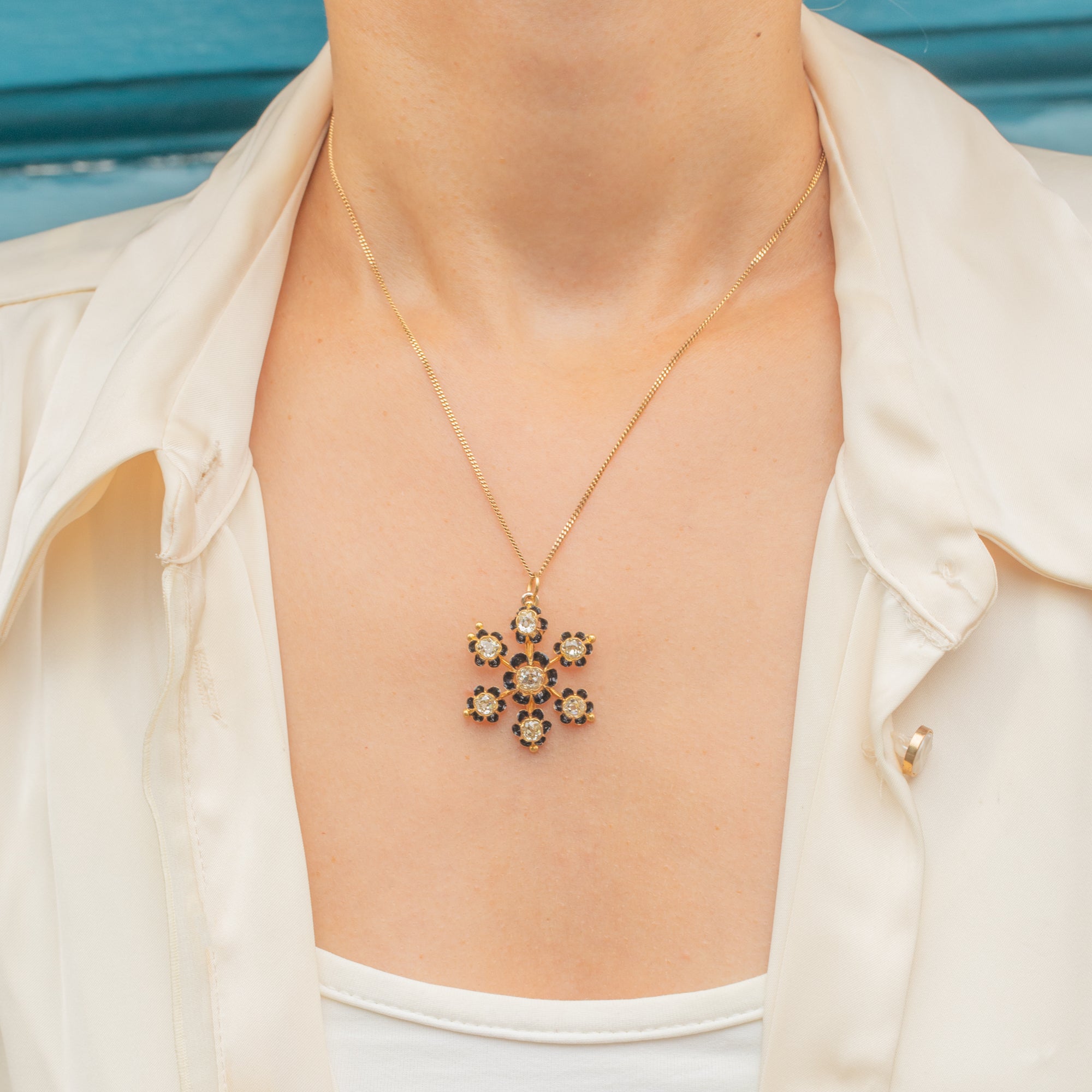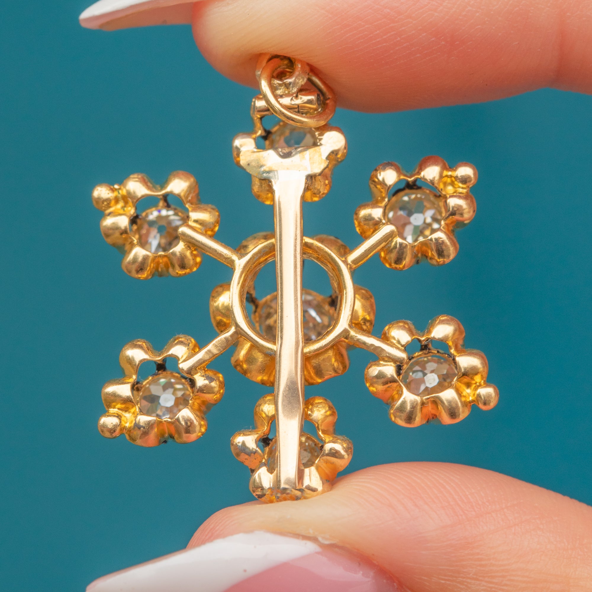 This superb Antique pendant showcases a dazzling cluster of Old Mine Cut Diamonds with a total weight of approximately 1.75ct.