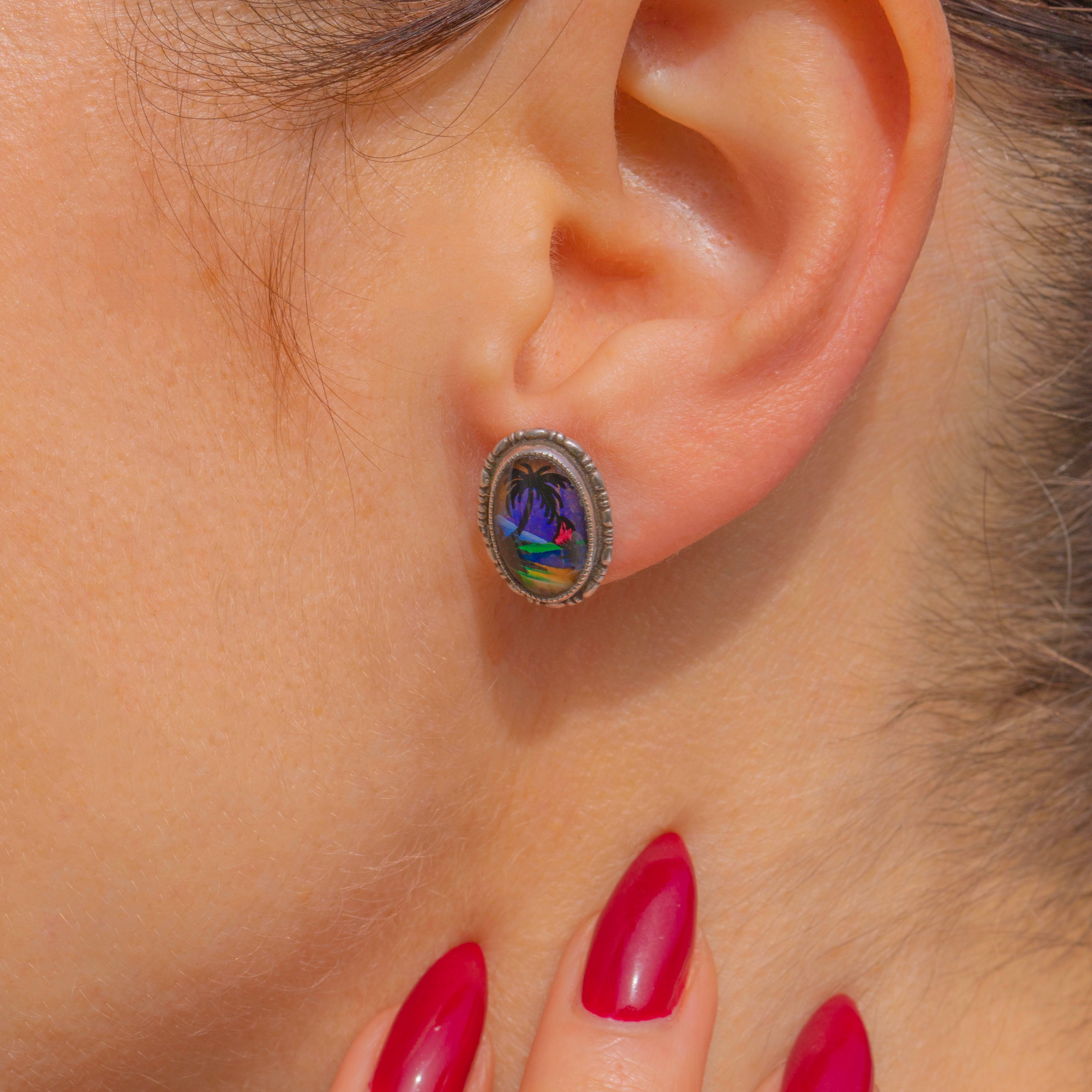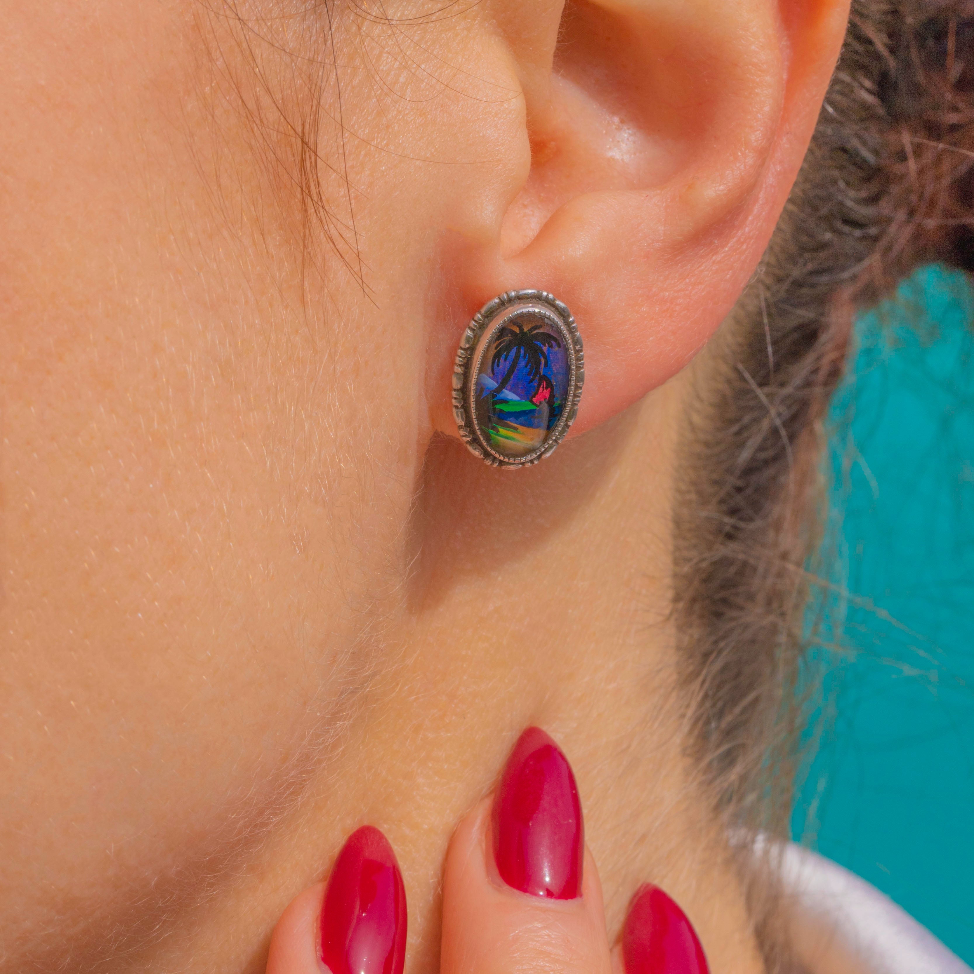 A joyful slice of the tropics from the Art Deco era, these petite Sterling Silver studs showcase a vibrant Morpho Butterfly Wing beneath a miniature silhouetted palm tree and shoreline. The iridescence shimmers with blues, purples and greens, creating a magical seascape effect that changes with the light.
