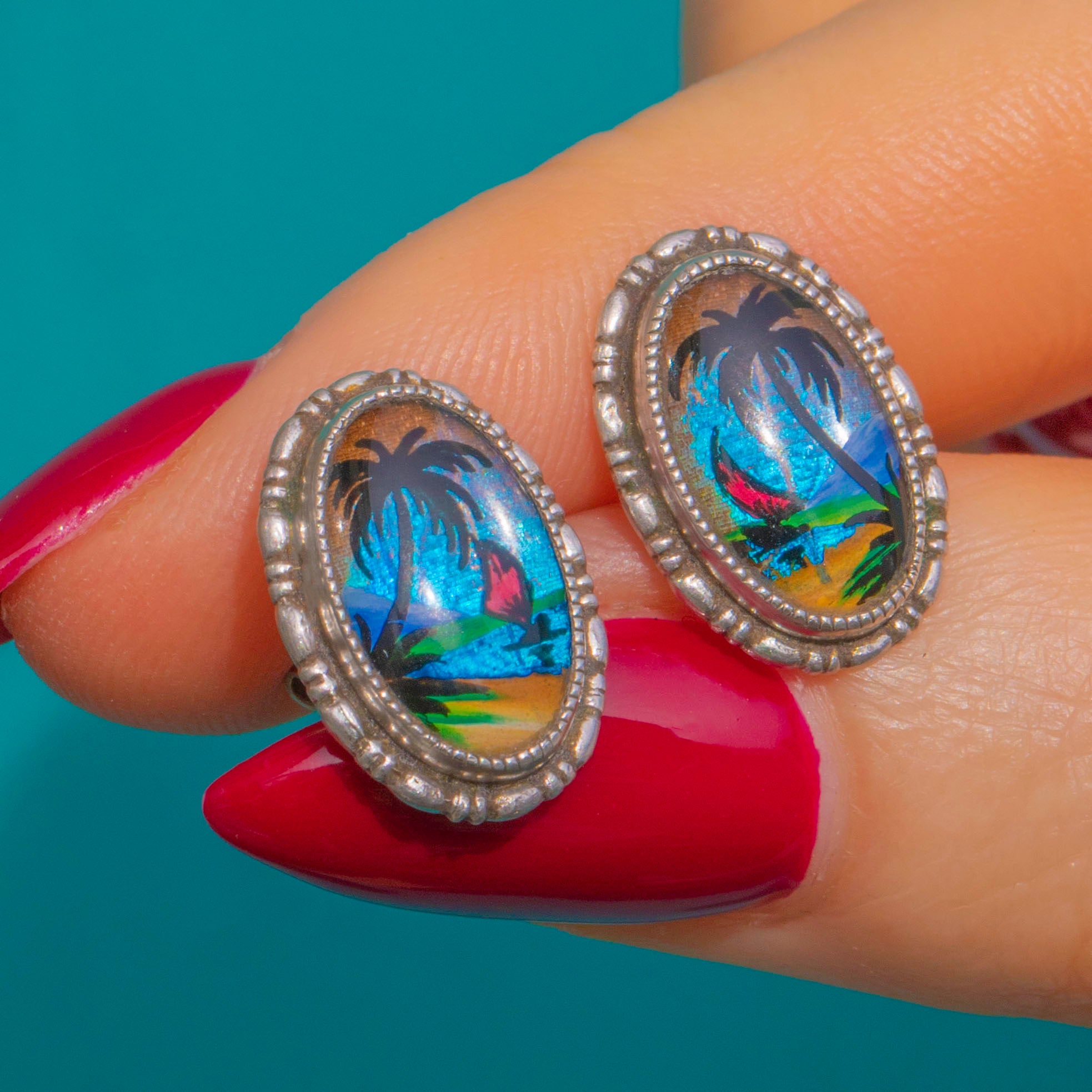 Thomas Mott Vintage 1920's Tropical Scene Butterfly Wing Art Stud Earrings