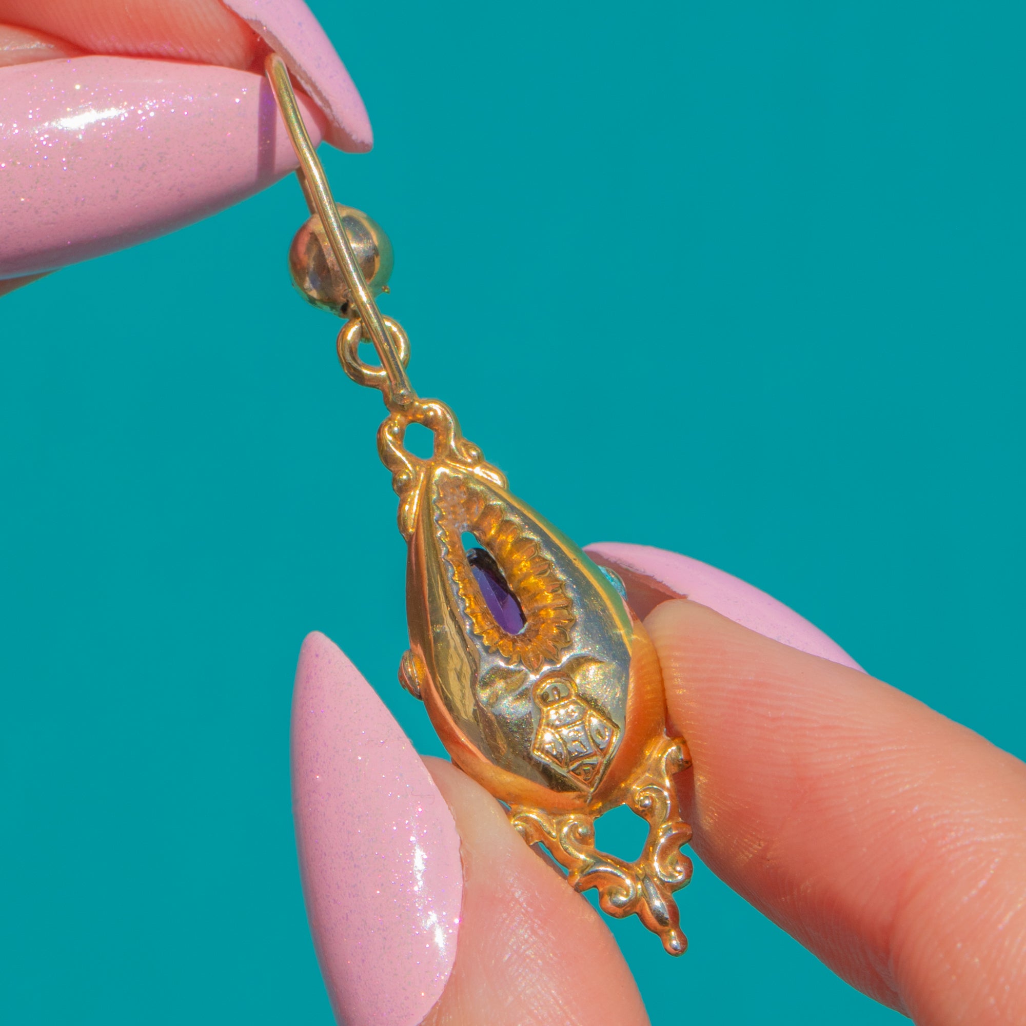 Ornate and romantic, these Victorian torpedo drop earrings are crafted in rich 14ct Gold with beautifully chased foliate motifs. Each elongated drop centres a pear-cut Pink Garnet Paste framed by a serrated, sunburst collet, with beaded ornament and an elegant openwork tip for a refined, antique silhouette.