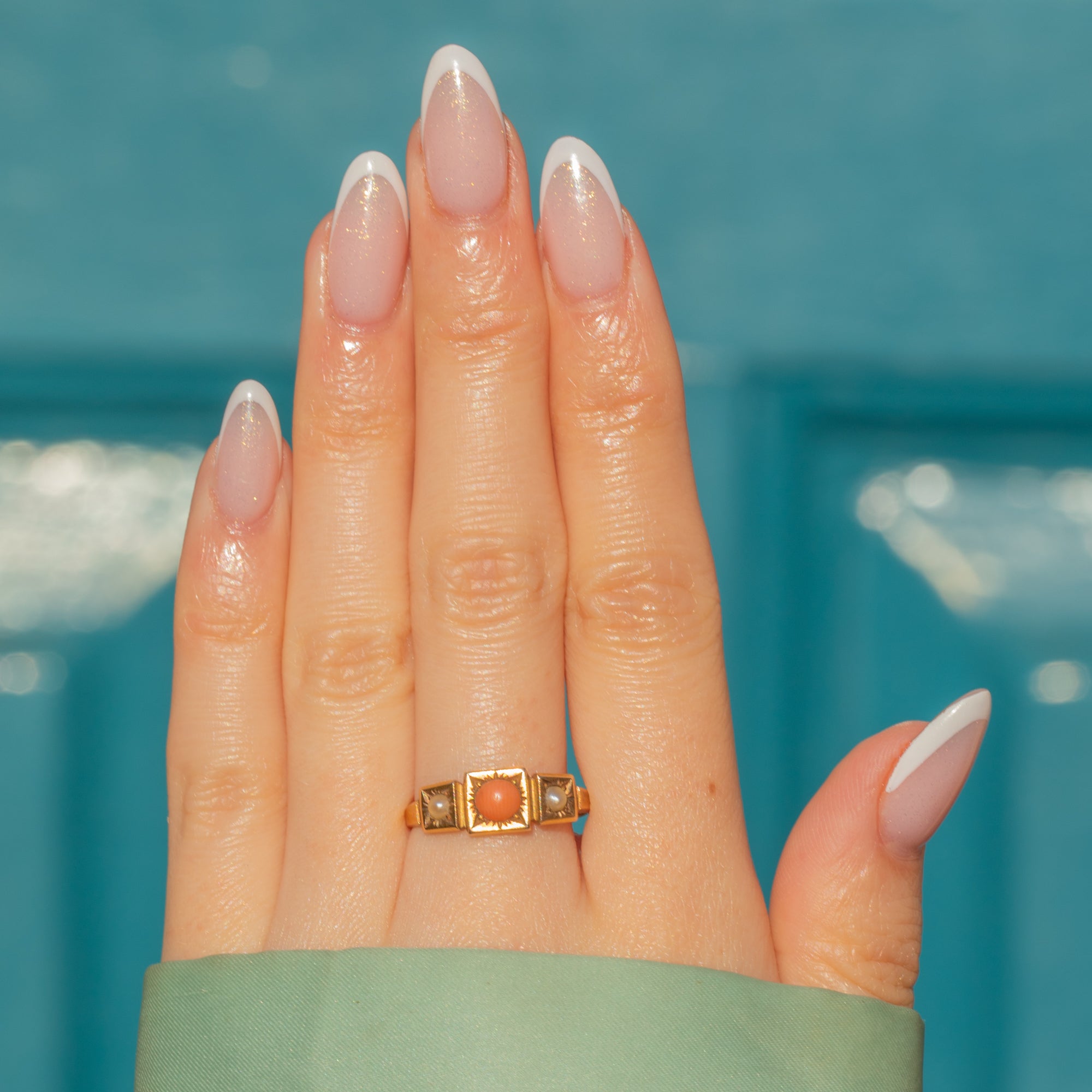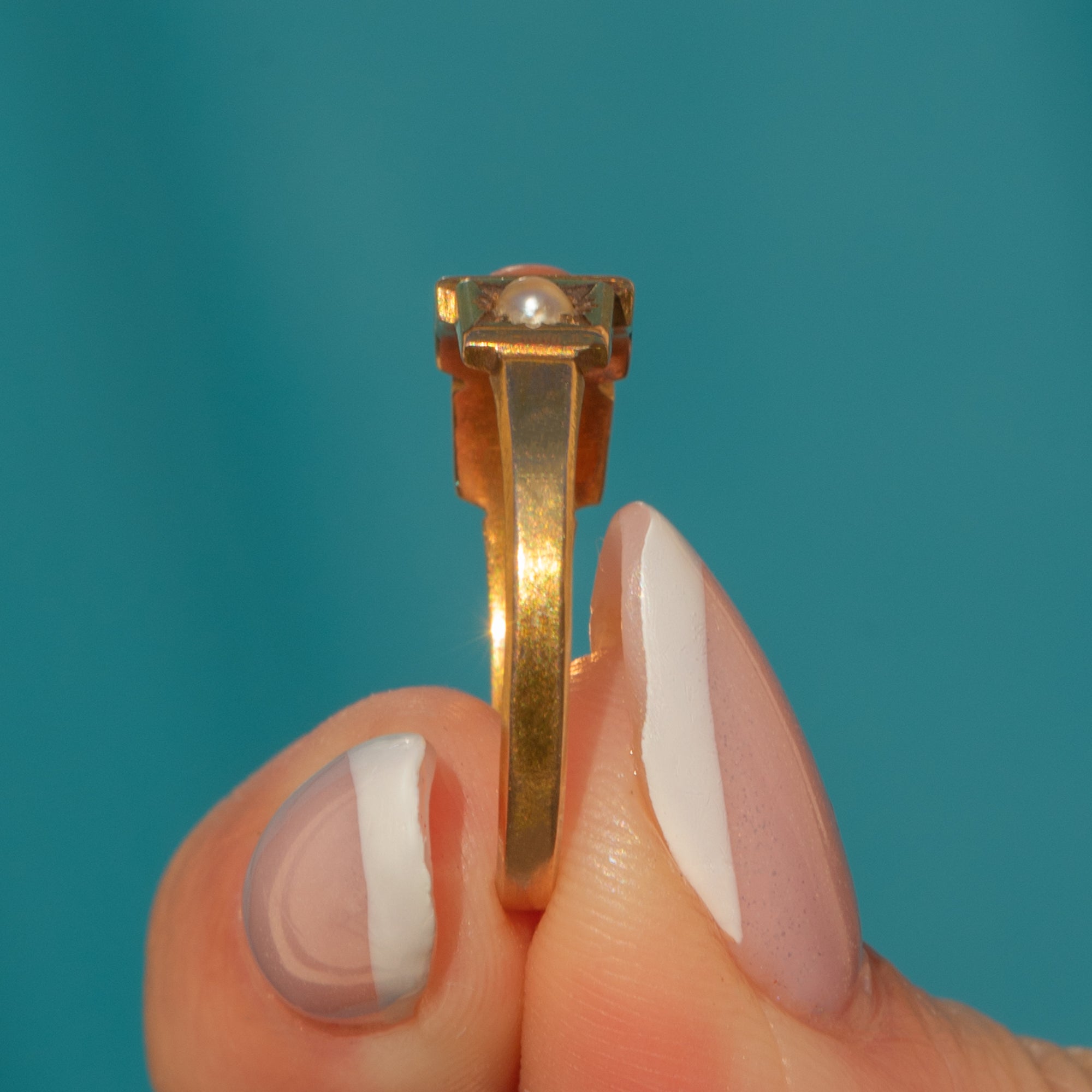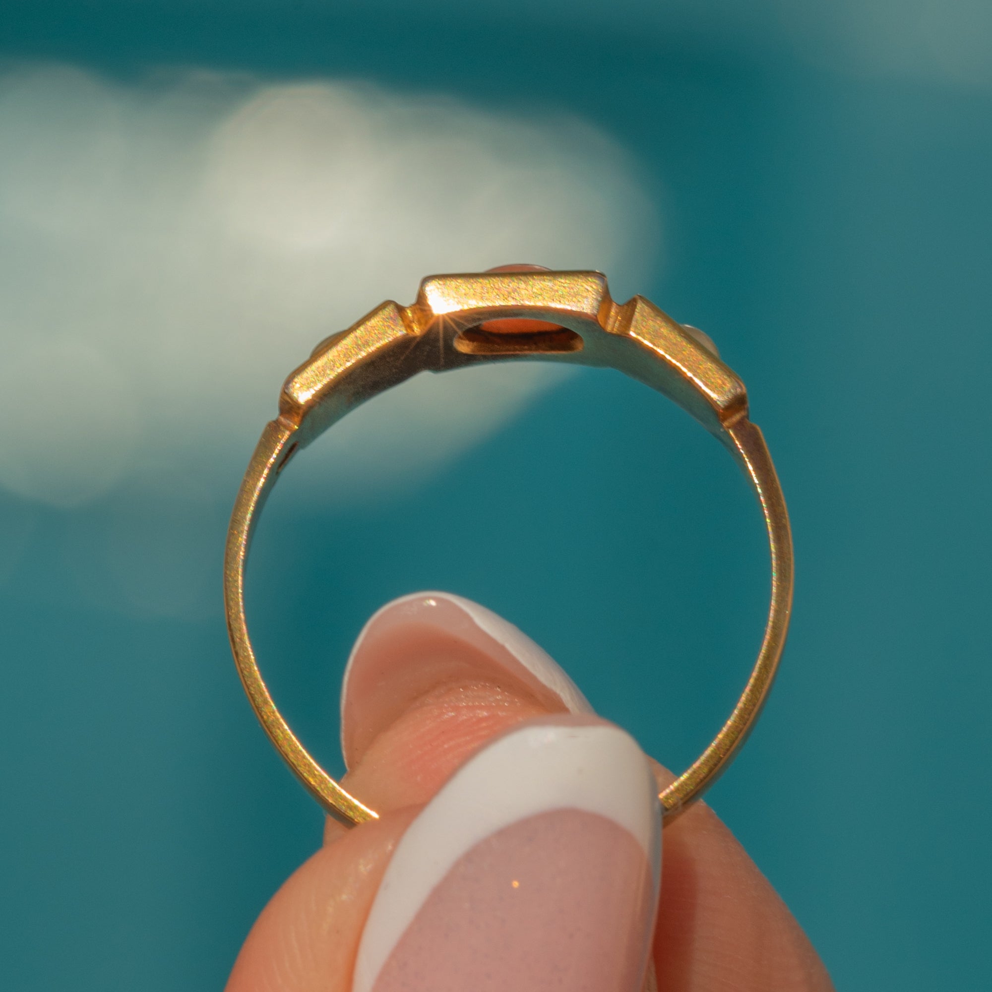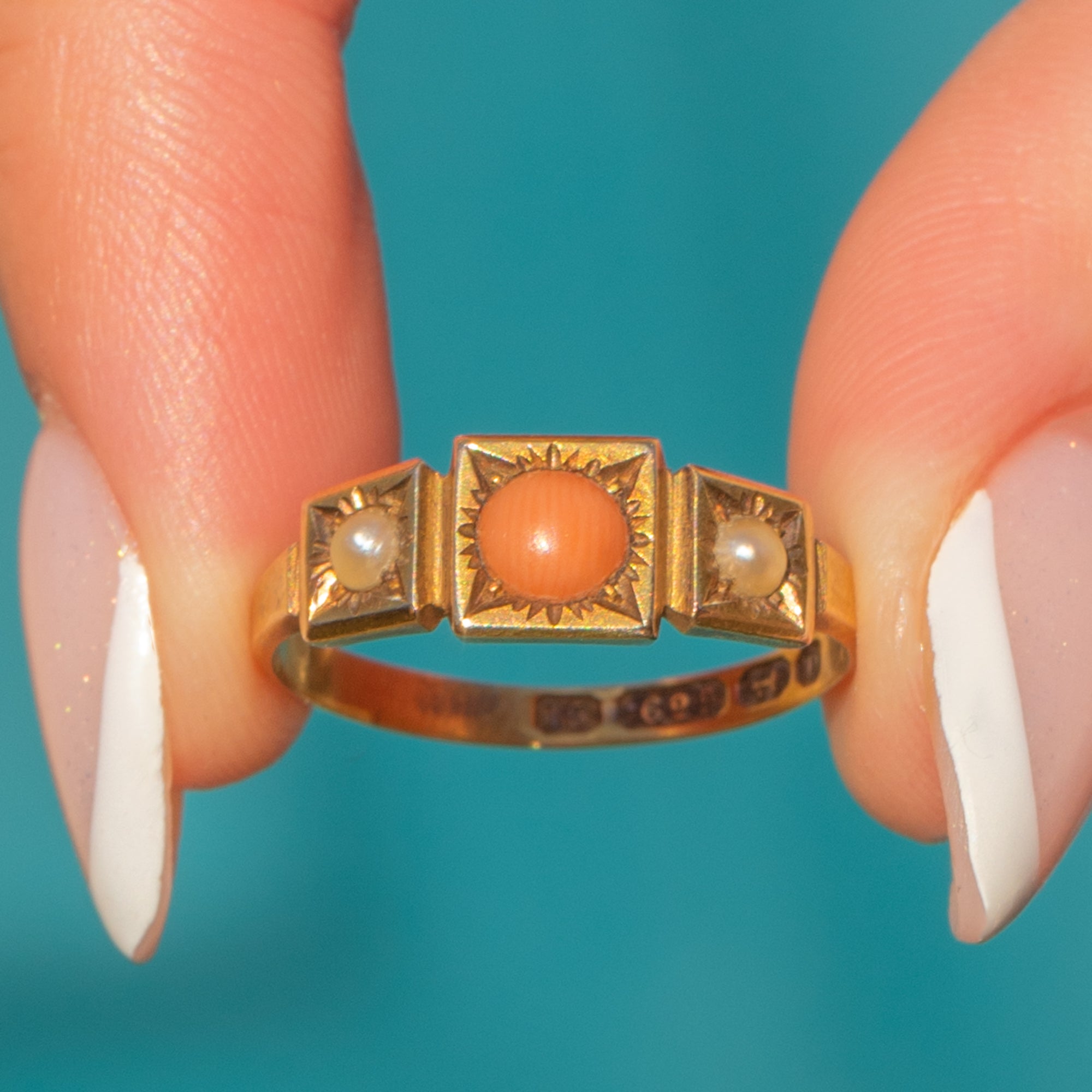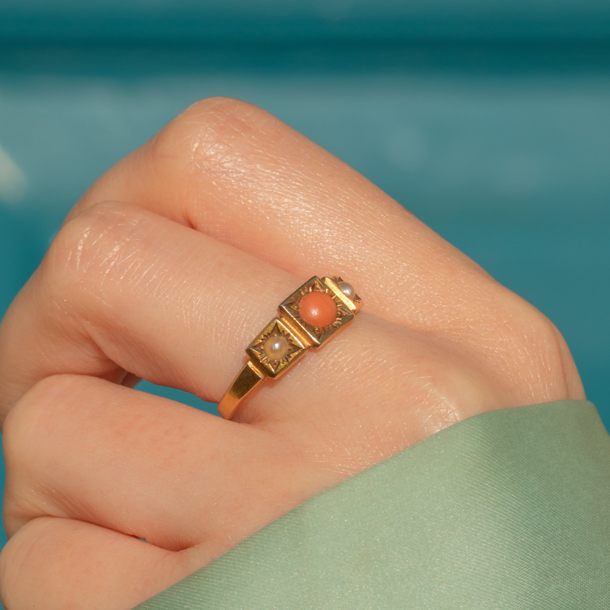 Your outfit won't feel complete without this Victorian 15ct Gold Coral Pearl trilogy ring! A sweet combination of apricot-hued Coral and shimmering Pearls, this ring will see you through the spring and summer with ease.