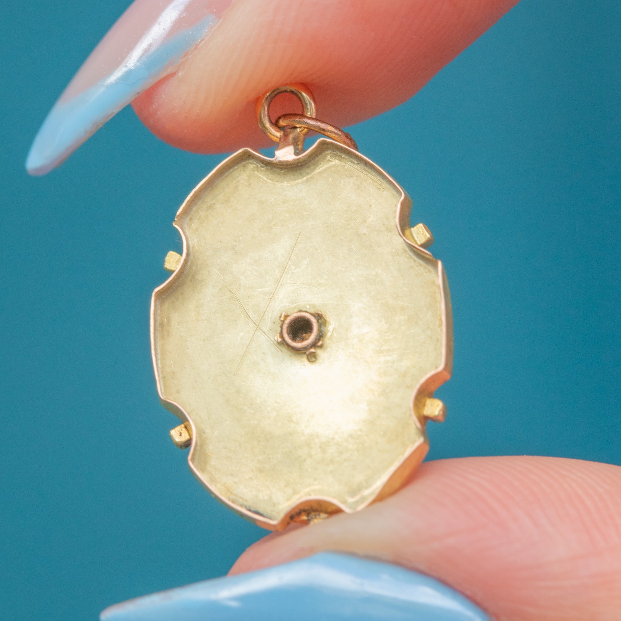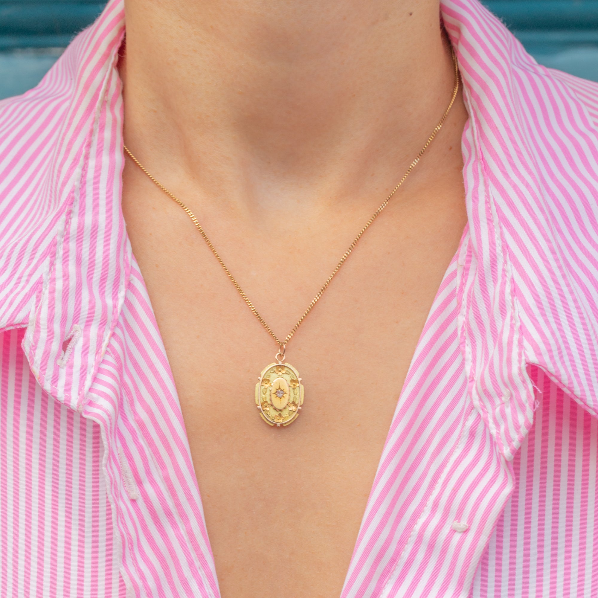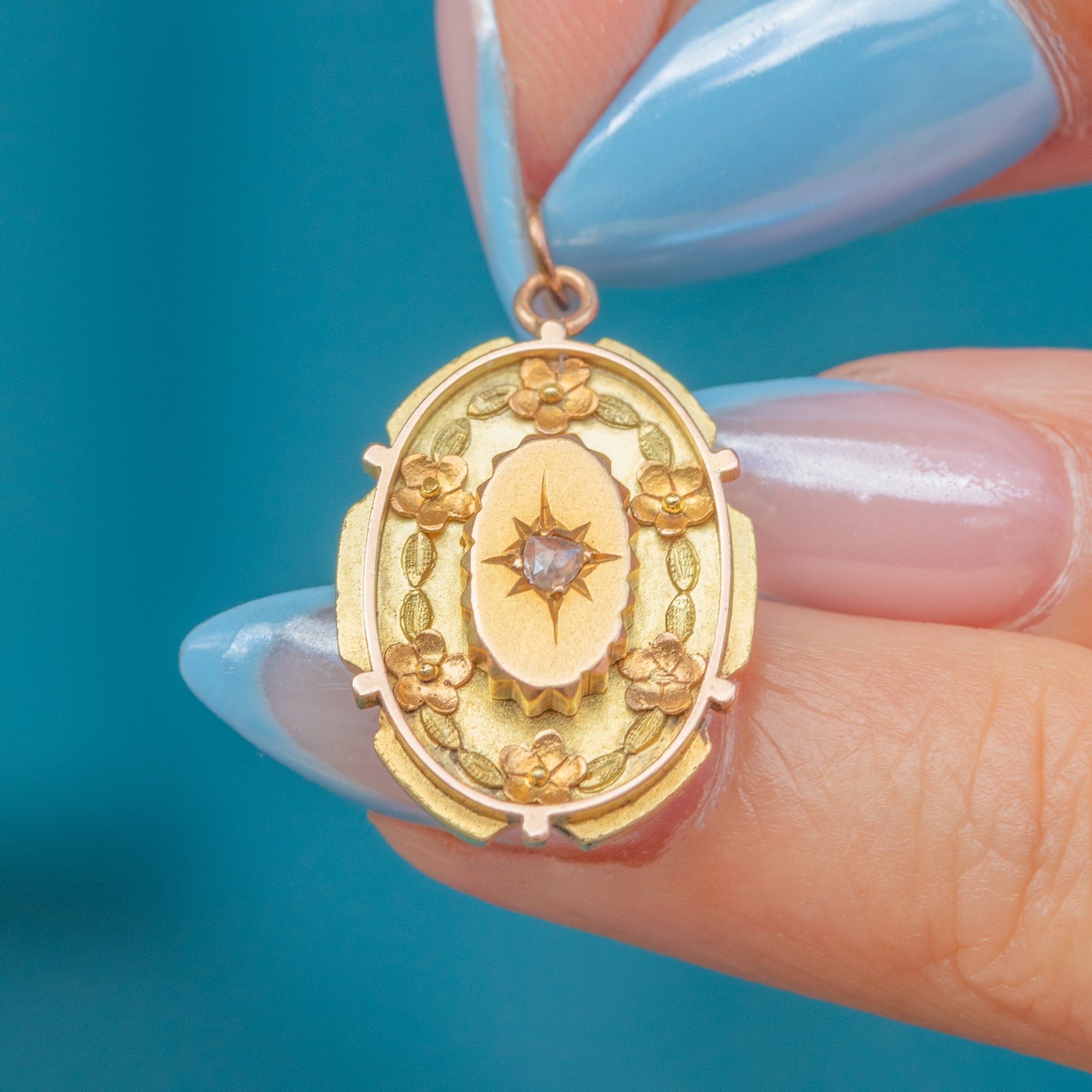 We love the detail of this Victorian 15ct Gold Diamond star set pendant! The centre of the piece has a distinct Etruscan revival design, further enhanced by floral accents that give this pendant a feminine edge.