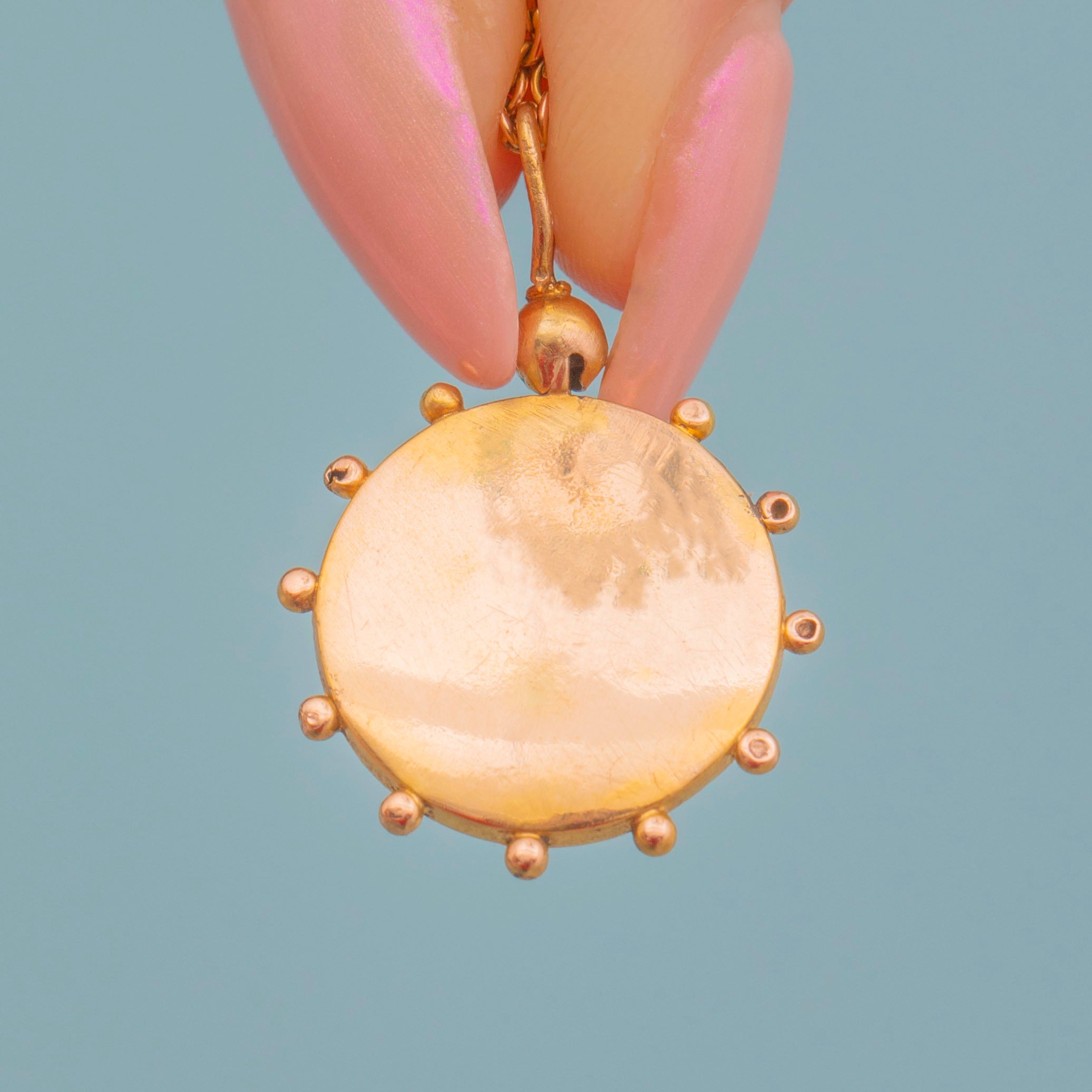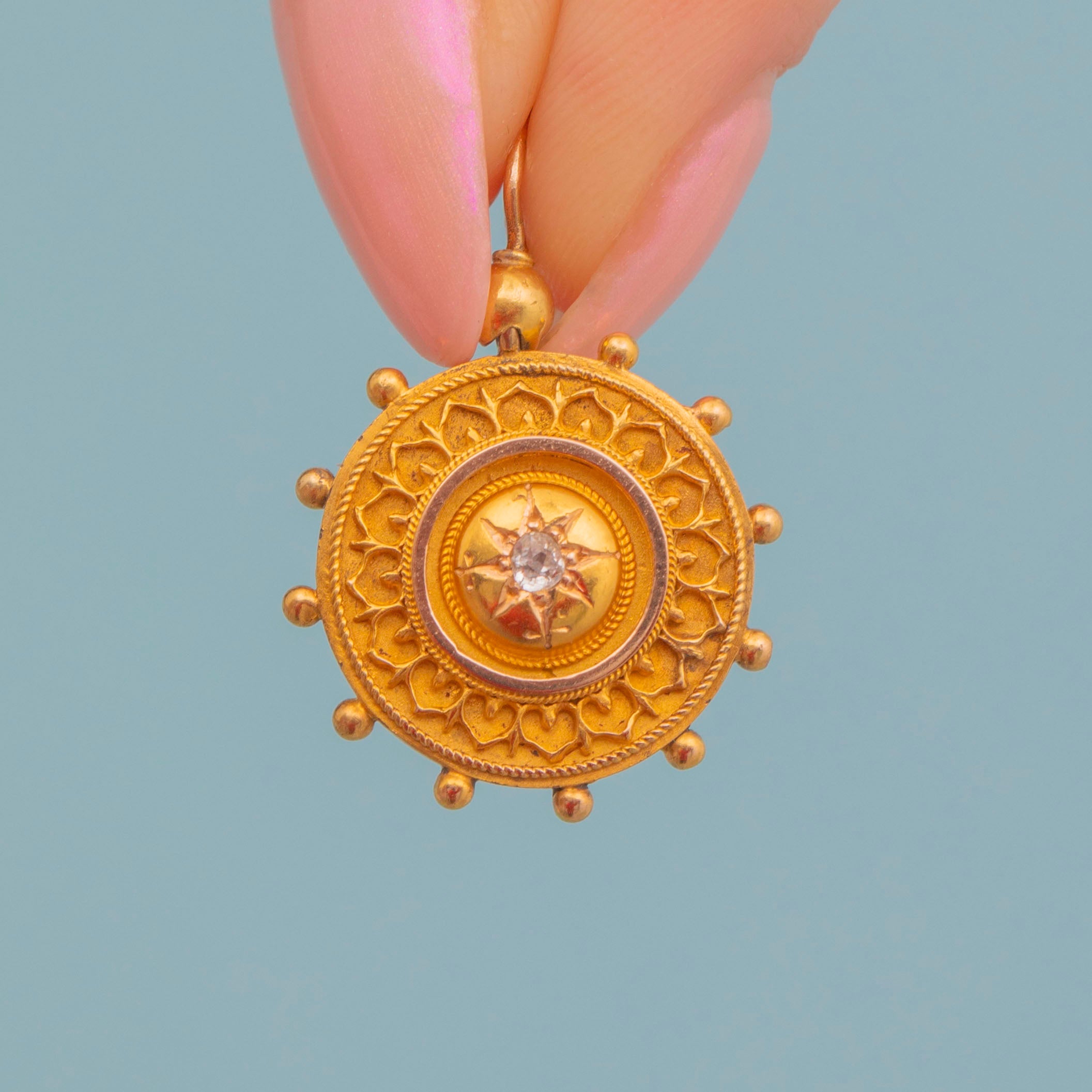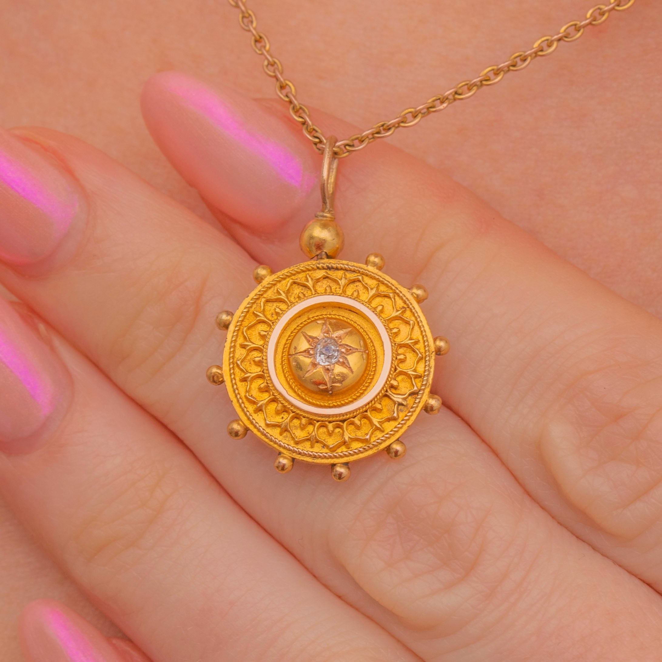 Add a touch of celestial charm to your collection with this Victorian 15ct Gold Etruscan Diamond disc pendant!