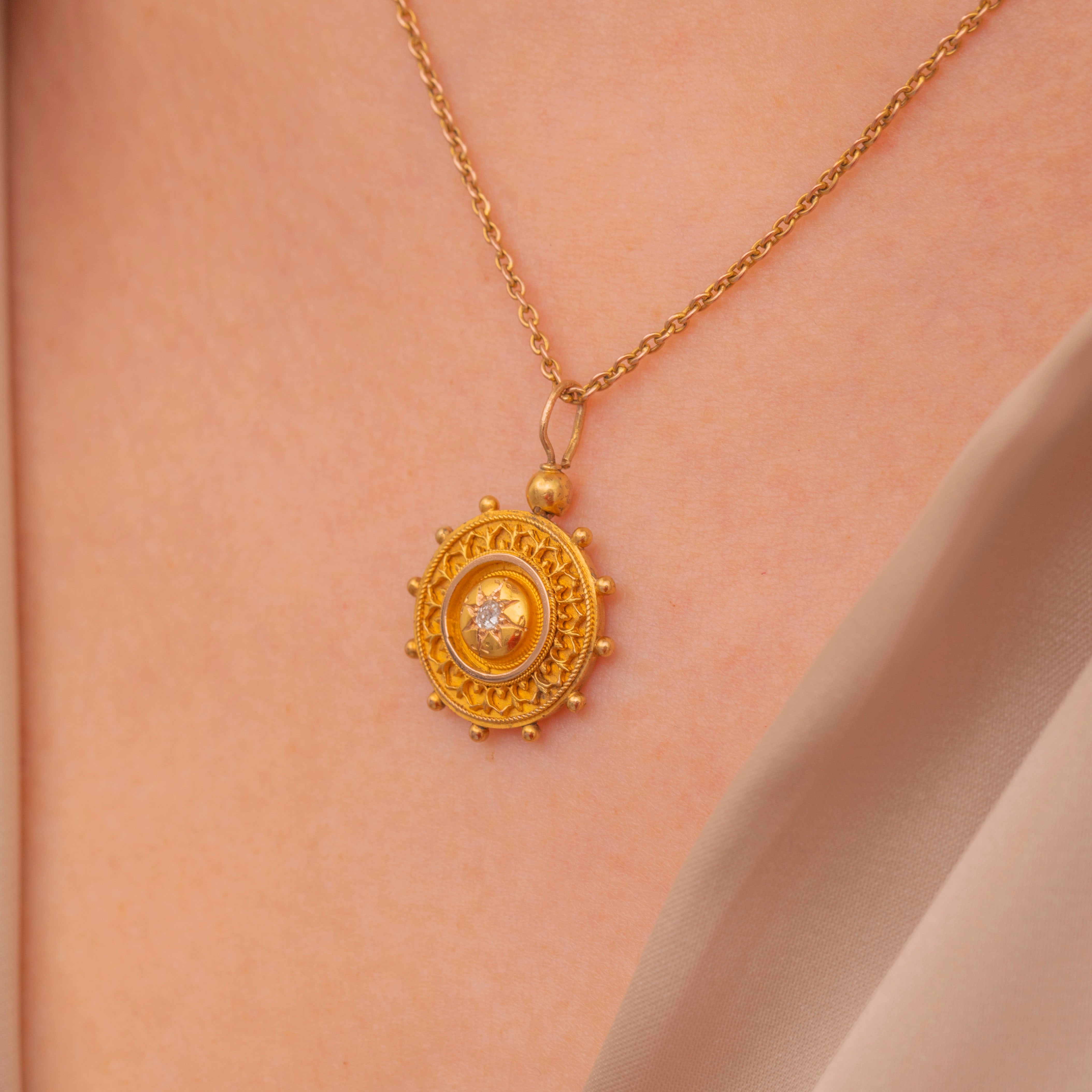EXCELLENT: This Victorian 15ct Gold Etruscan Diamond disc pendant is in very good condition. Her Diamond is securely set, and her Gold is lustrous. In excellent condition, she is a must have.