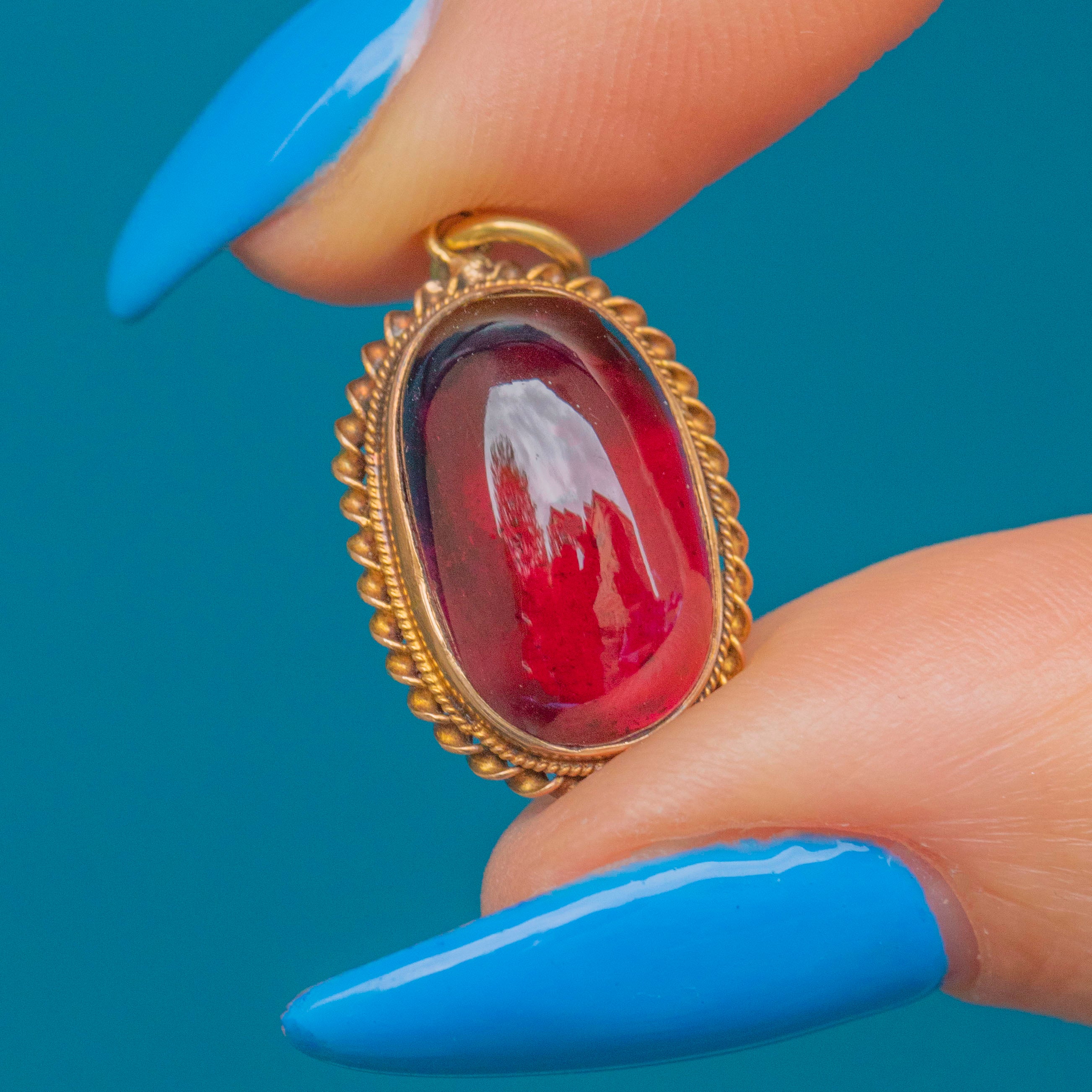 VERY GOOD. This Victorian 15ct Gold Garnet cabochon pendant is in very good condition. Her Garnet cabochon sits securely in a Gold bezel, boasting a wonderful domed profile and fiery rouge hues. We adore the chunky twisted rope border, giving her bundles of Victorian charm. There are a few minor dings on the back of the pendant, however, this can't be seen when worn so takes nothing away from her beauty. Her 9ct Gold closed back is glossy and smooth to the touch.