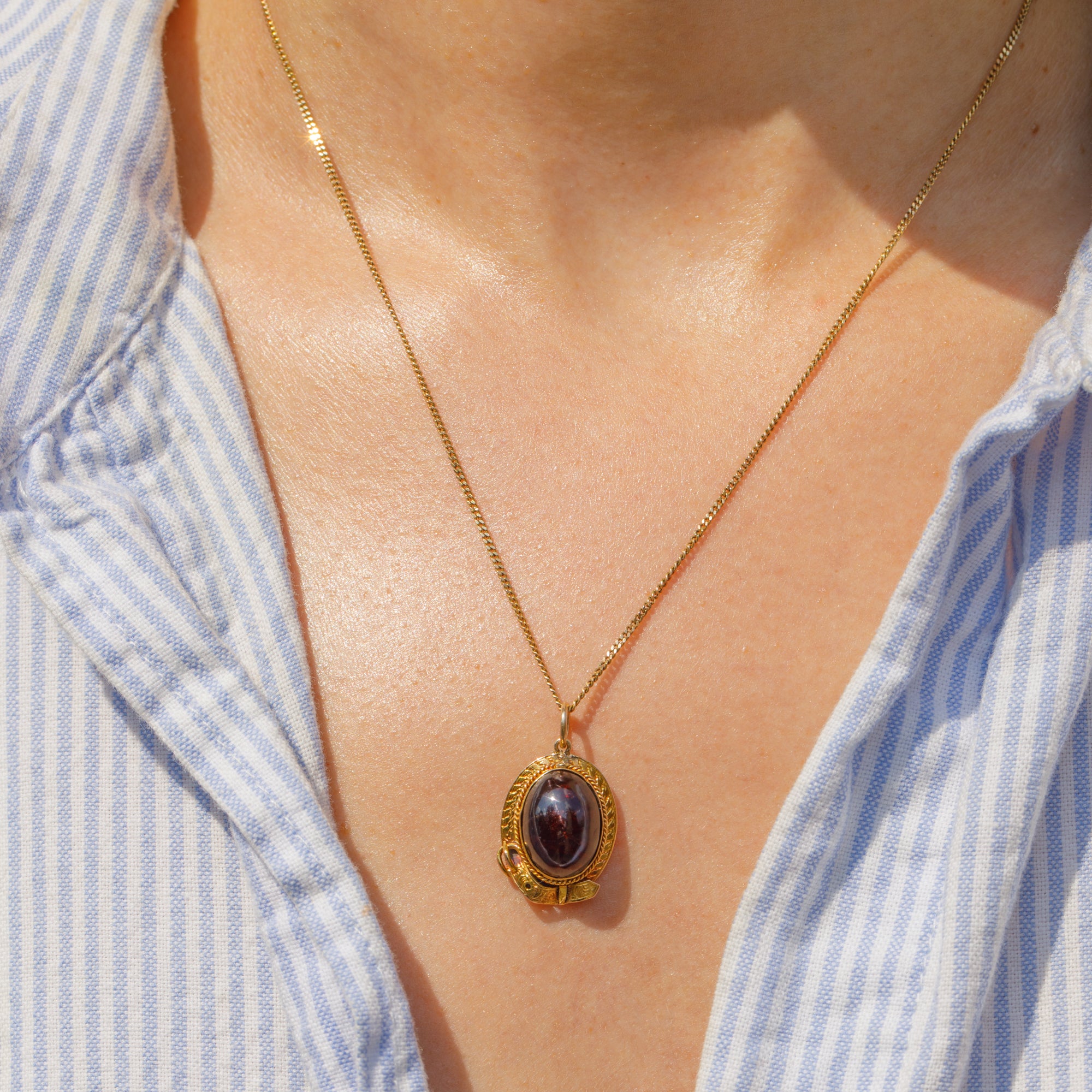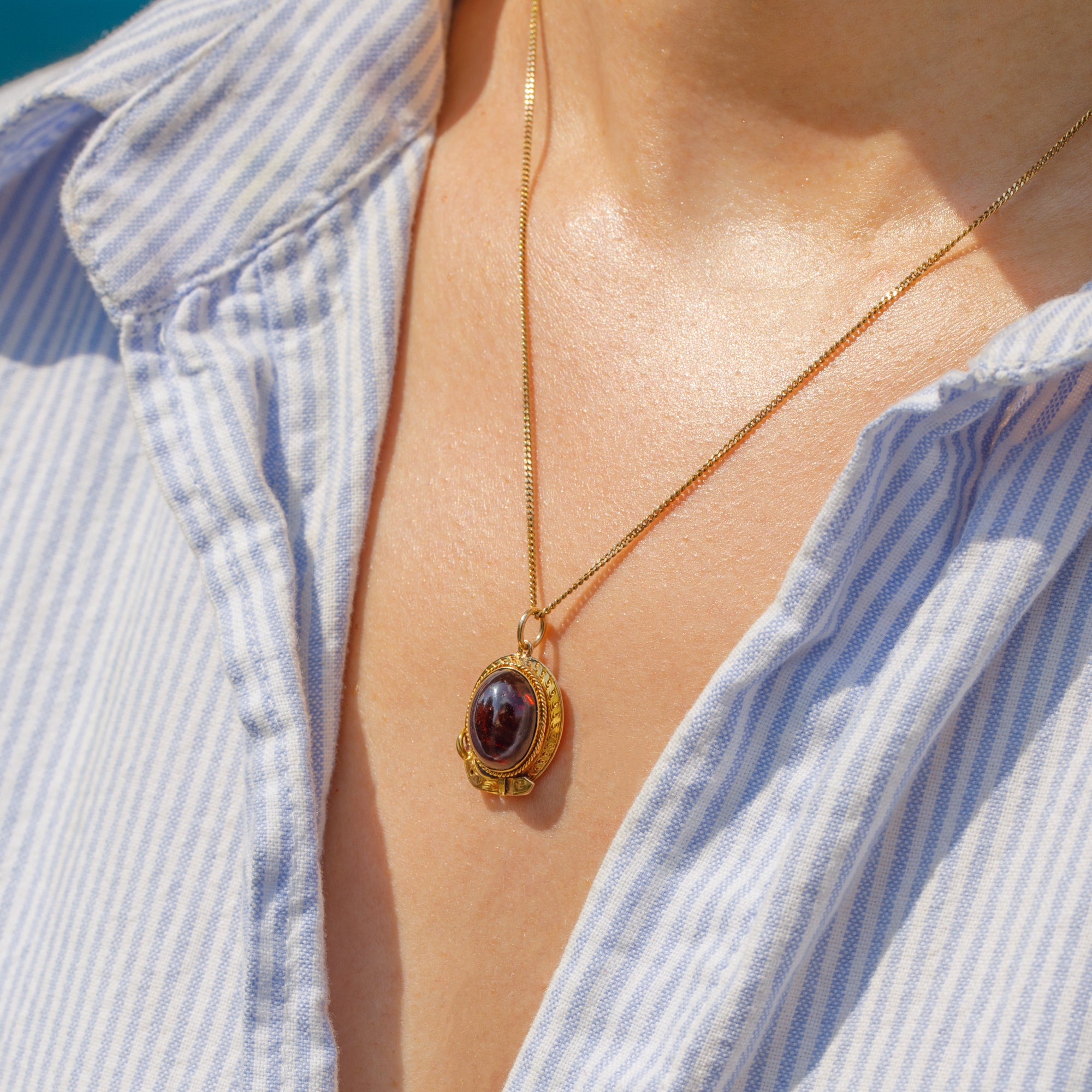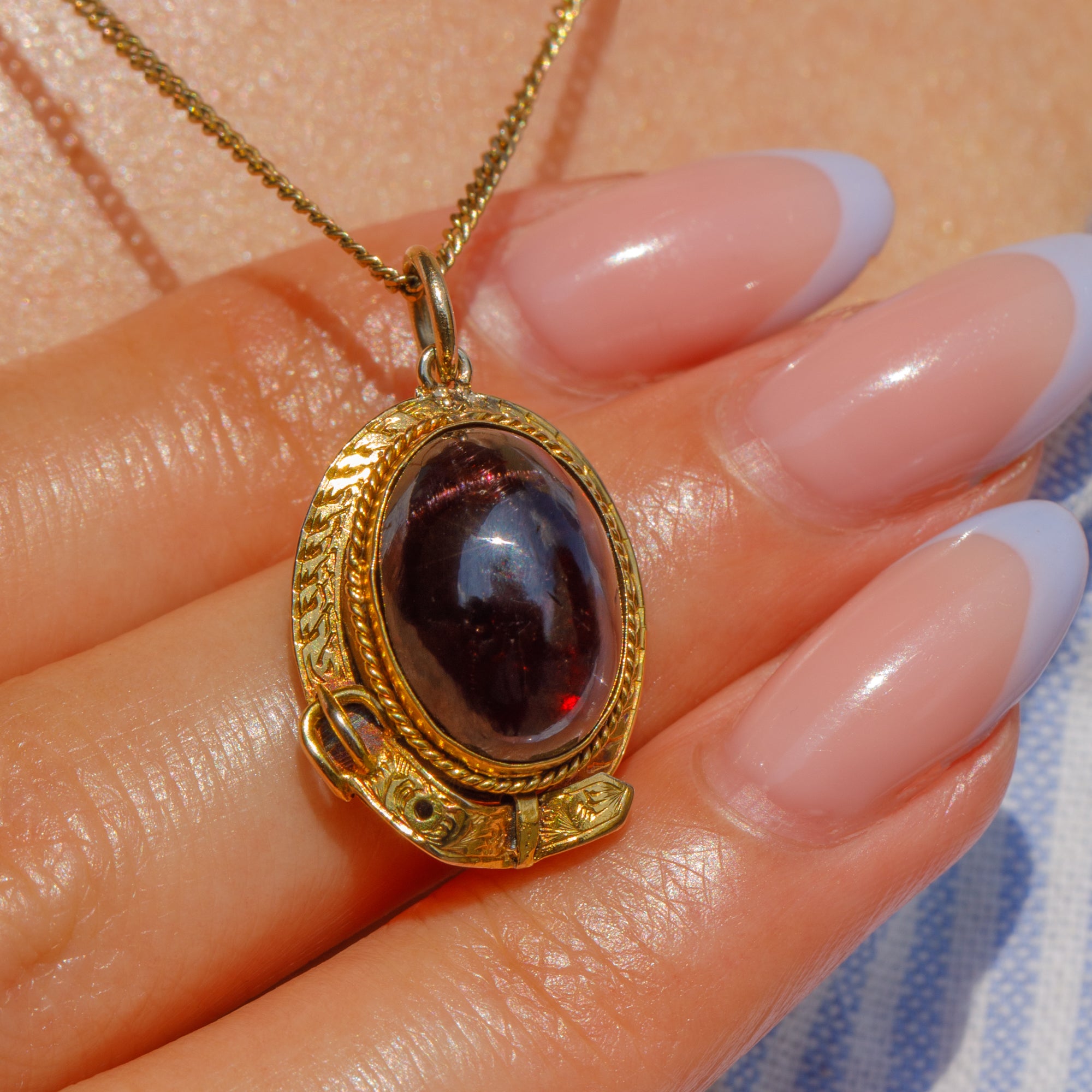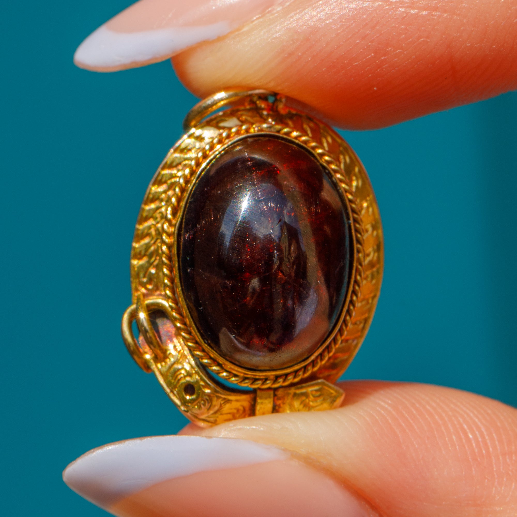 Boasting a plump 6.40ct sangria-hued Garnet cabochon in her centre, this Victorian charm is a wonderful option to add a pop of colour to your attire. She is encircled by a buttery 15ct Gold bezel and complete with an adorable buckle motif - such a unique and charming feature!