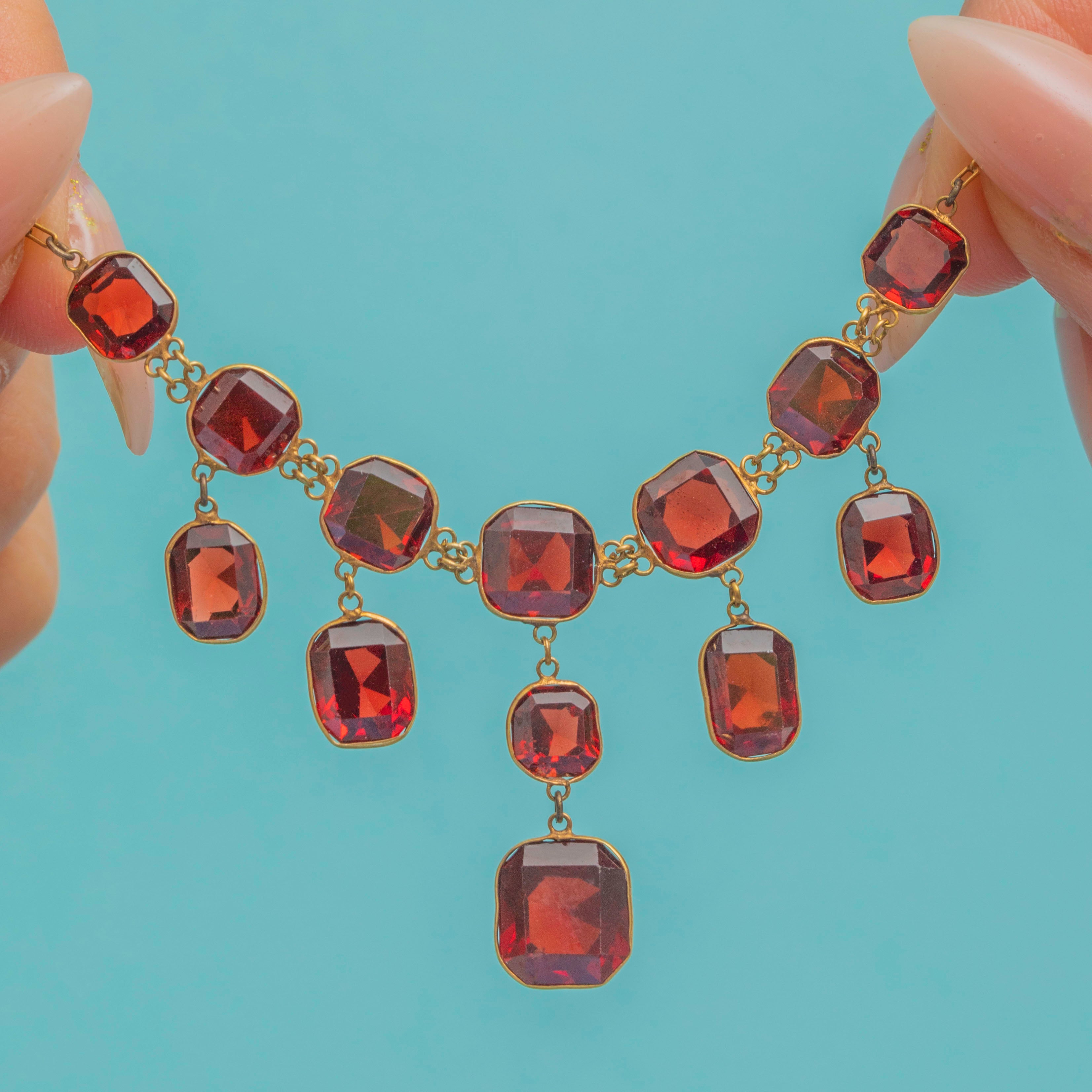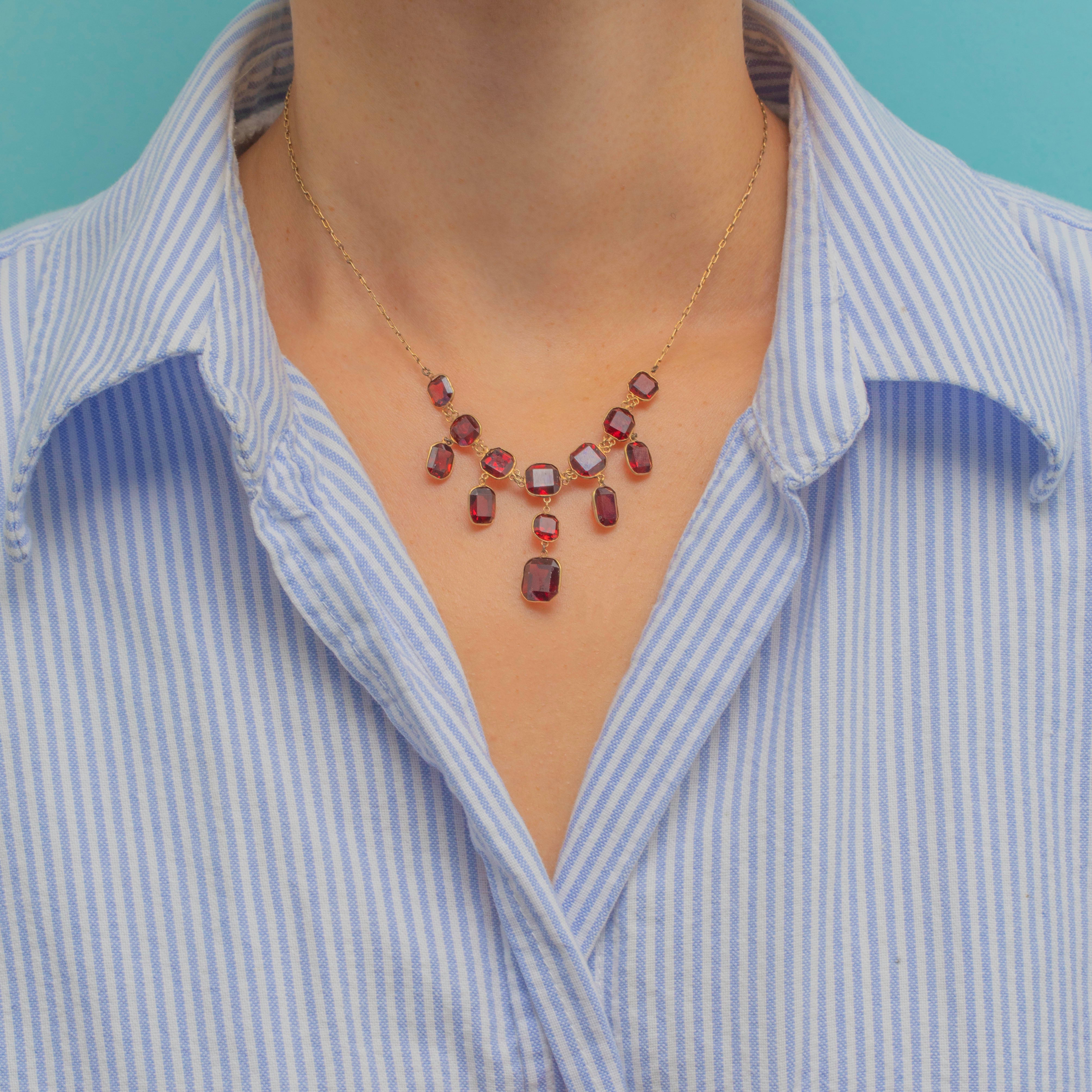 This exquisite Victorian necklace is a drop of rich Garnets, graduating in size to form a glowing river of deep red around the neckline. Crafted in 15ct Gold, the vibrant faceted stones catch the light beautifully, radiating warmth and elegance.