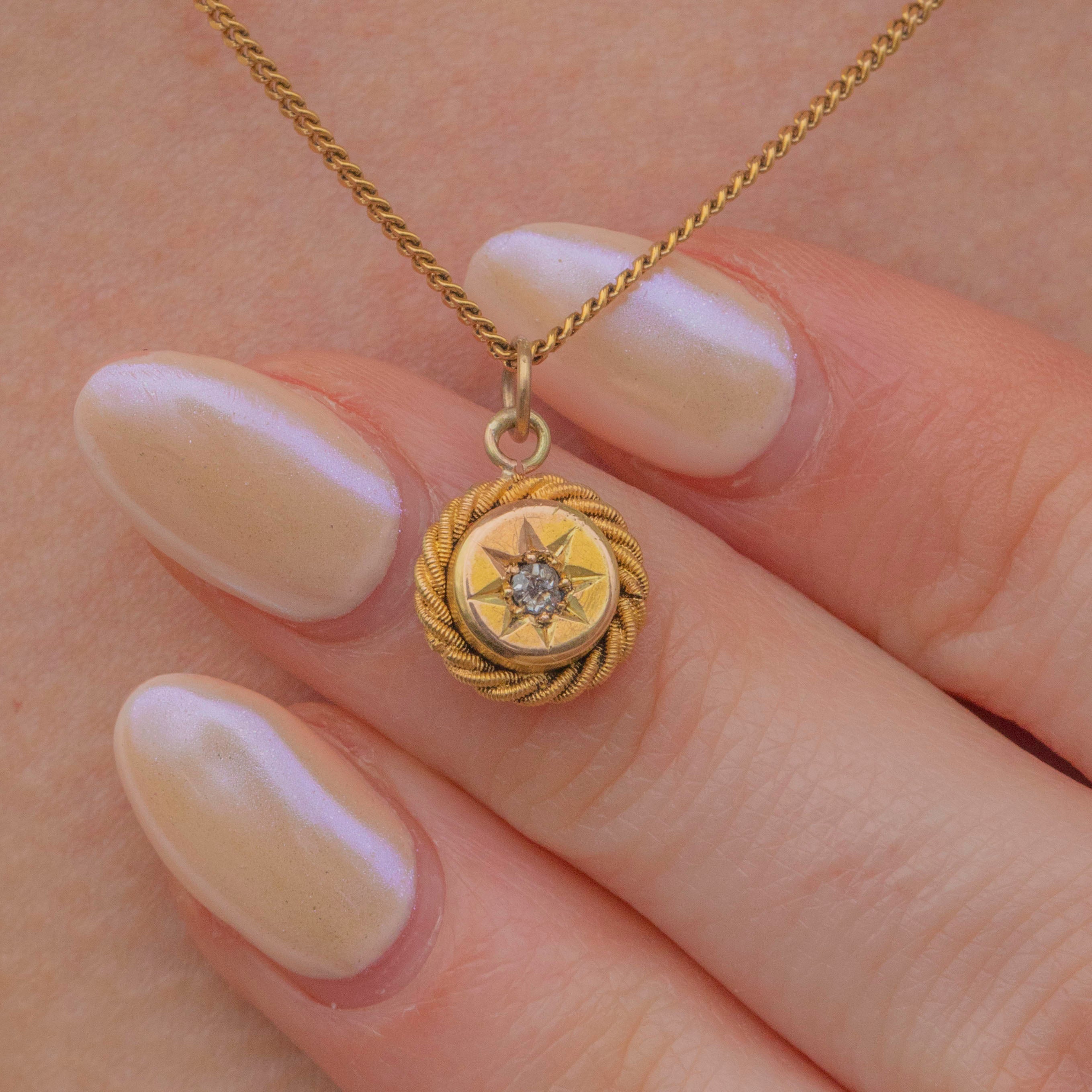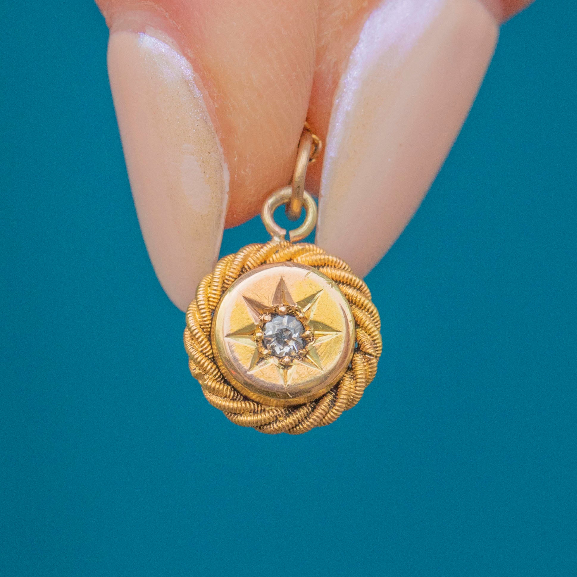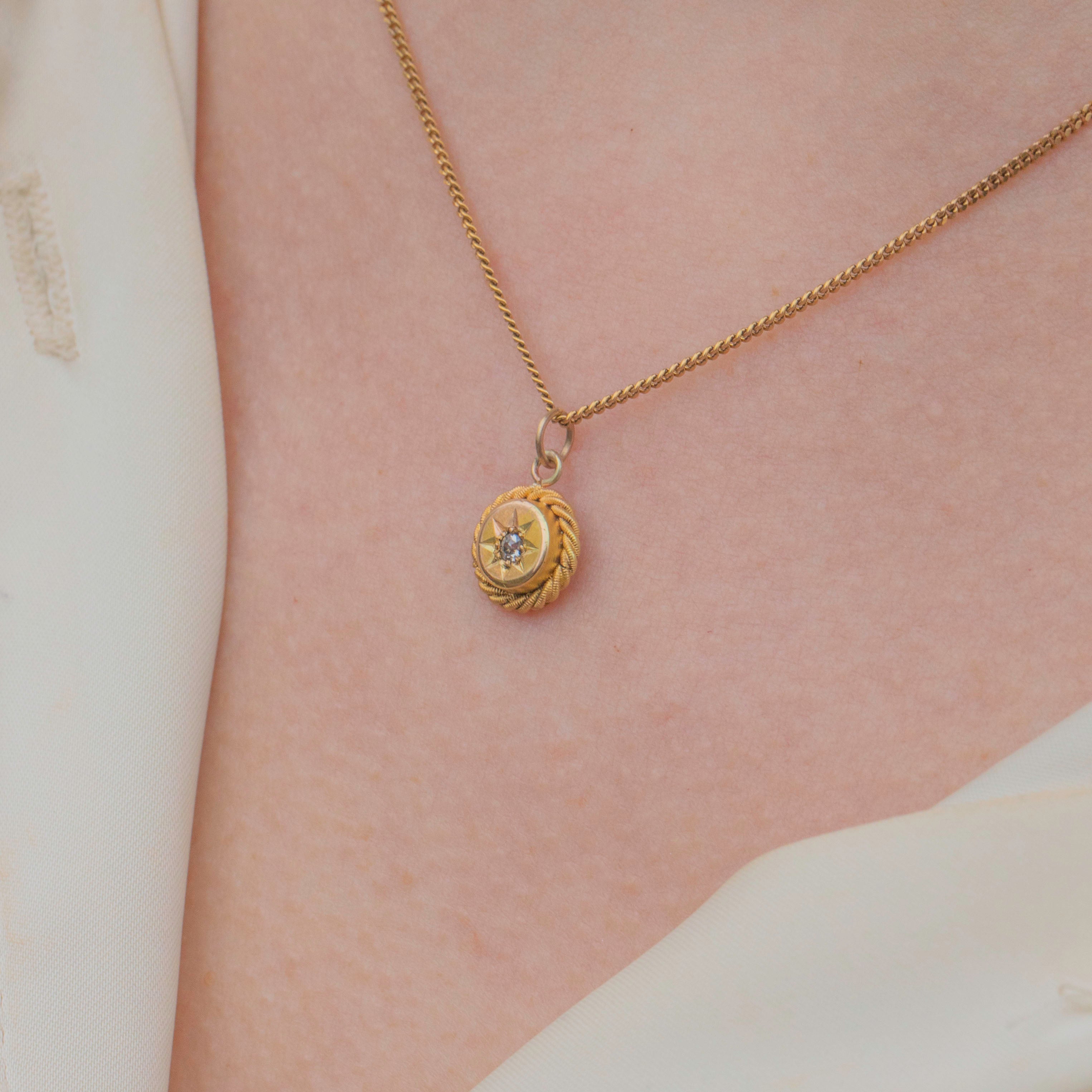 Crafted from buttery 15ct Gold, this Victorian charm showcases a star-set twinkling rose-cut Diamond at her centre, surrounded by an intricate rope border. This Etruscan beauty will look ethereal suspended from a dainty Gold chain adorning your décolletage!