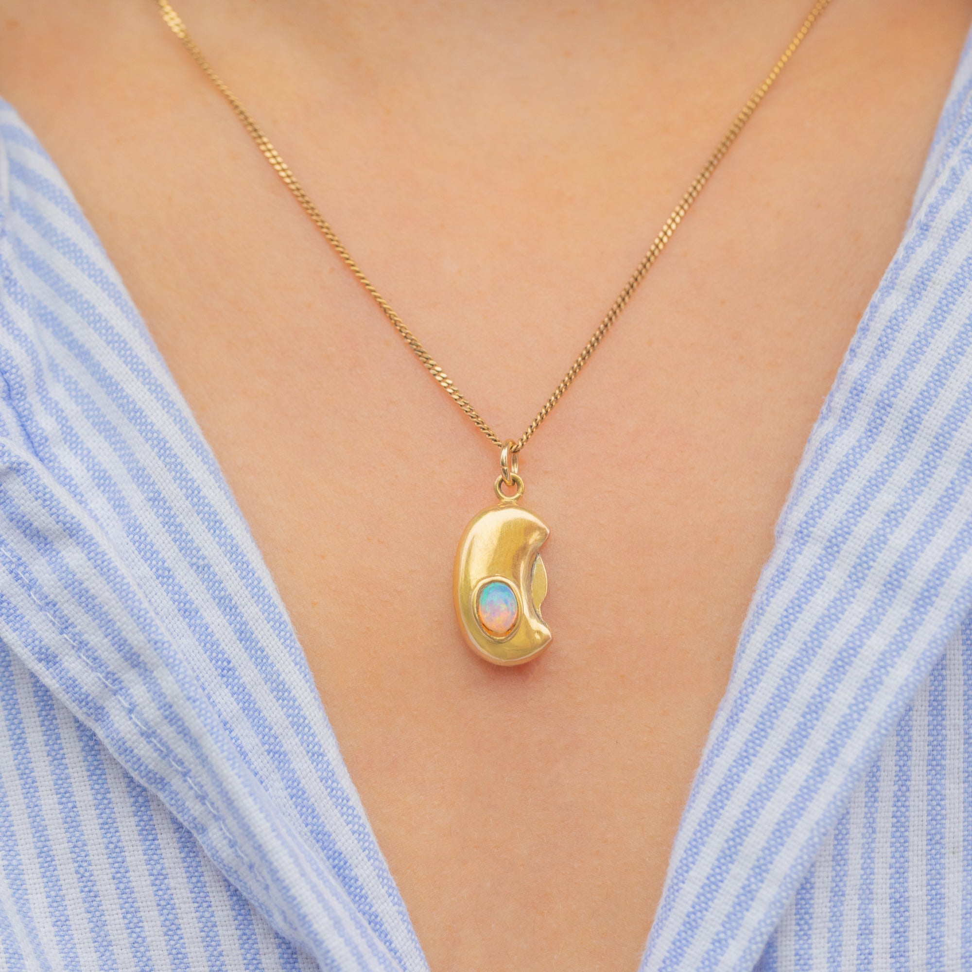 This charming Victorian bean pendant is crafted in warm 15ct Gold and set with a luminous Opal cabochon. The Opal flashes with subtle iridescence, adding a delightful pop of colour against the rich Gold.