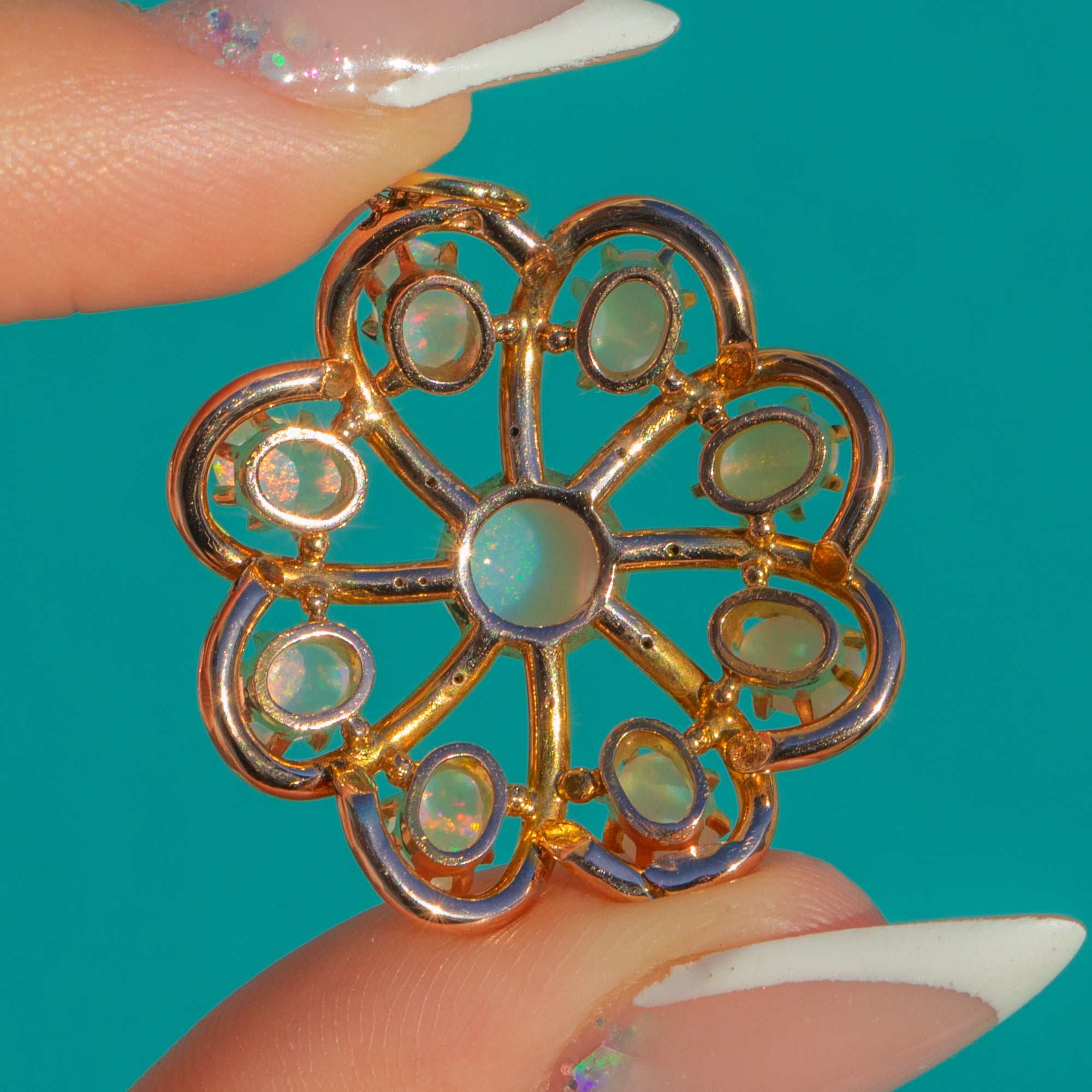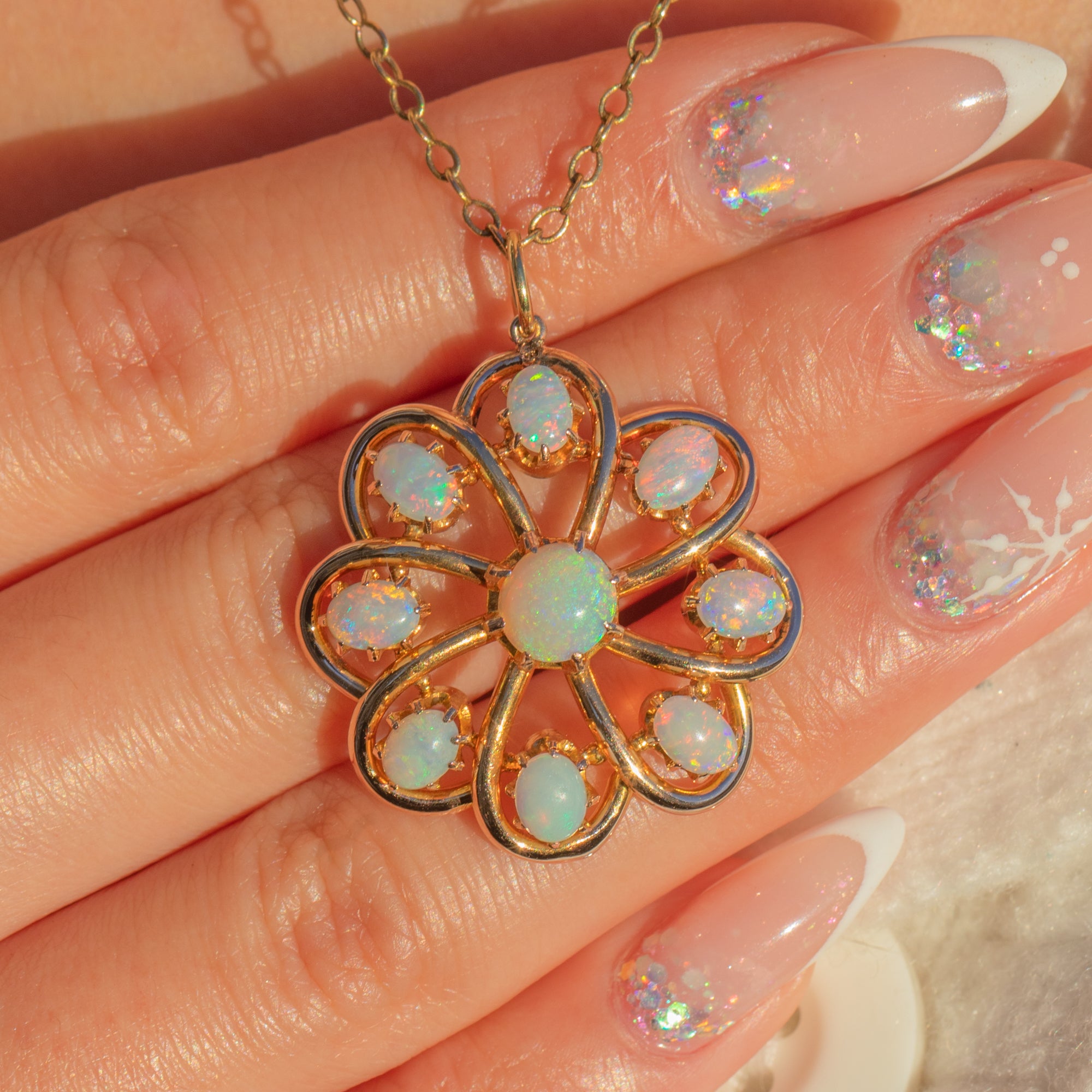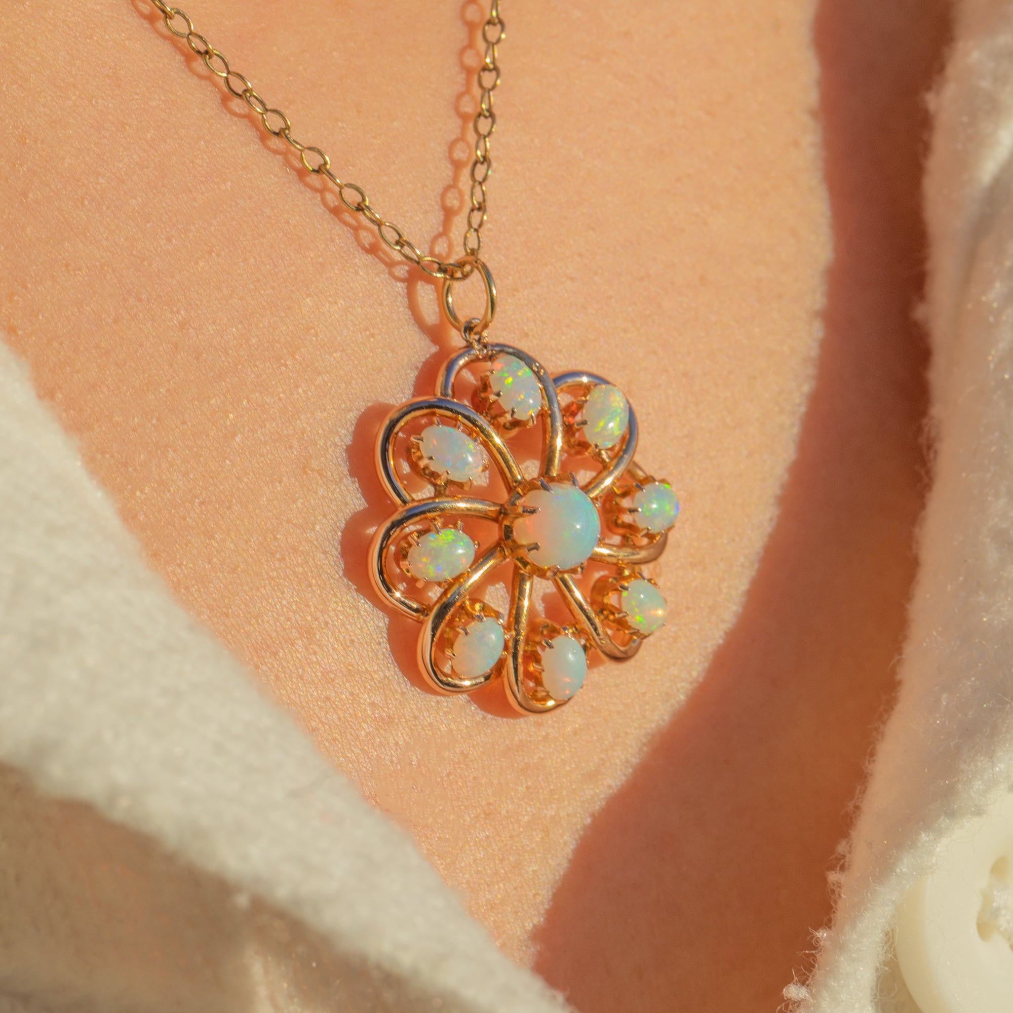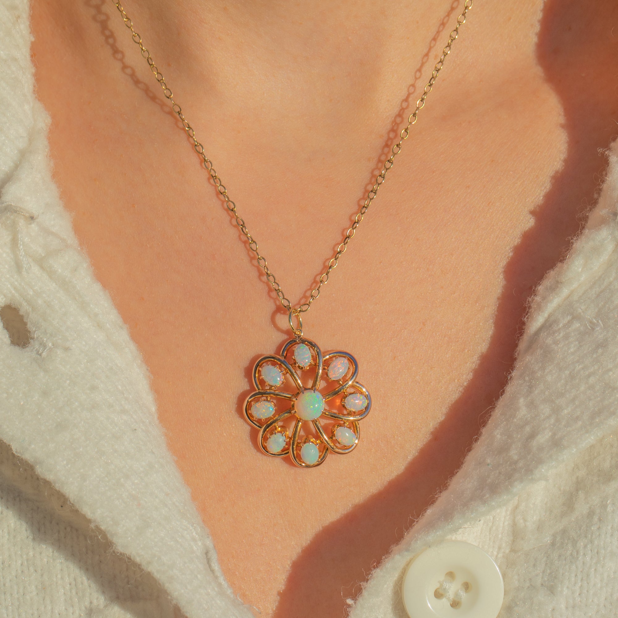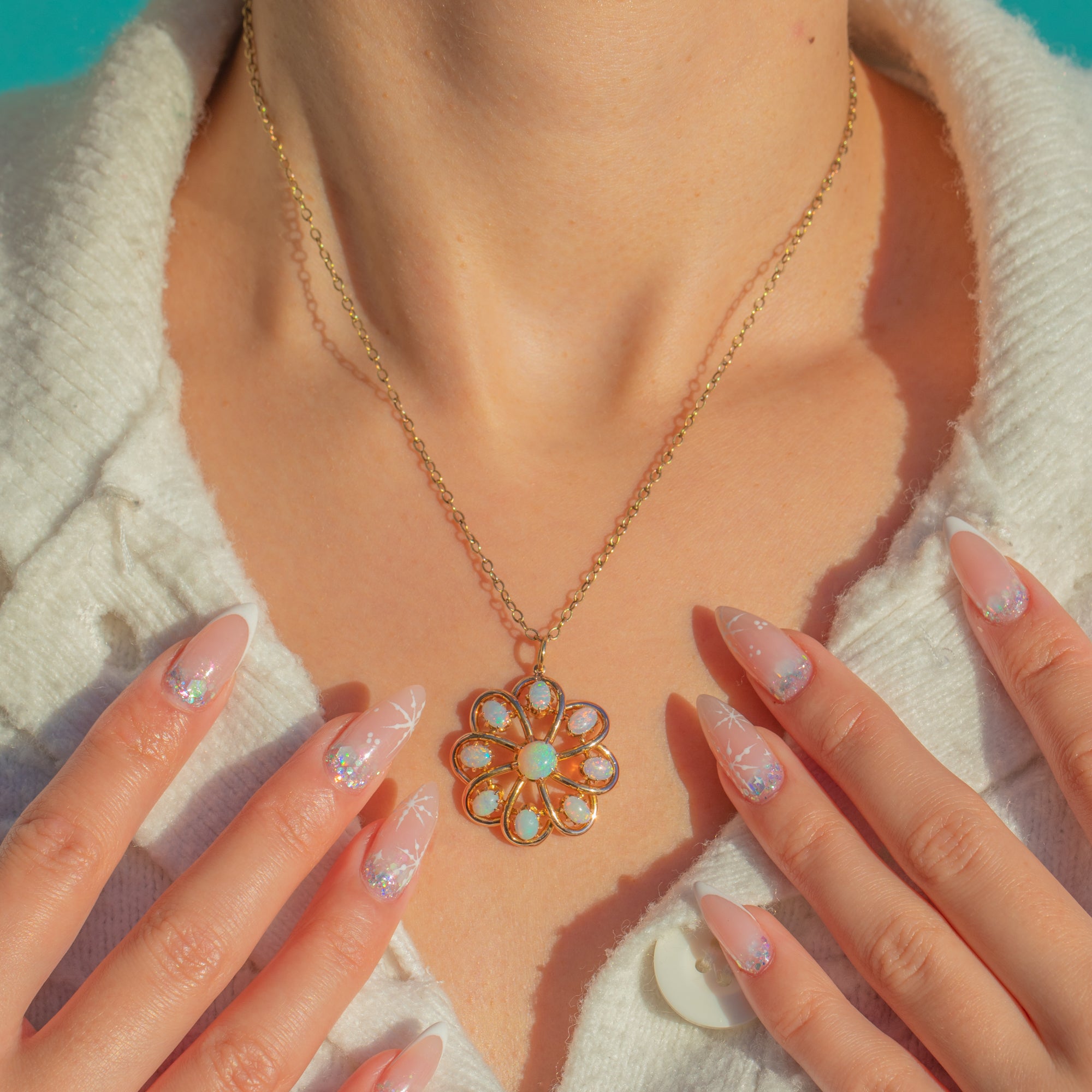 The central round Opal is framed by a halo of oval Opals, creating a pretty blossom effect that catches the light from every angle. With its warm antique Gold and delicate proportions, it’s perfect worn alone or layered with other favourite pieces.