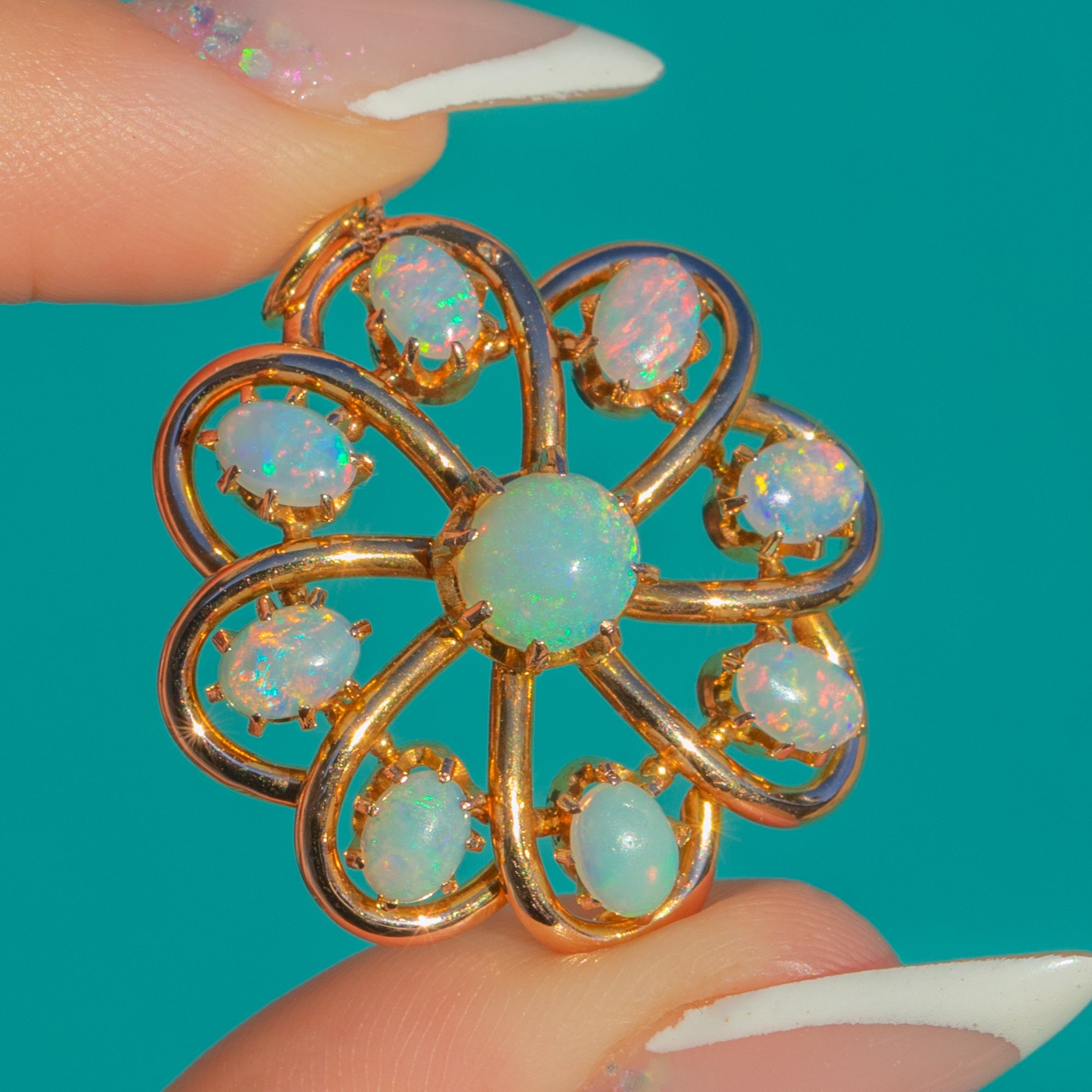 EXCELLENT: The Opals are bright and secure with no chips or cracks visible under close inspection. The Gold settings and jump ring are in lovely condition with only minimal wear in keeping with age. This pendant has been very well cared for and is ready to wear.