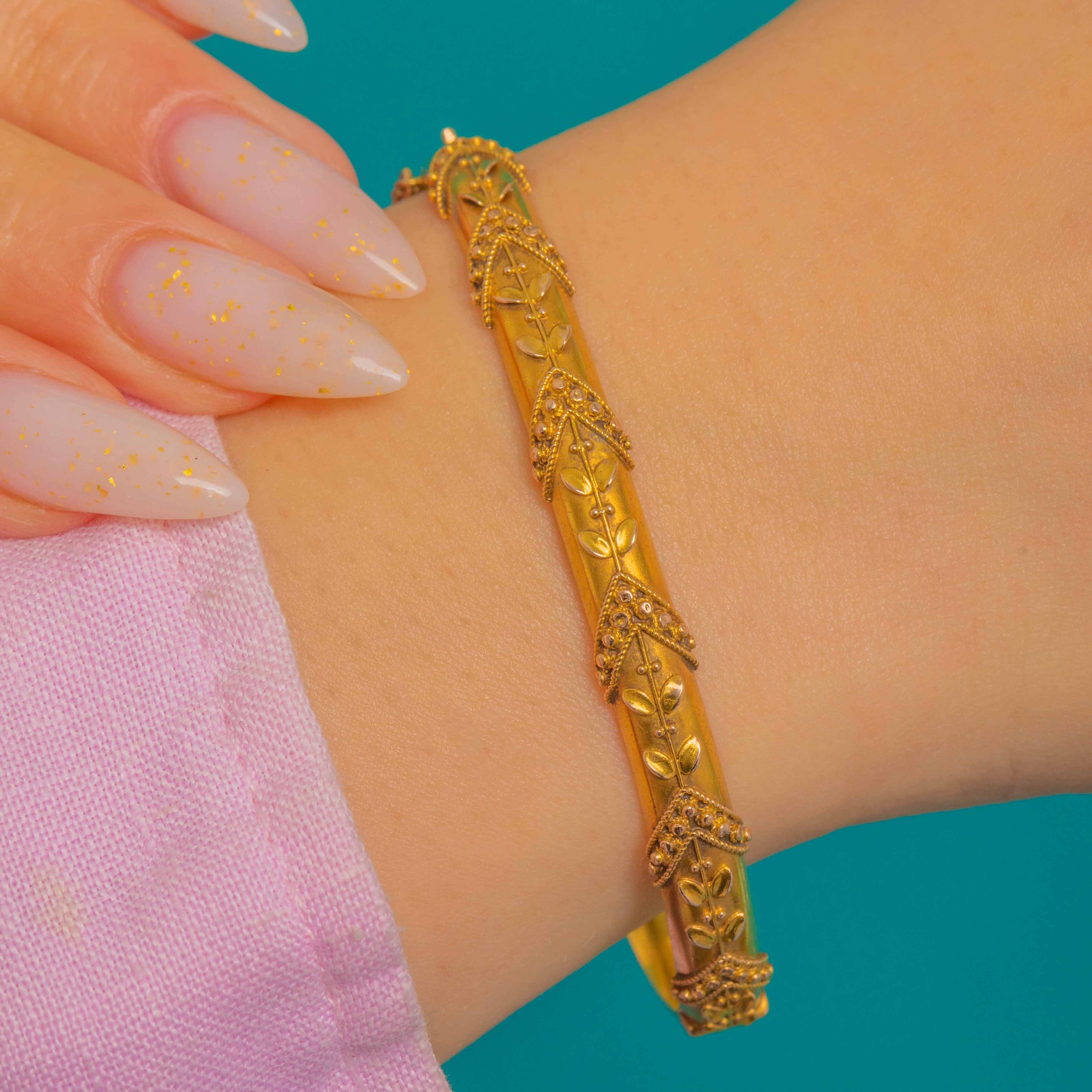 A refined Victorian hinged bangle in luminous 15ct Gold, beautifully ornamented with repeating chevron panels edged in delicate bead-like granulation and centred with graceful foliate sprigs. The softly matte, “bloomed” finish lends an elegant antique glow, capturing the Etruscan Revival aesthetic with poise and finesse.