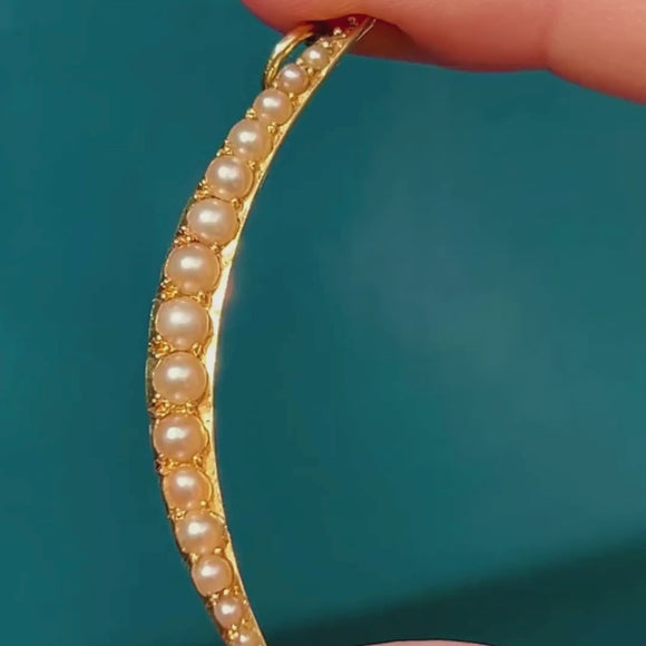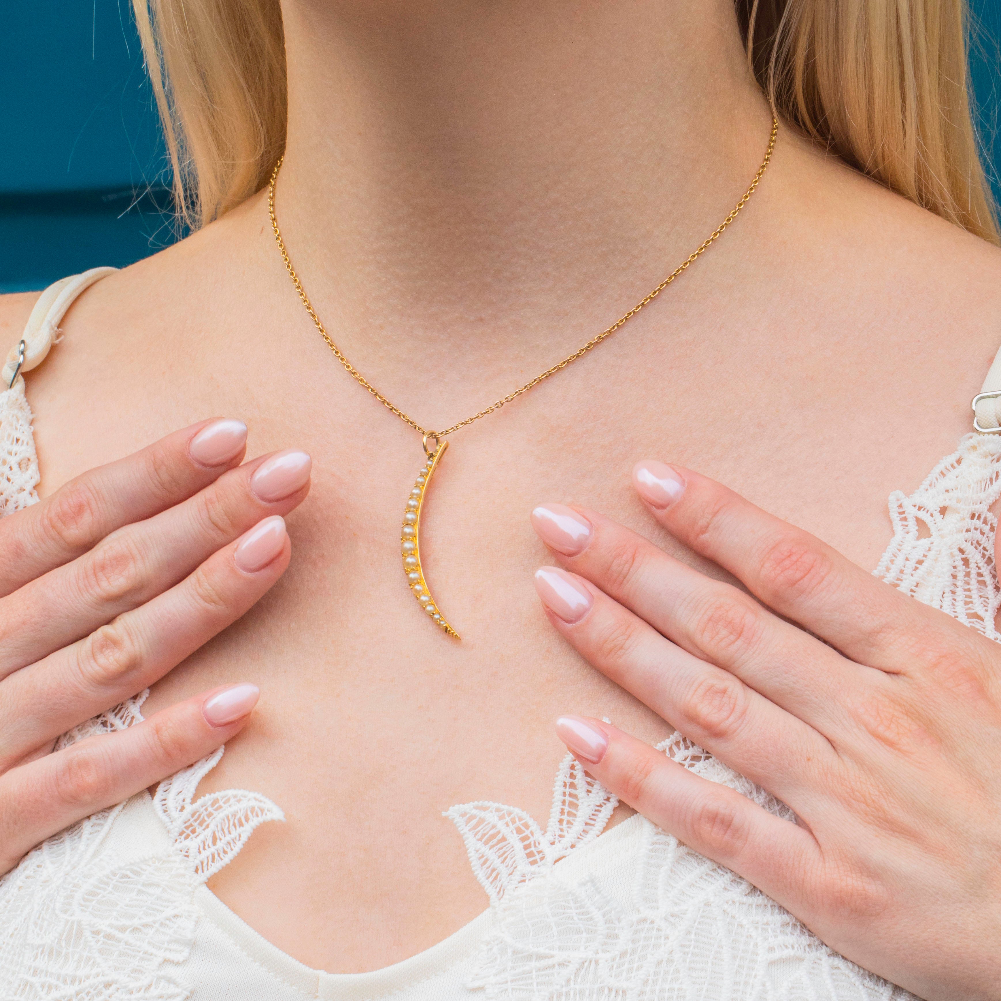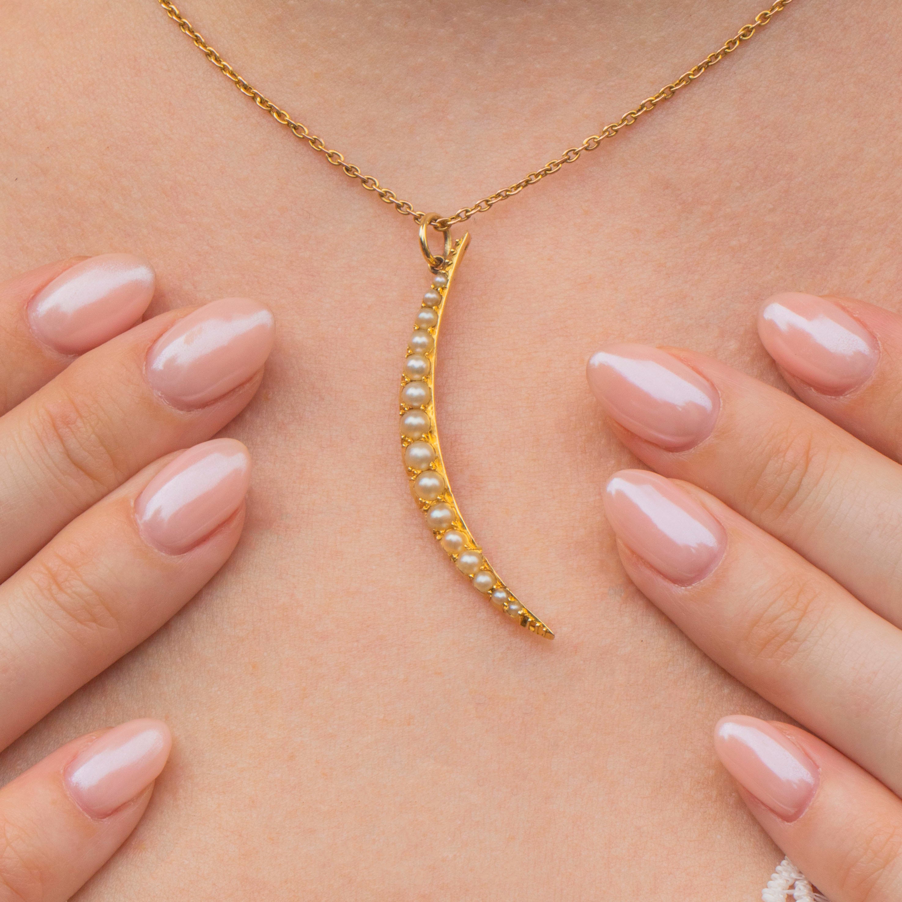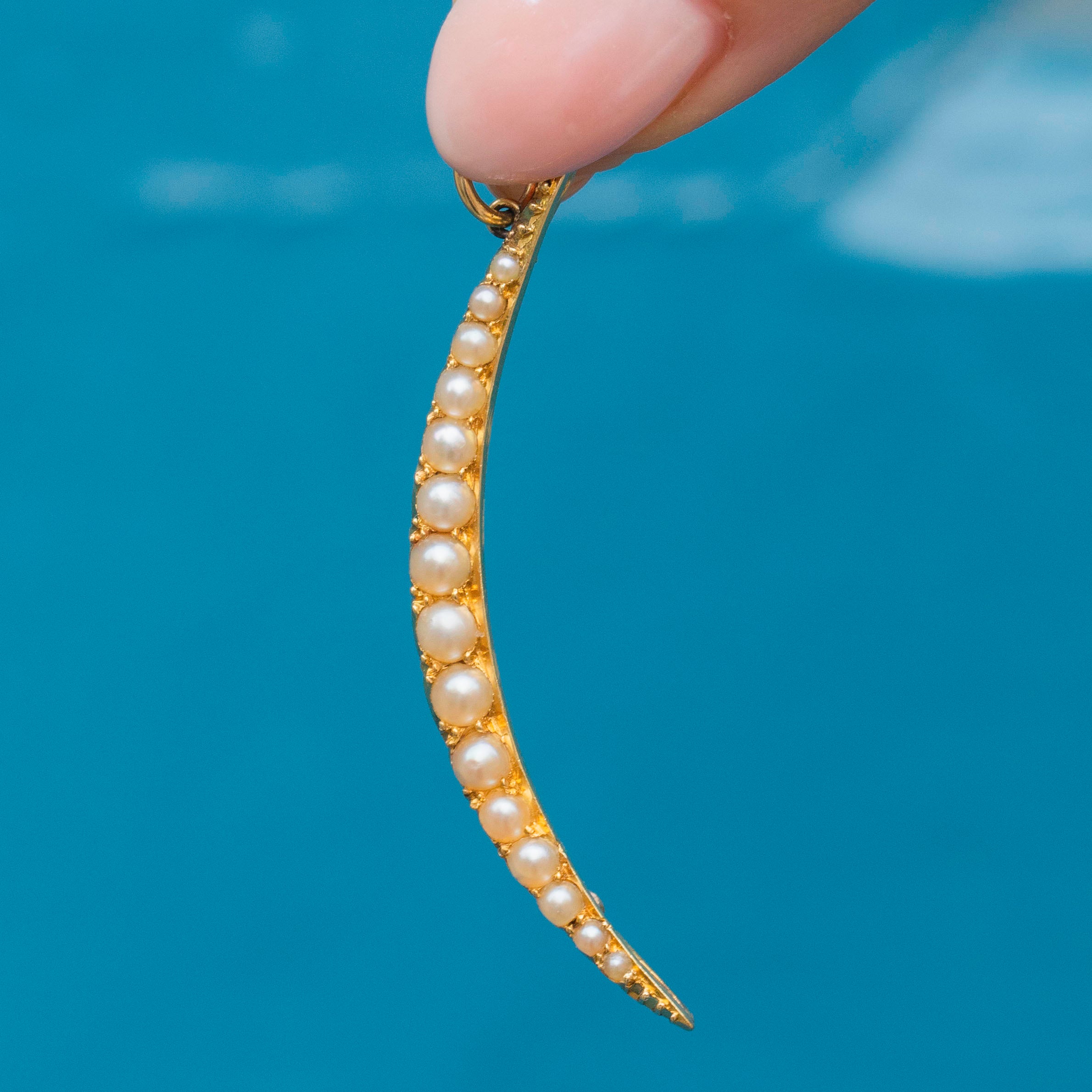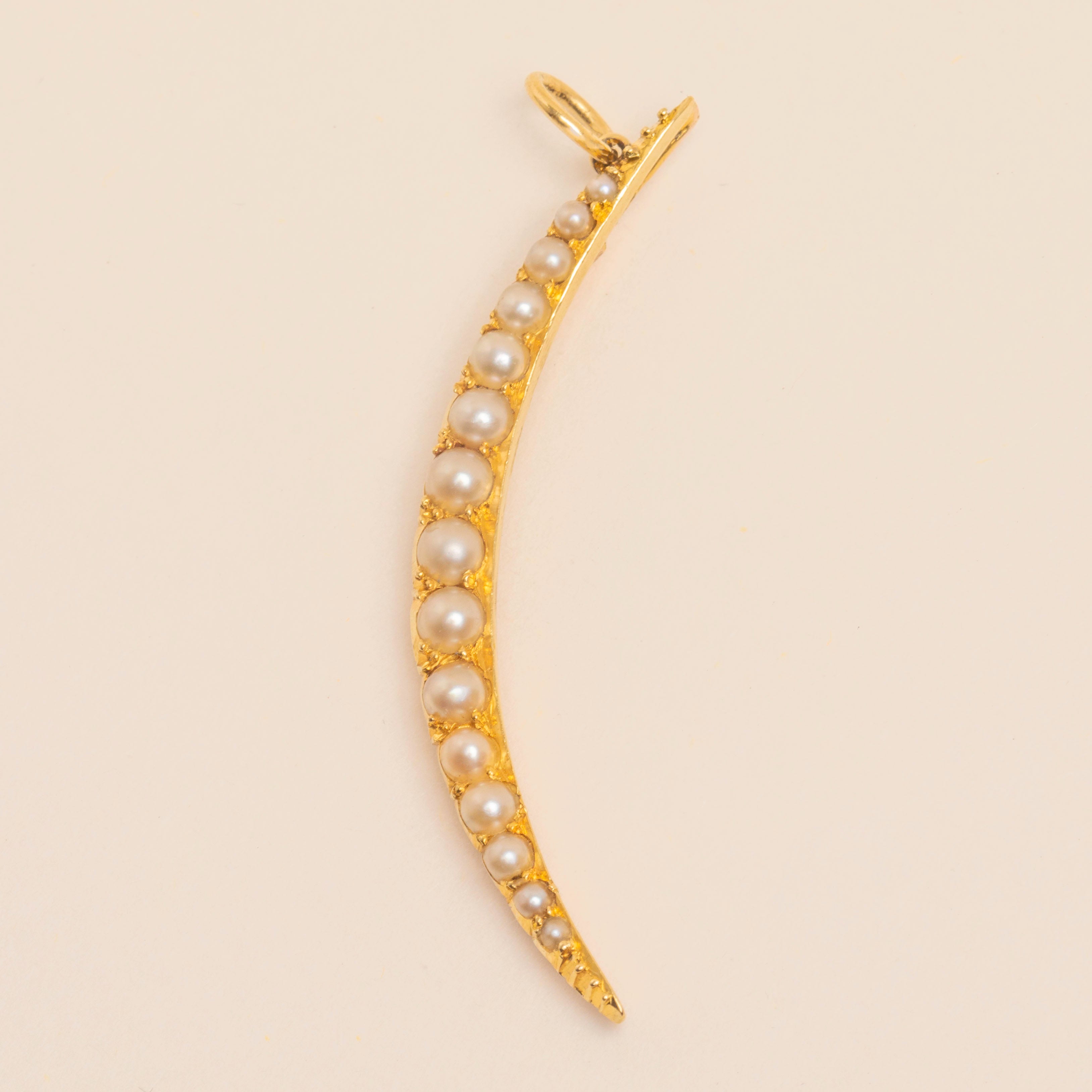 EXCELLENT. This Victorian 15ct Gold Pearl crescent moon pendant is in excellent condition throughout. The Pearls are all lustrous with their nacre fully intact, each one held securely in milgrain settings. The 15ct Gold is buttery and the crescent has retained its form beautifully over the years. A superb piece of Victorian jewellery ready to be adored for many more moons to come!
