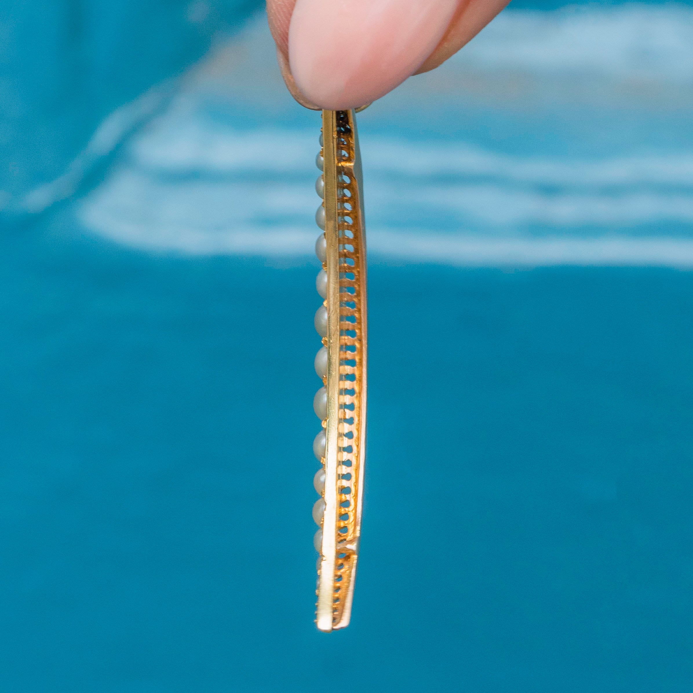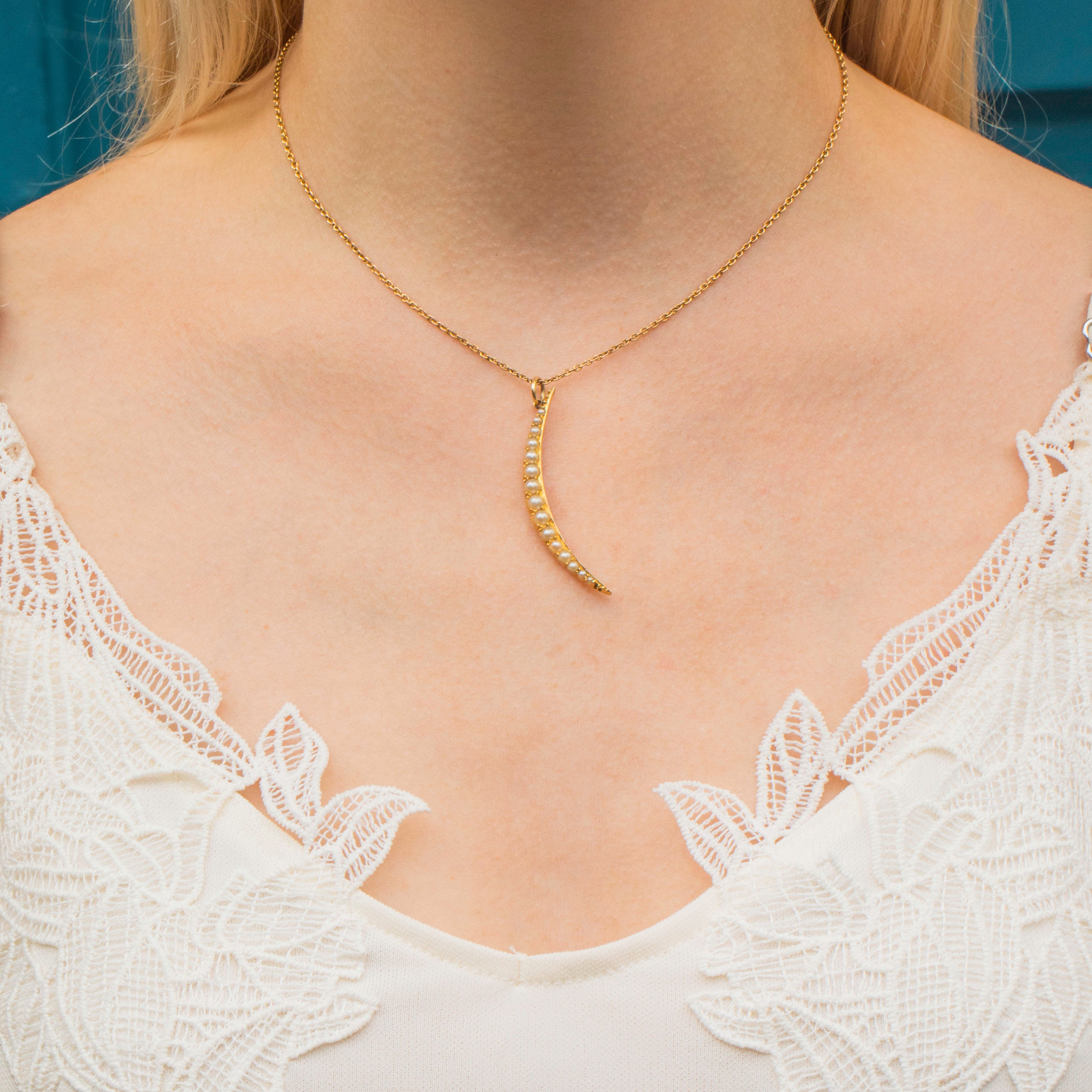 Add a touch of celestial charm to your décolletage with this striking Victorian 15ct Gold Pearl crescent moon pendant! A row of creamy Pearls adorn the curvaceous form of this antique crescent pendant, all held in decorative milgrain settings.