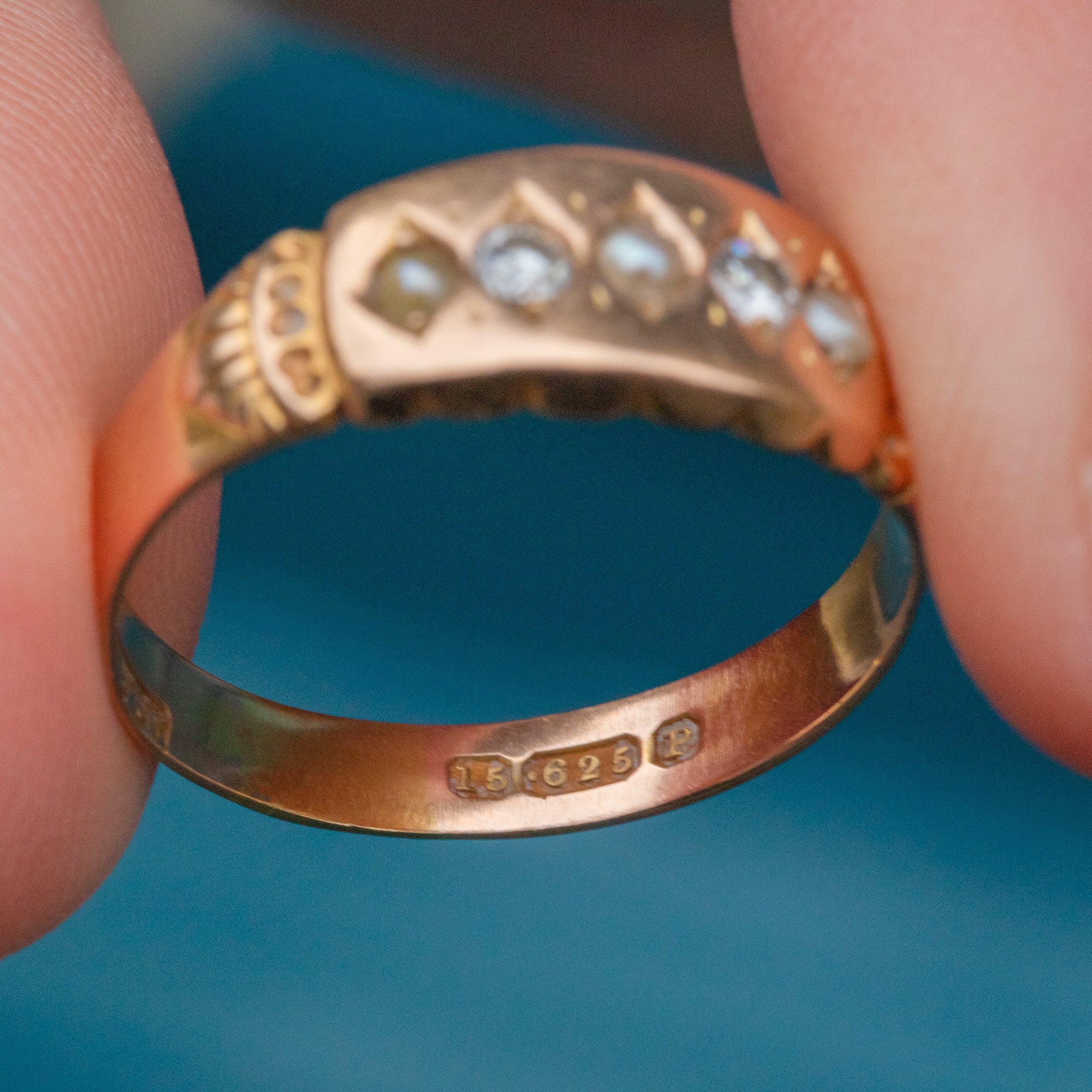 VERY GOOD. This Victorian 15ct Gold Pearl Diamond gypsy ring is in very good condition. Her gemstones are all perfectly secure in their settings and while one of the Pearls does have a tiny chip to her surface, this is hardly noticeable unless closely inspected under a loupe. Her luxurious 15ct is buttery and smooth and the hallmarks have remained crisp and legible, allowing us to accurately date it to 1864