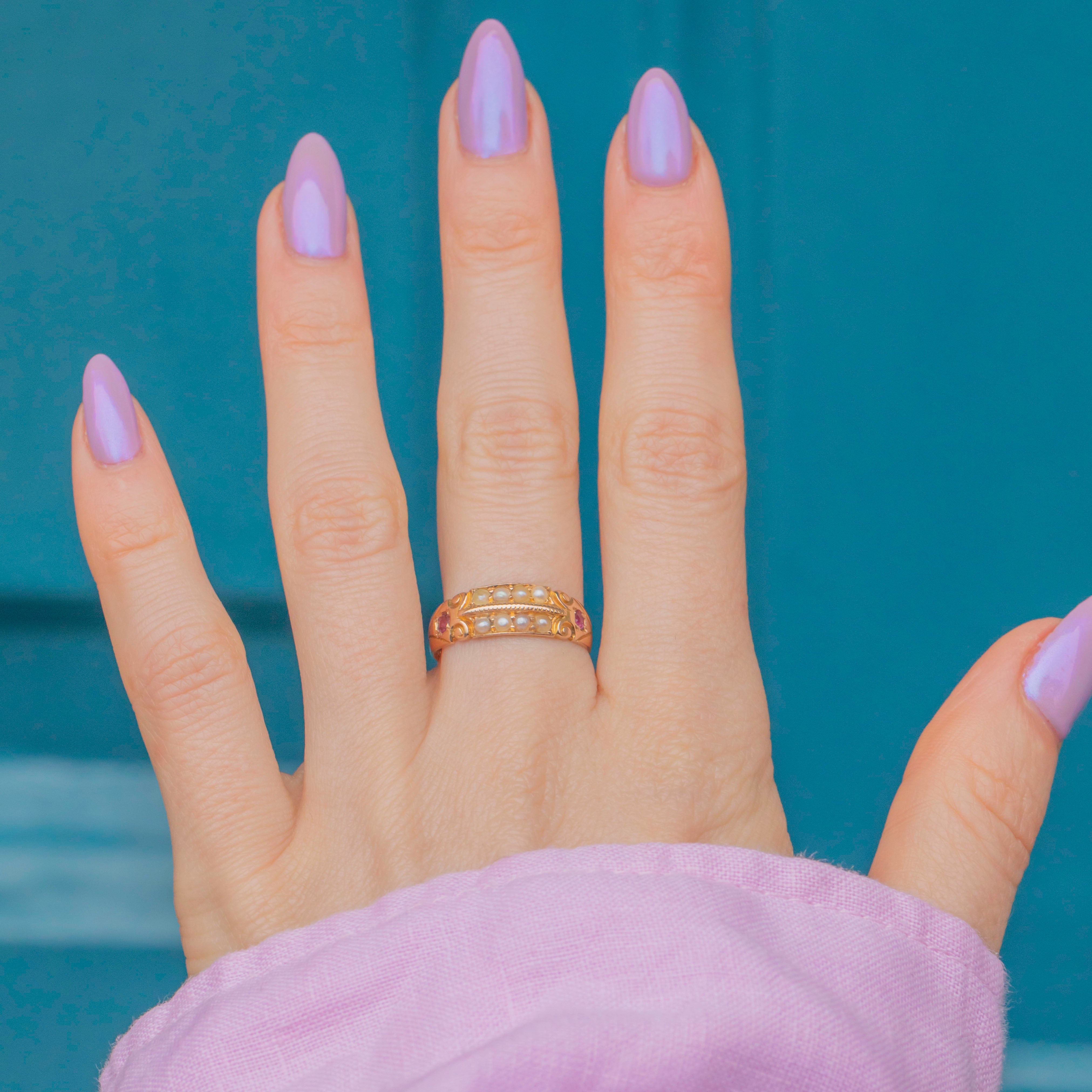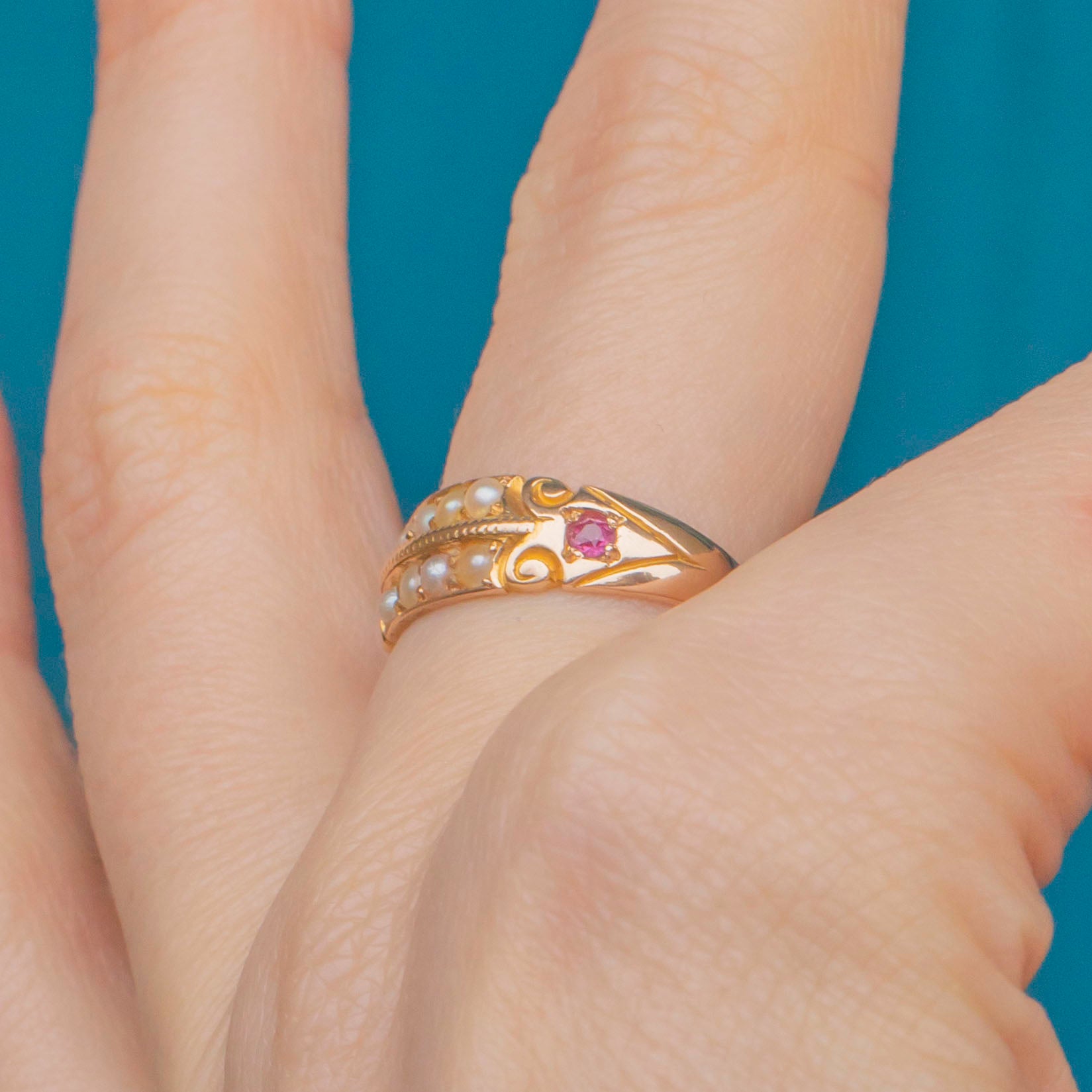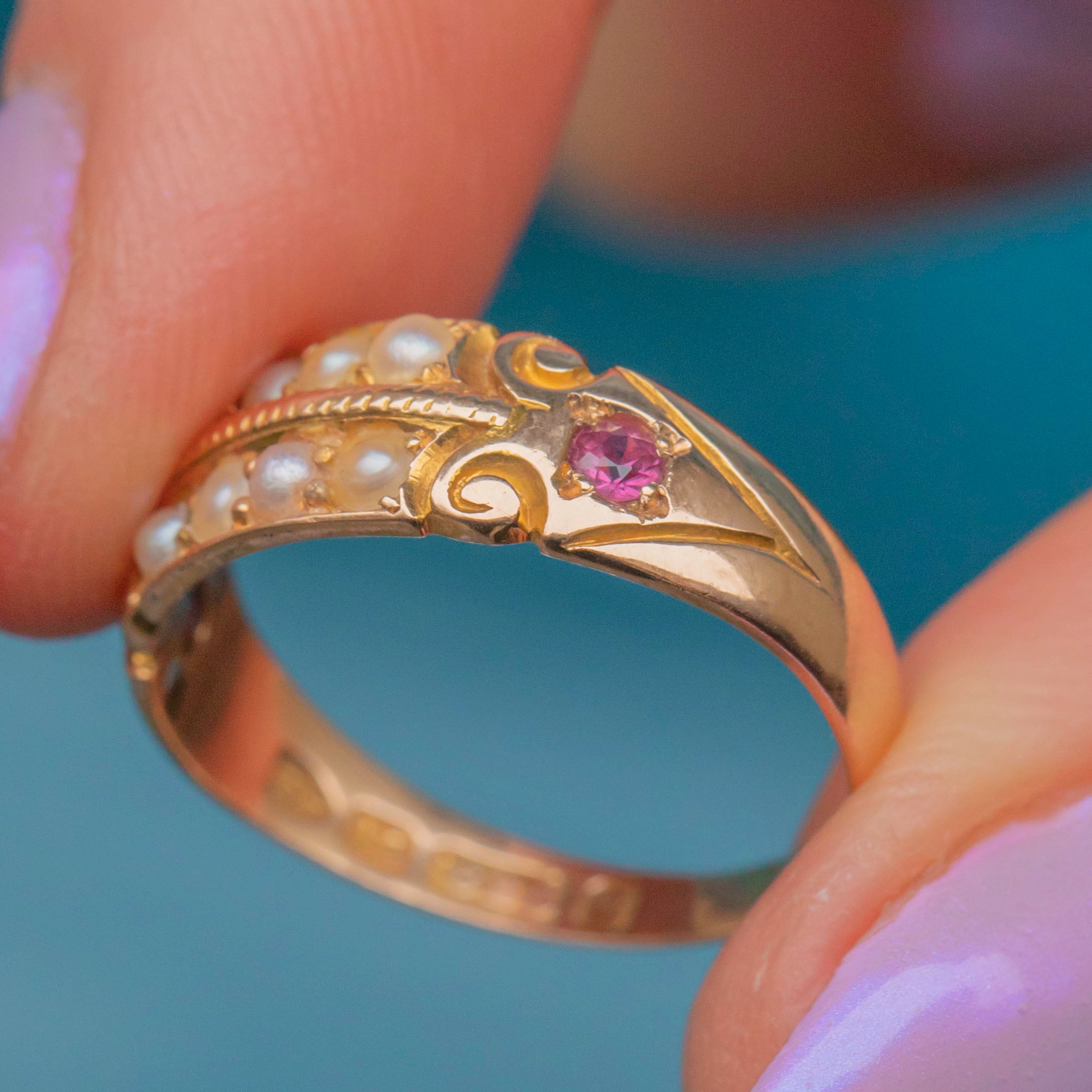 Victorian 15ct Gold Ruby Pearl Double Row Ring, c.1886