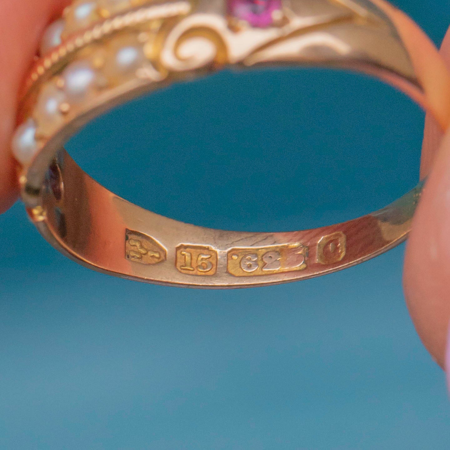 VERY GOOD. This Victorian 15ct Gold Ruby Pearl double row ring is in very good condition, displaying minimal signs of wear consistent with age. The Rubies are vibrant and well-set, while the Pearls exhibit some mild colour variation, adding a unique character to the piece. Overall, the ring remains a stunning example of Victorian craftsmanship and would make a cherished addition to any collection.