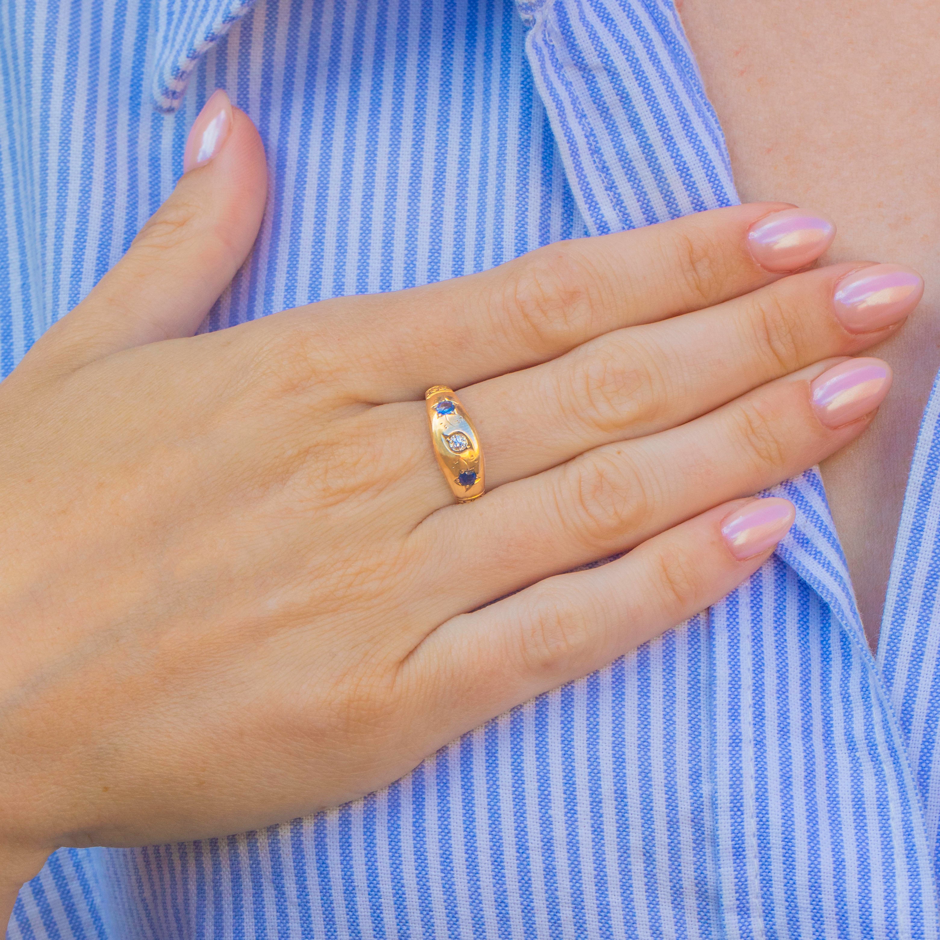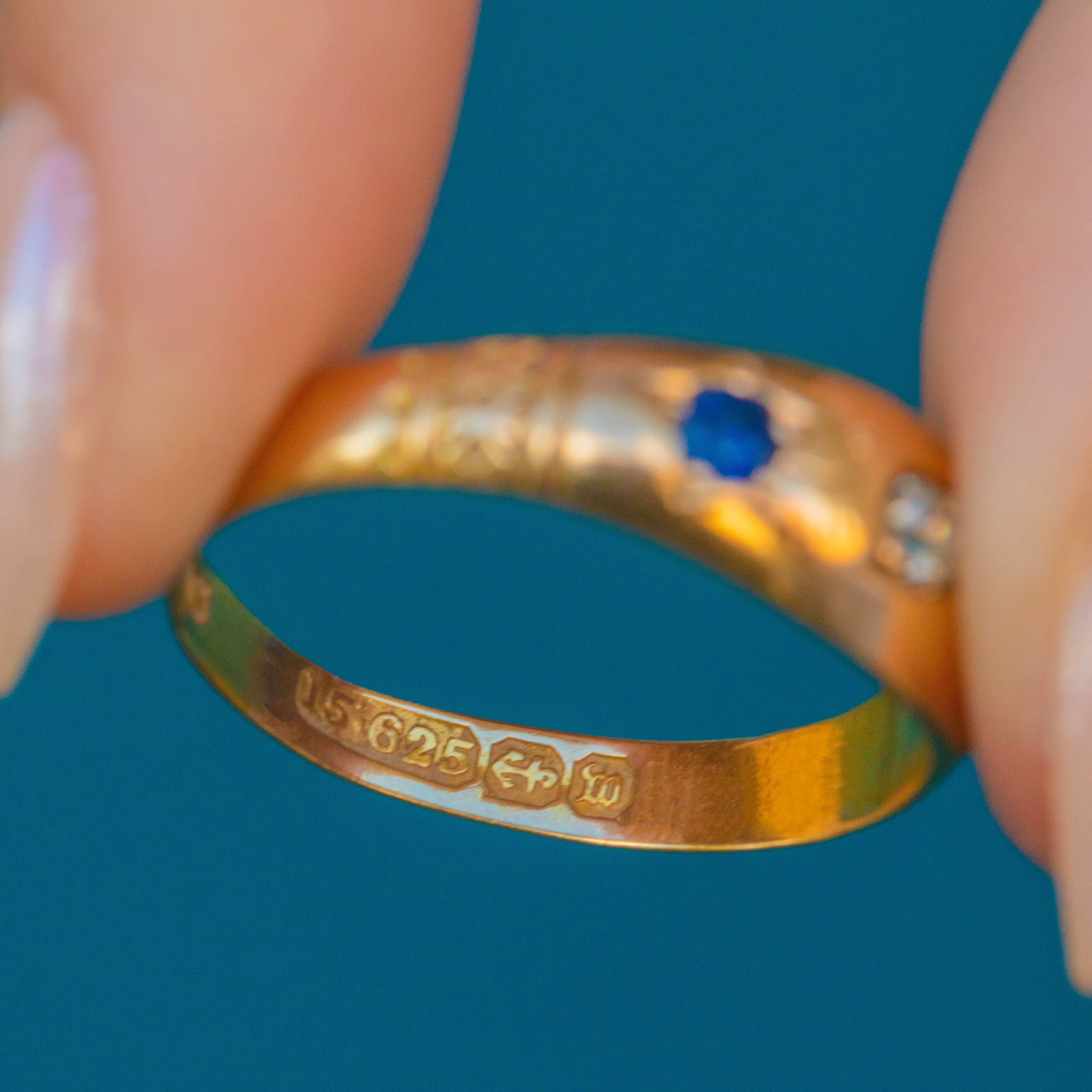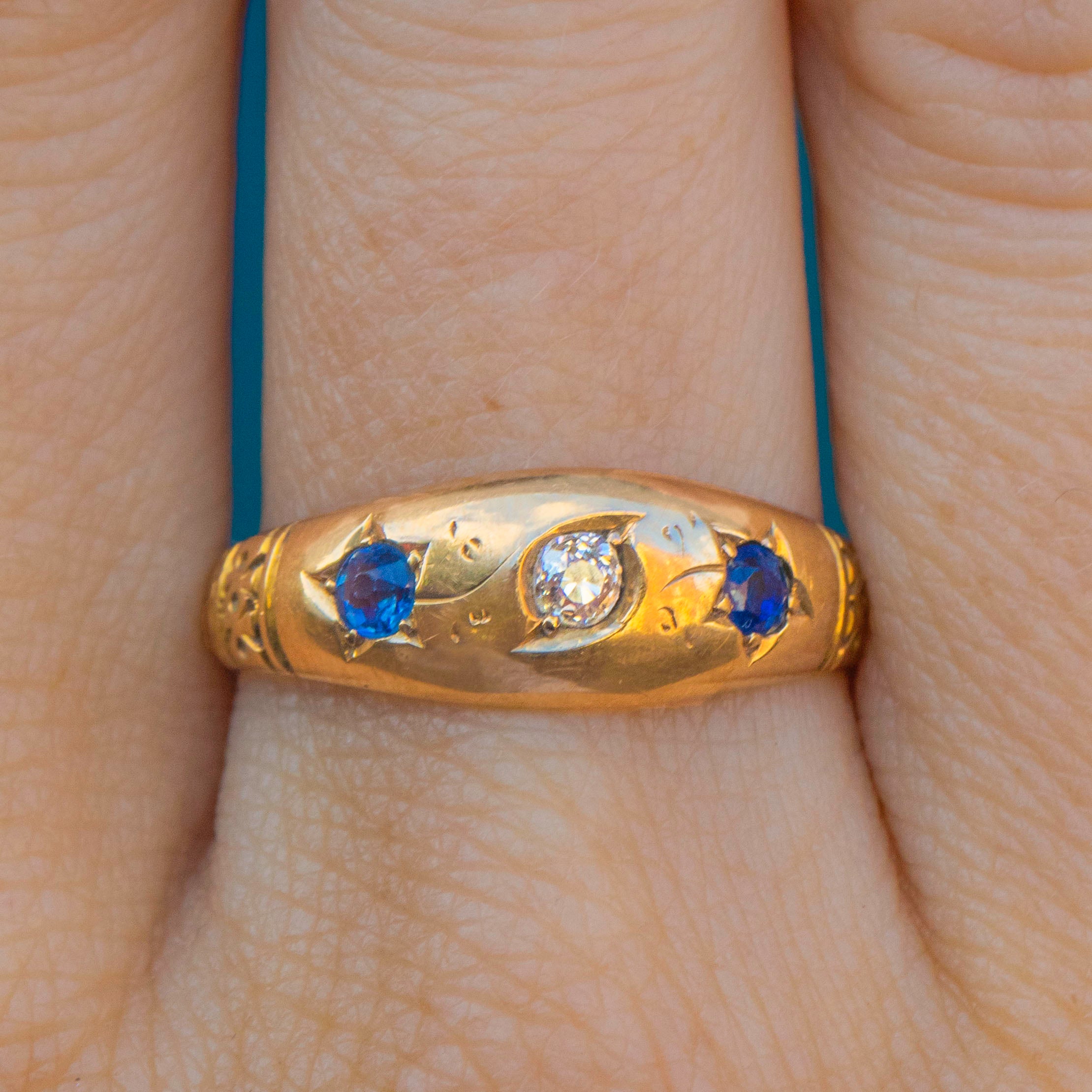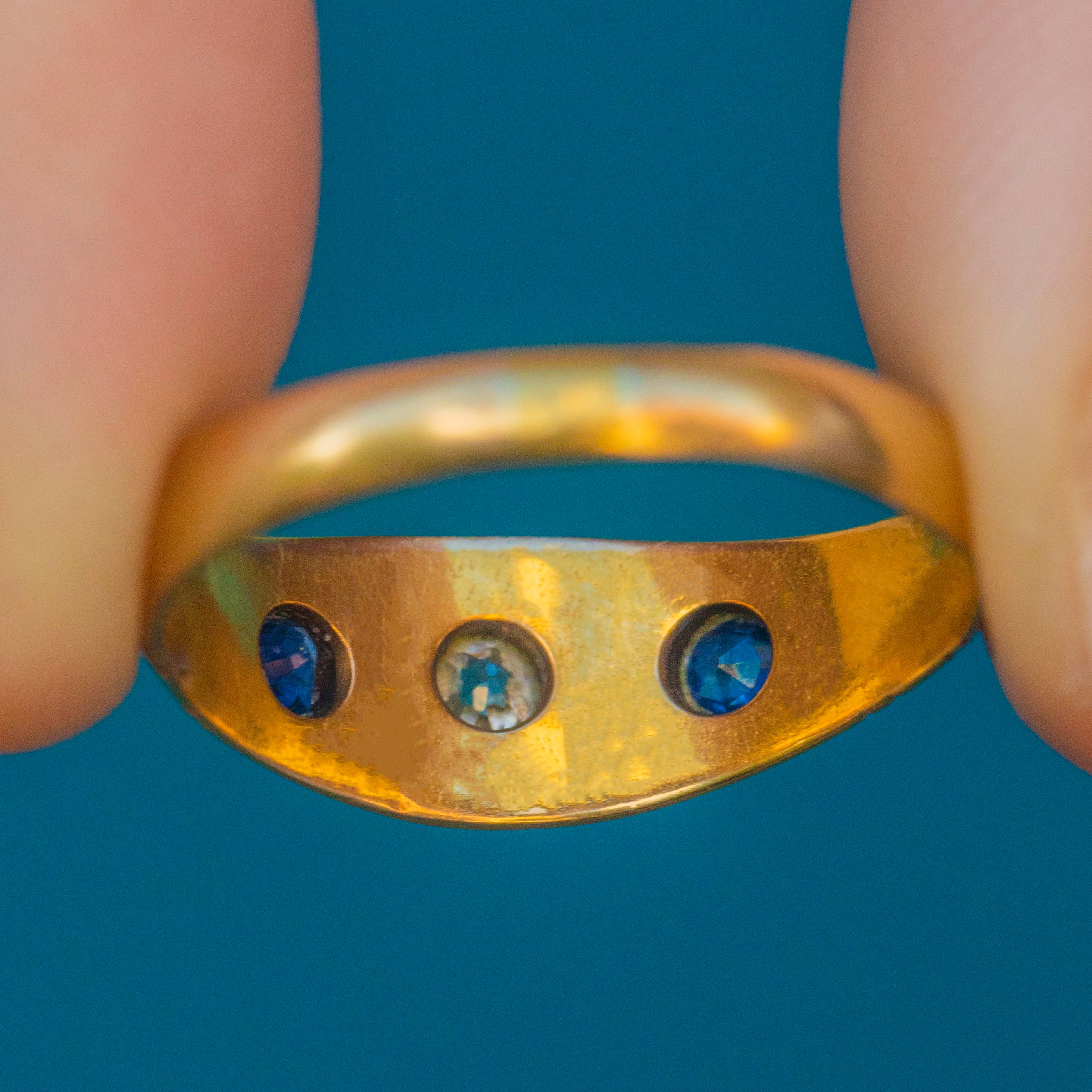 VERY GOOD. This Victorian 15ct Gold Sapphire Diamond gyspy ring is in very good condition. Her three dazzling gemstones are well set in their gypsy settings with no chips or abrasions to note. Although one of her Sapphires has been replaced by a deep blue Iolite, which has provided a bit more of a range in colour variation, they are still well-matched and contribute positively to the overall impact of the ring. With a full set on English hallmarks inside the band, we can accurately date this Gold ring back to 1896. A true Victorian masterpiece!