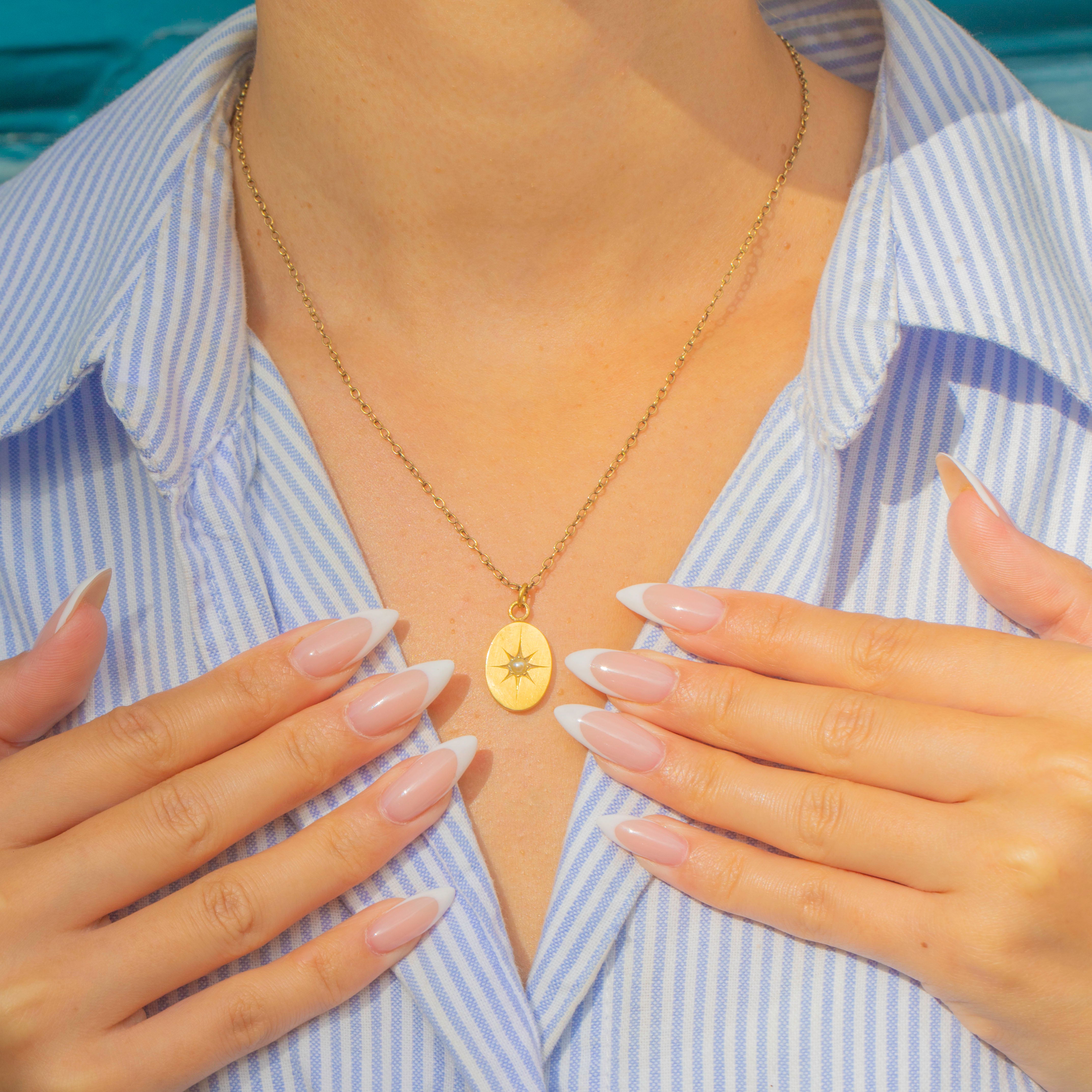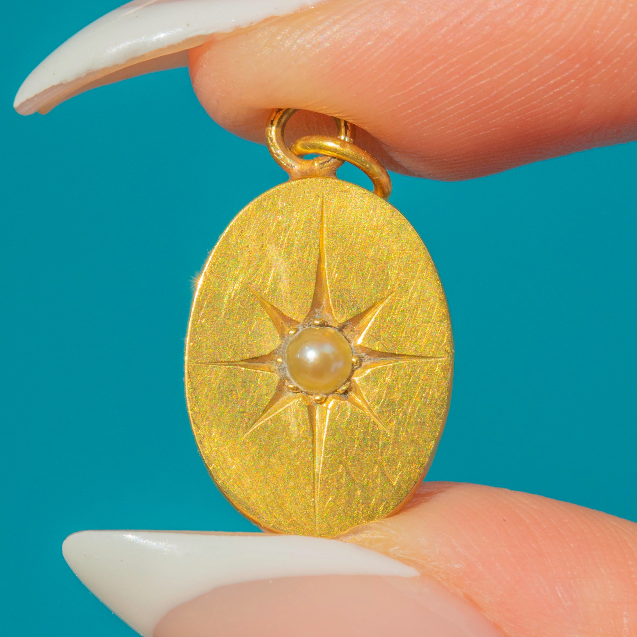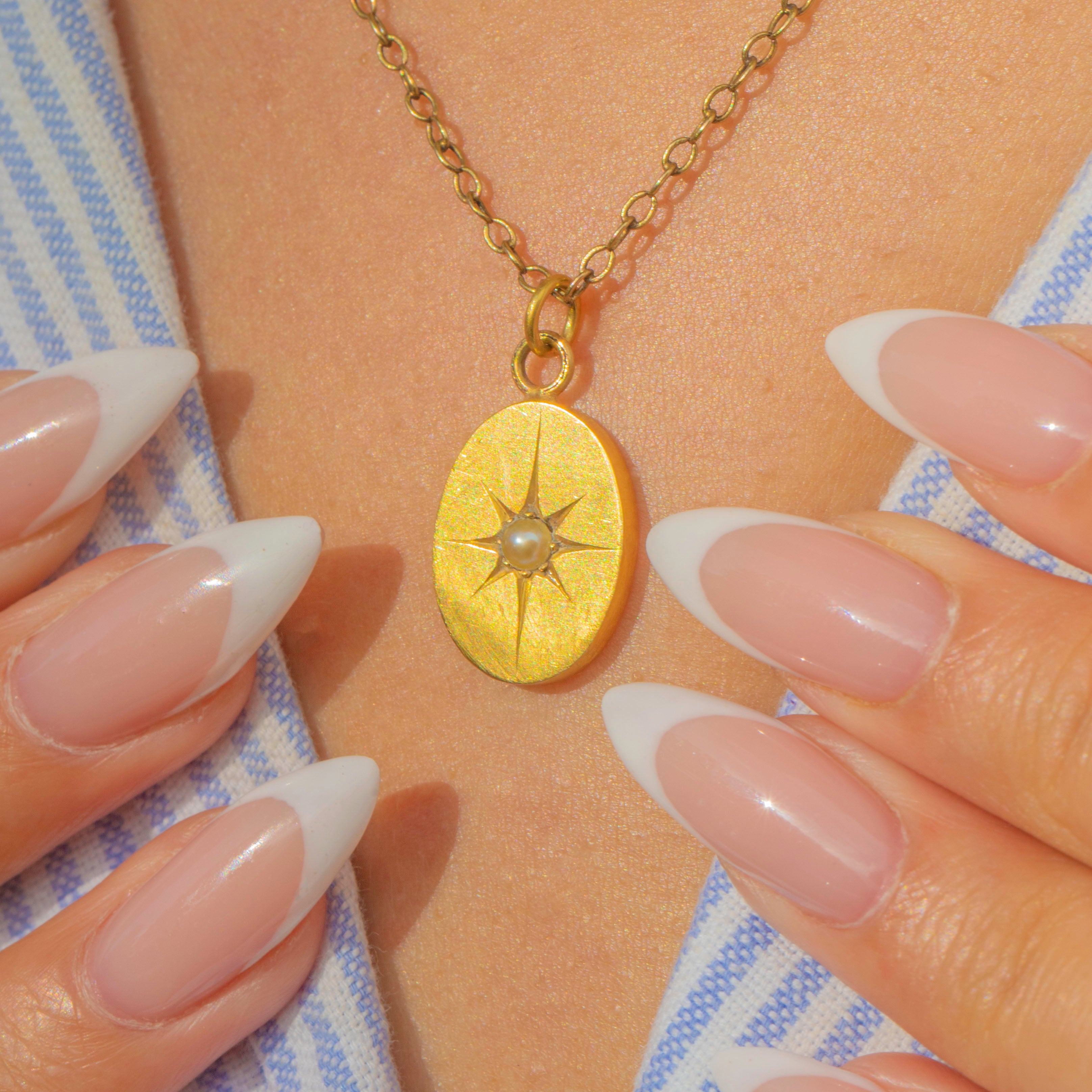 A sweet Victorian oval pendant in rich 15ct Gold, engraved with an eight-point star and set at the centre with a lustrous Pearl. The satiny brushed finish and crisp star motif make this a chic everyday talisman that layers beautifully on a fine chain.