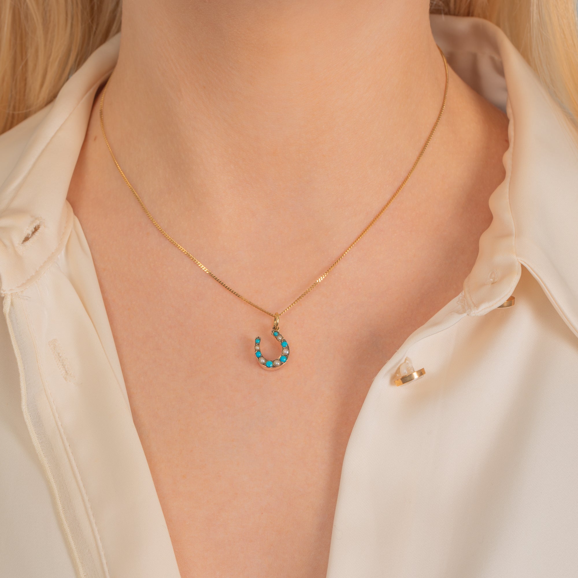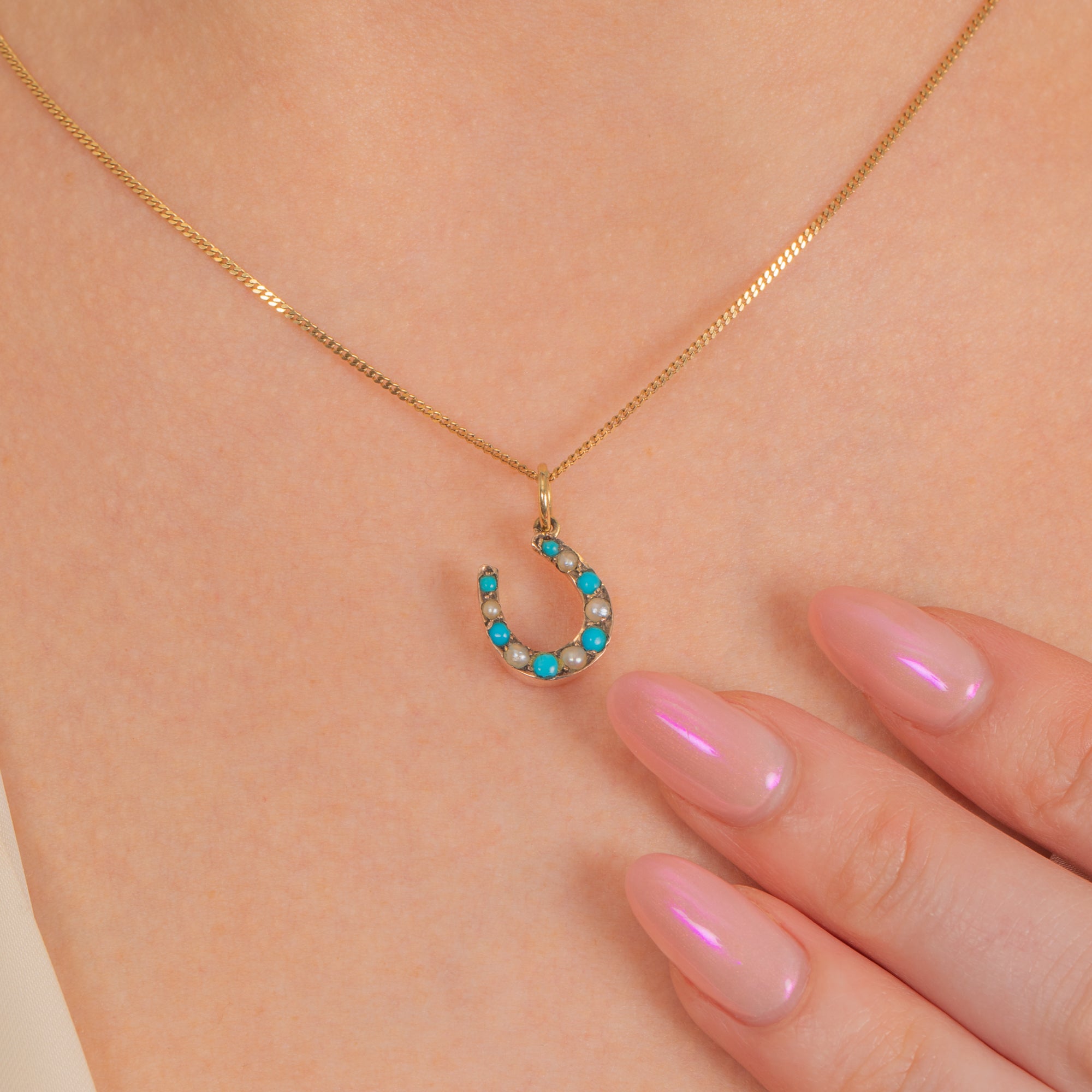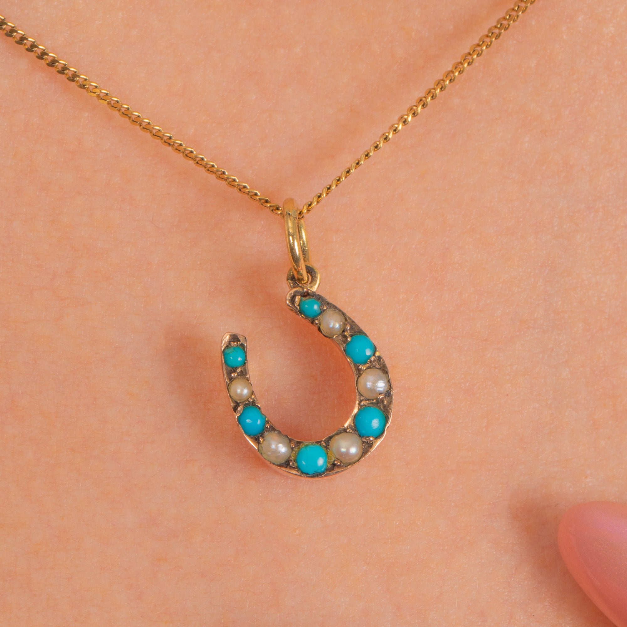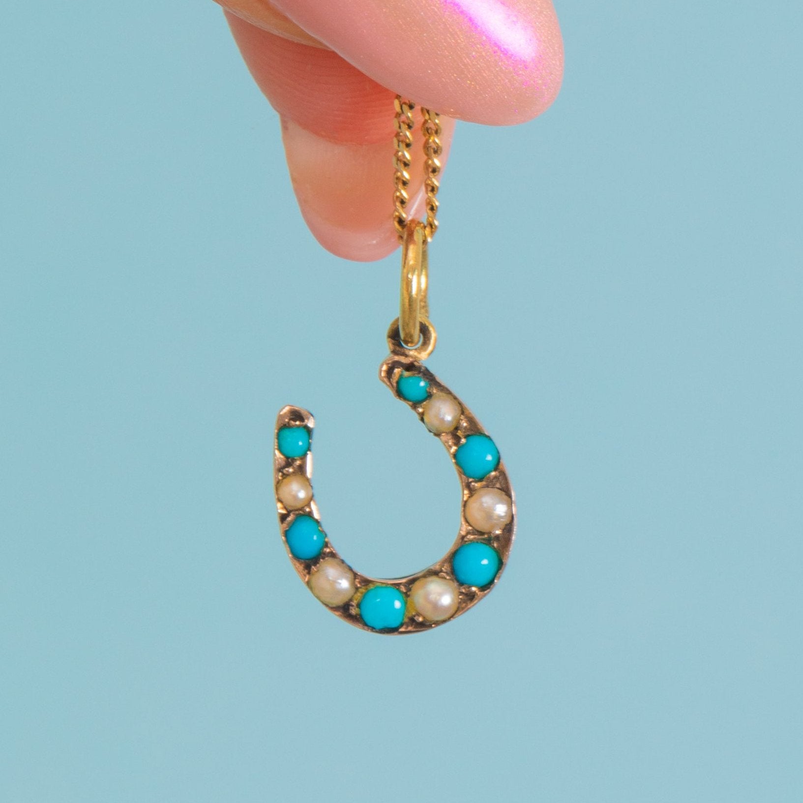 This Victorian 15ct Gold Turquoise Pearl horseshoe charm is the perfect lucky charm to wear day in and day out! Inlaid with gorgeous Turquoise gems and shimmering iridescent Pearls, this adorable charm is vibrant with colour and character!