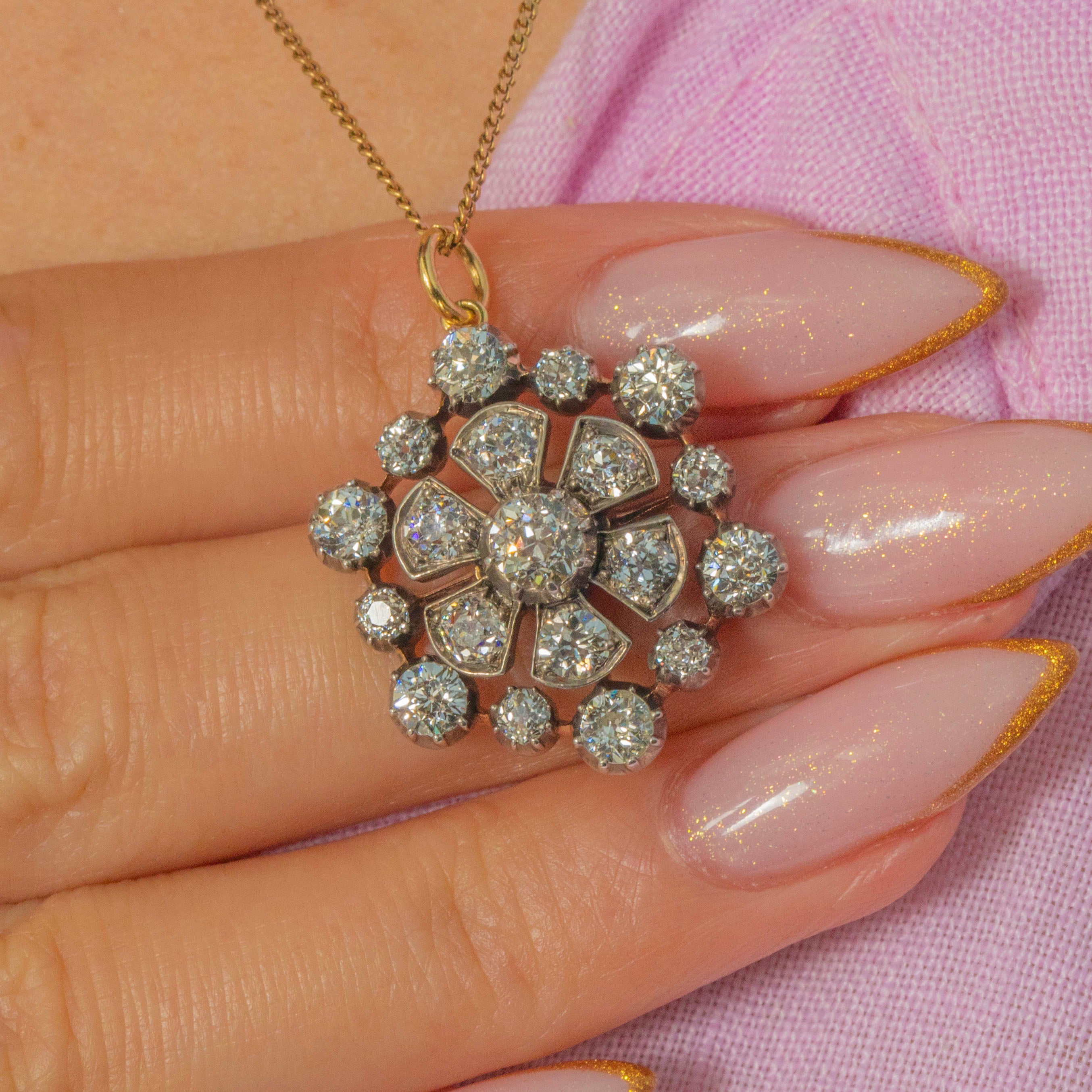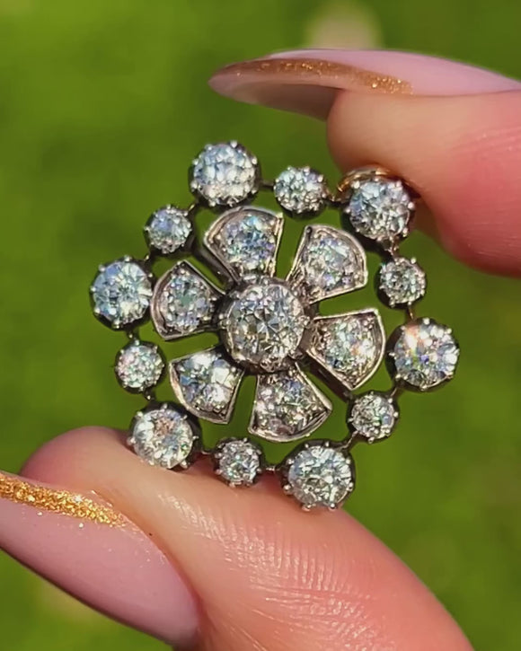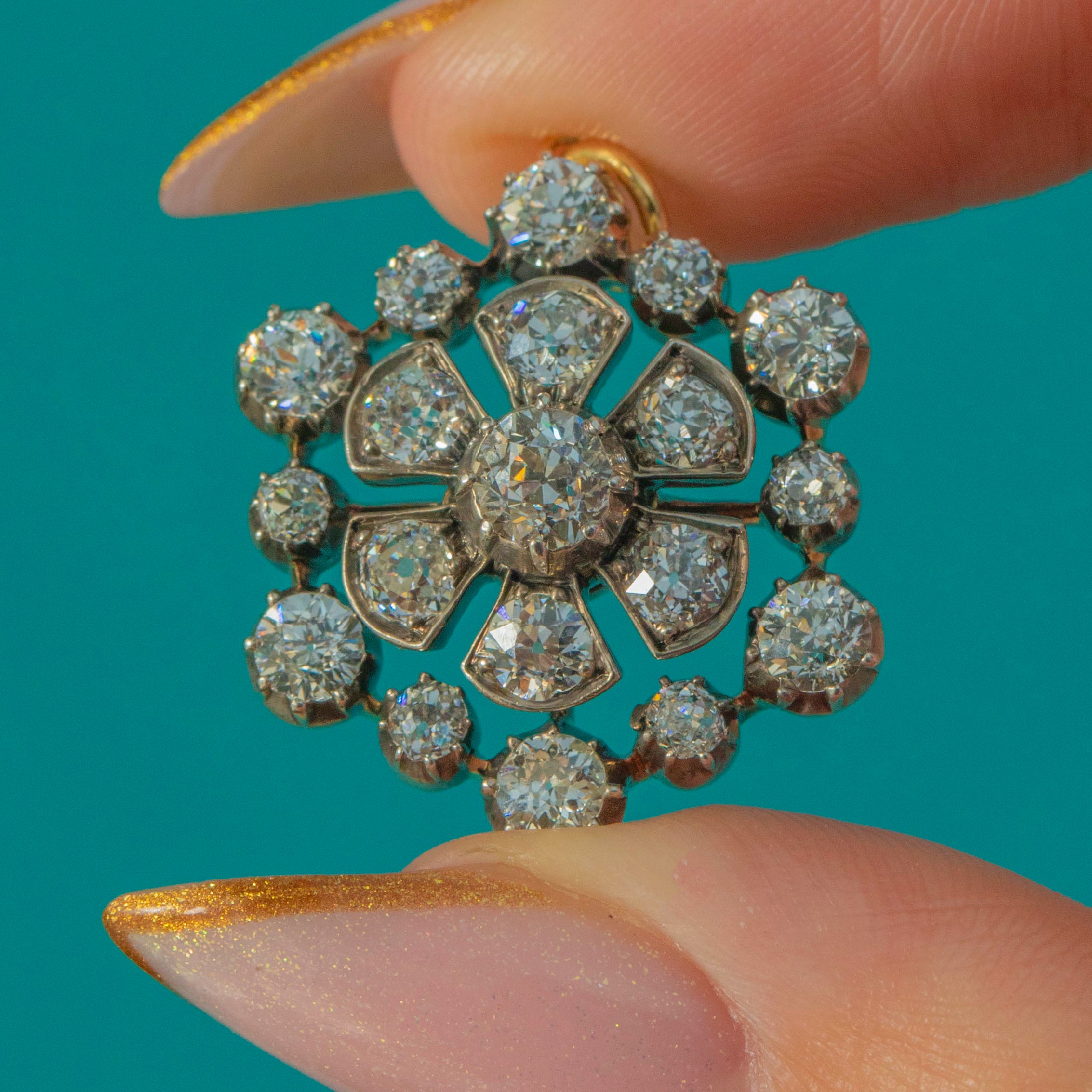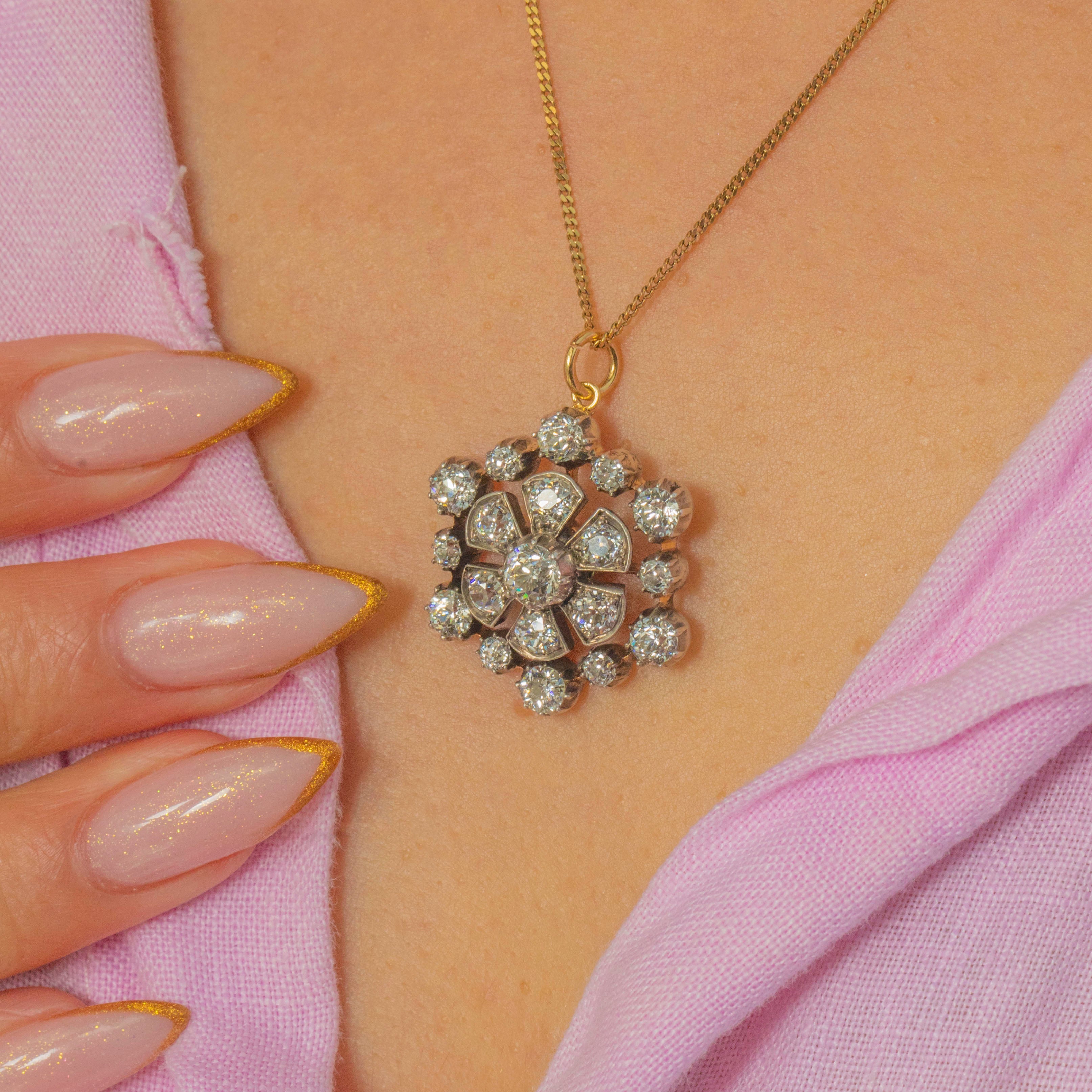 A breathtaking Victorian Diamond pendant with brooch fittings, crafted circa 1890 in rich 18ct Gold with traditional Silver settings. This elegant cluster features approximately 2.50cts of bright and lively Old Mine Cut Diamonds arranged in a classic rosette form, sparkling beautifully with every movement.