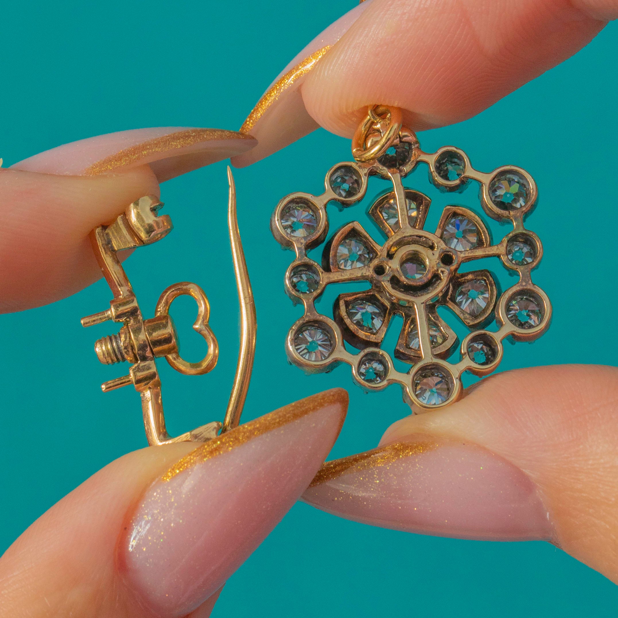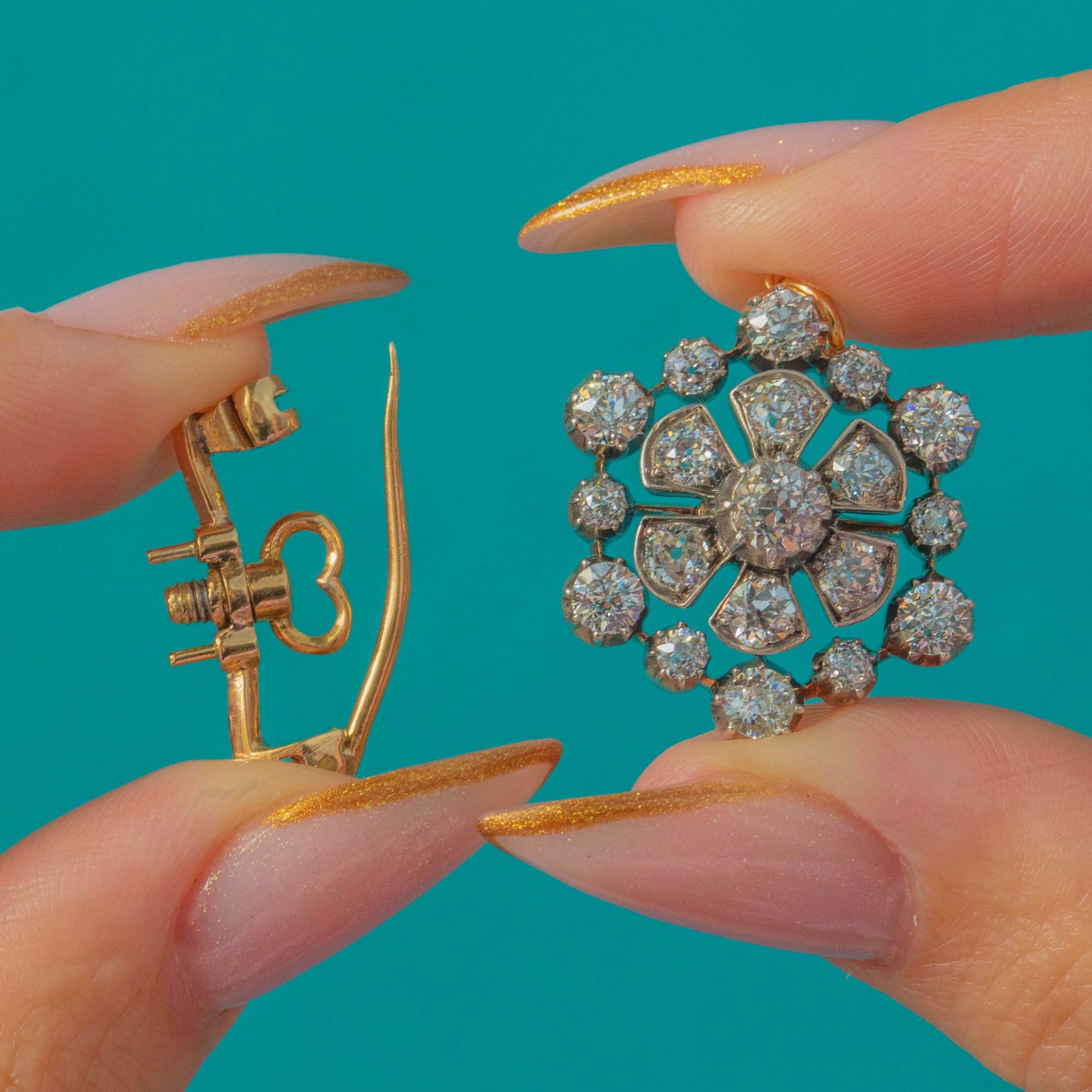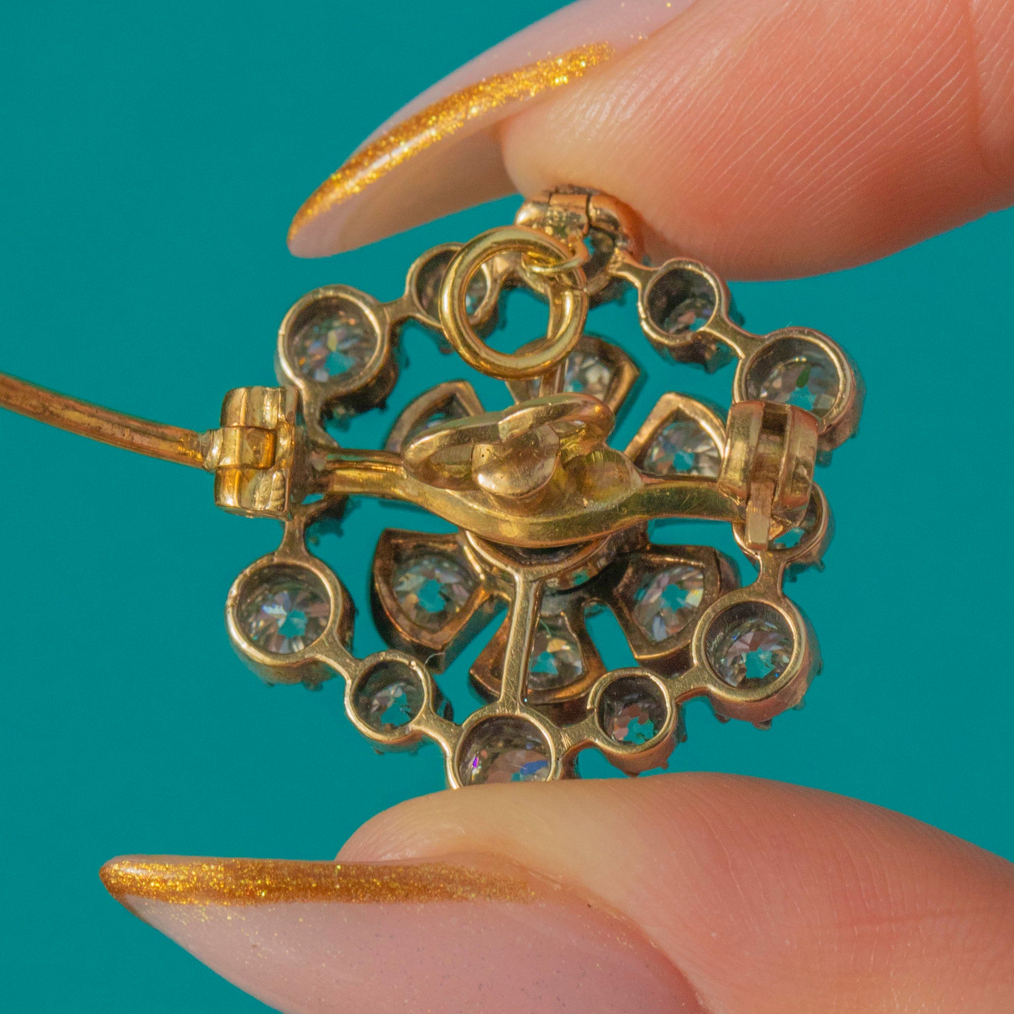 EXCELLENT: The antique Old Mine Cut Diamonds are bright, clean and full of fire, with no visible chips or abrasions. The Silver settings and 18ct Gold body show minimal wear, retaining a crisp profile. Both the jump ring and the detachable brooch fitting are secure and fully functional.