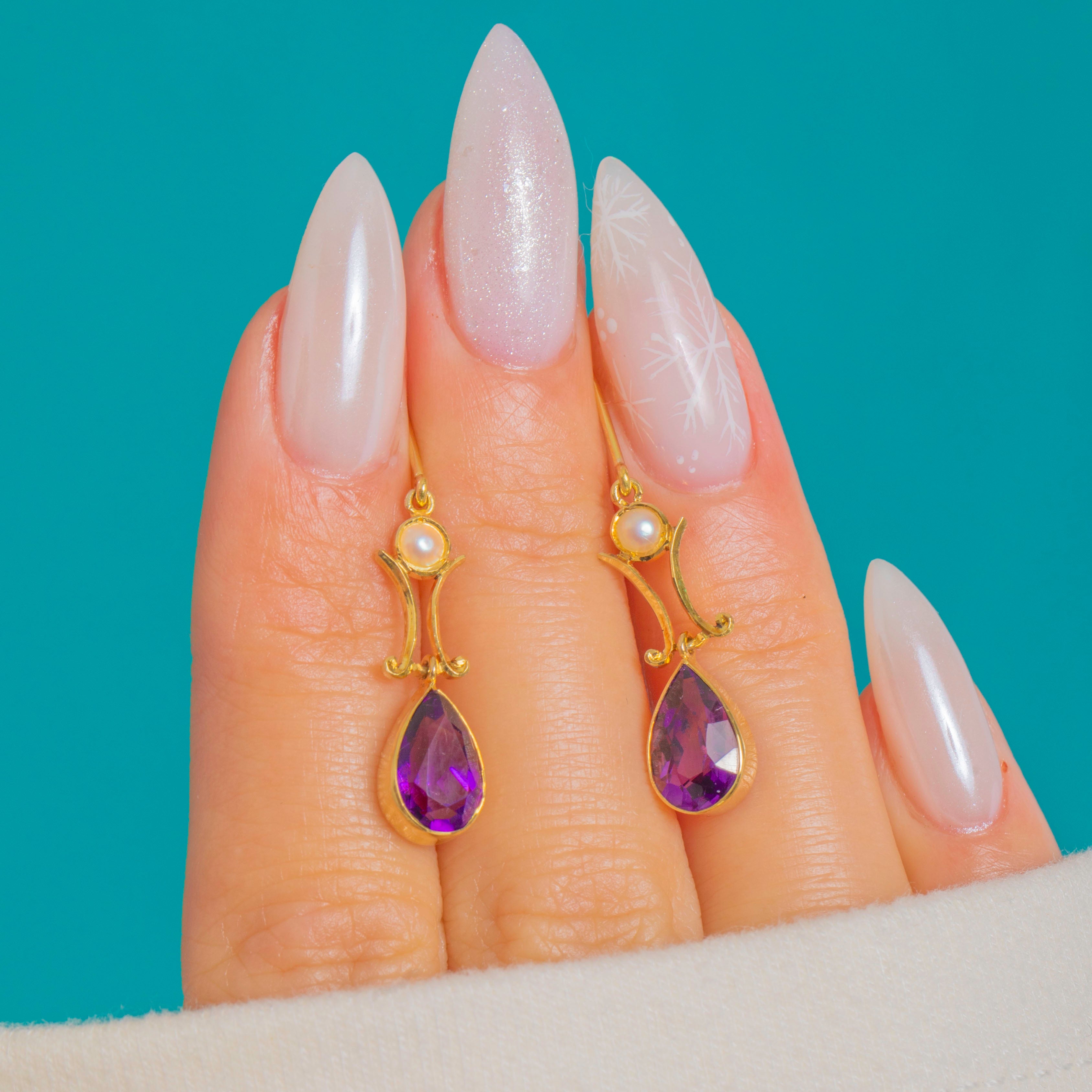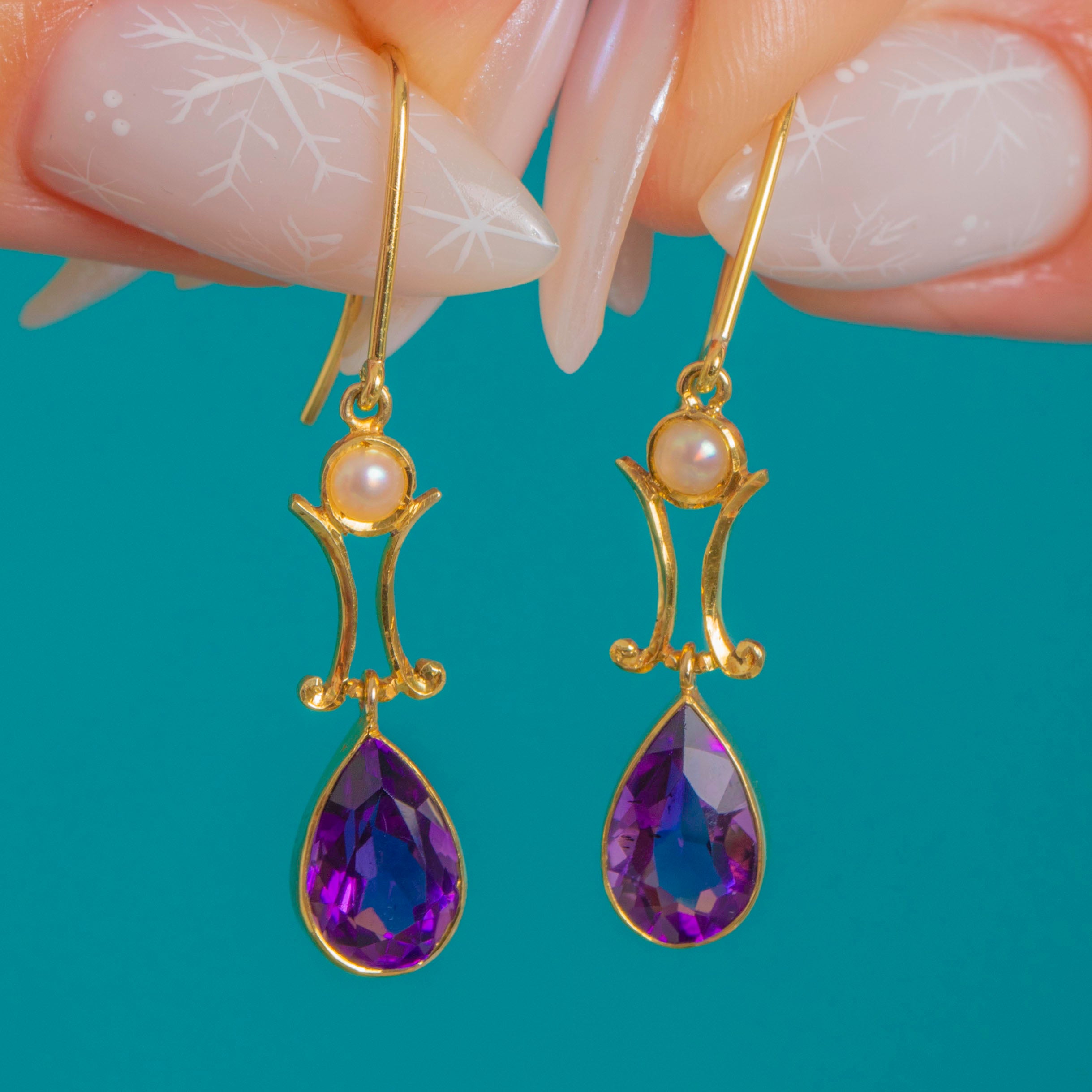 Romantic and refined, these antique Victorian drop earrings marry luminous Pearl surmounts with vivid pear-cut Amethysts in rich 18ct Gold. A graceful S‑scroll ribbon connector lends an elegant silhouette, while open-backed bezels invite light through the purple gems for beautiful sparkle.