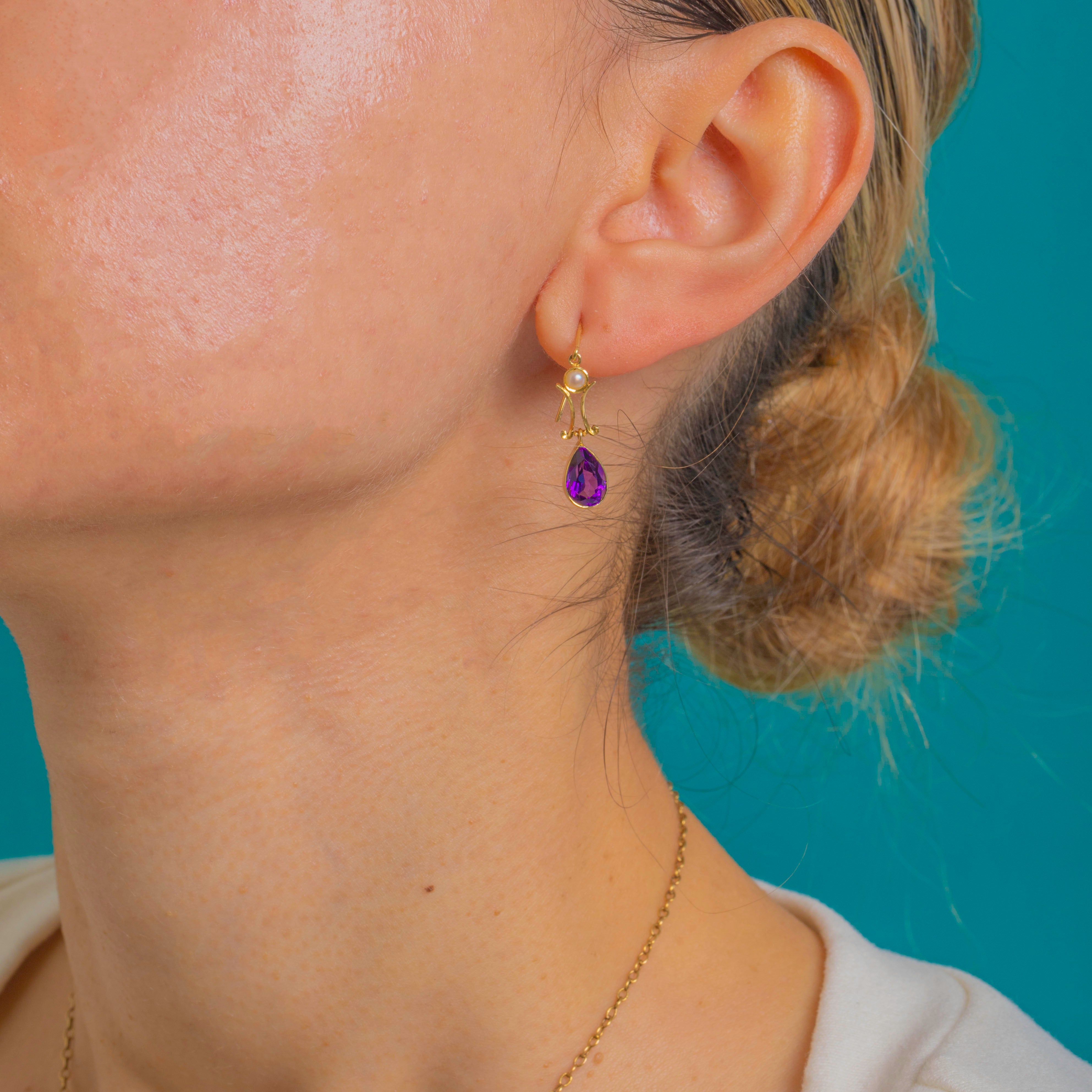 EXCELLENT: Amethysts are bright and well-matched with clean facets and no chips or eye-visible abrasions; Pearls display fine lustre. The 18ct Gold bezels and scroll connectors are crisp with a bright polish and only light surface wear; ear wires are straight and sturdy. No visible repairs or alterations, indicating careful past wear and superb preservation.