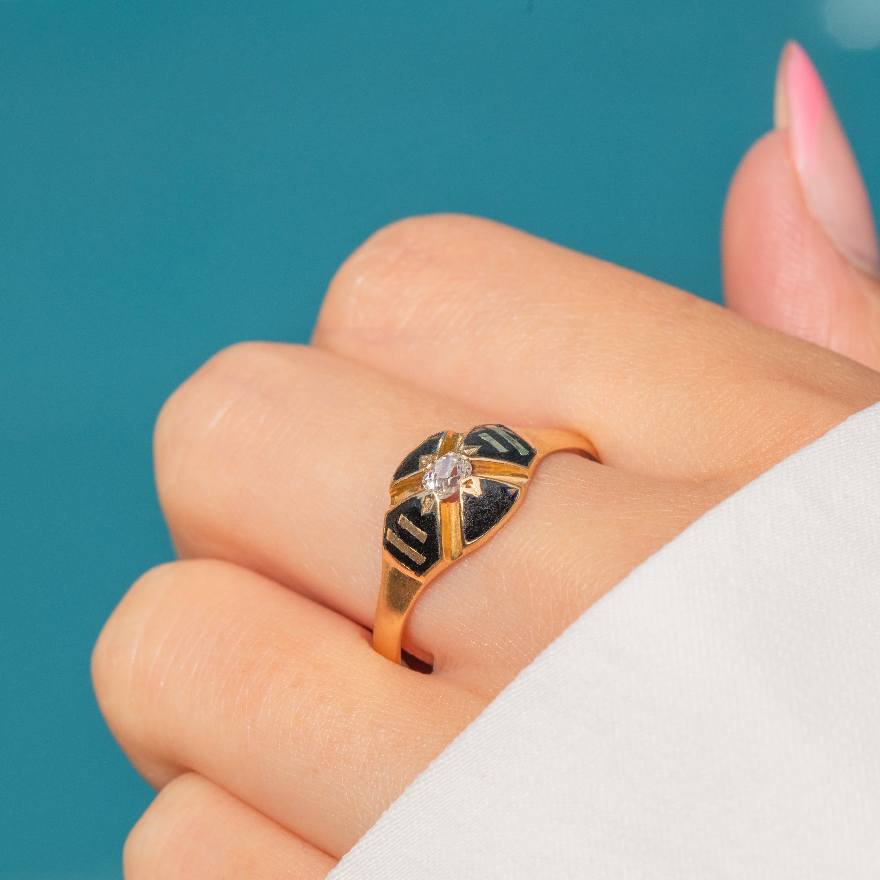 Add a unique flair to your repertoire with this Victorian 18ct Gold black Enamel Diamond ring!
