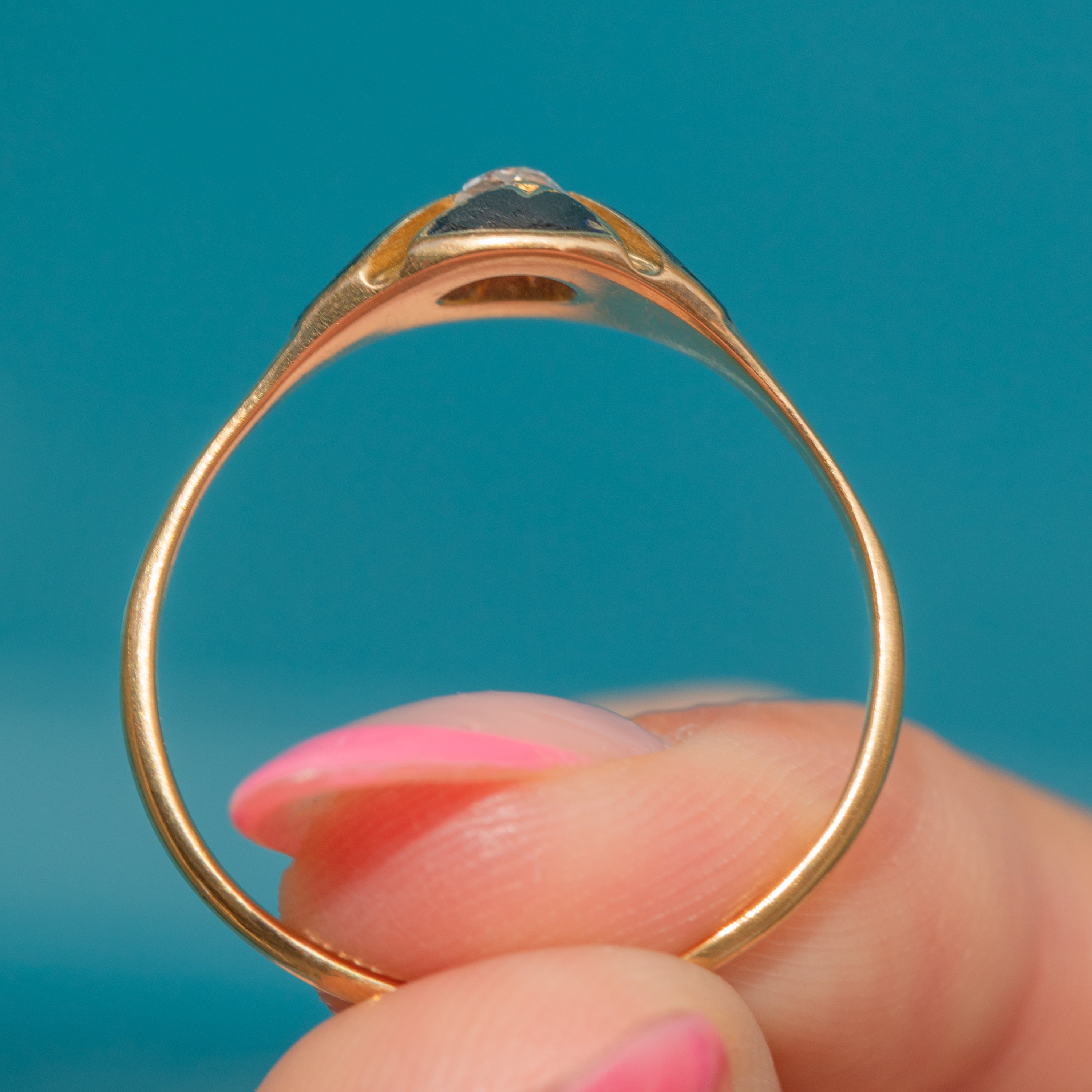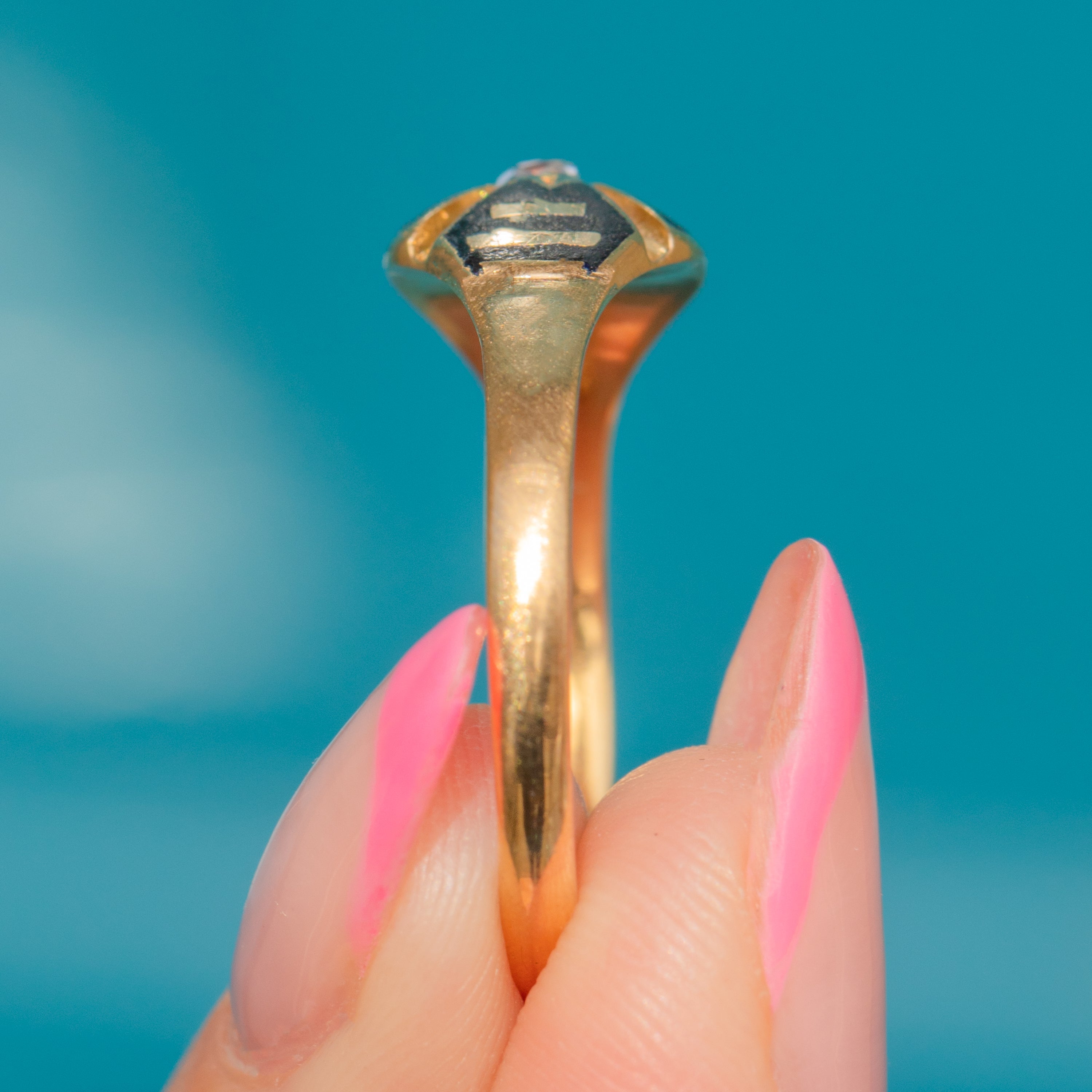 VERY GOOD-EXCELLENT: This Victorian 18ct Gold Diamond Enamel ring is in wonderful condition. Her Diamond is in fantastic condition, with a brilliant sparkle, and is set securely with no chips or abrasions. The Gold has a gorgeous saturation and there are no resize marks visible on the band. There are some light dings and pinpricks to the Gold, though this is difficult to spot without a jeweller's loupe. The Enamel has lasted well with only mild wear noticeable under close inspection. With a full set of hallmarks and a sturdy band, this antique Diamond ring can be worn with utmost confidence.
