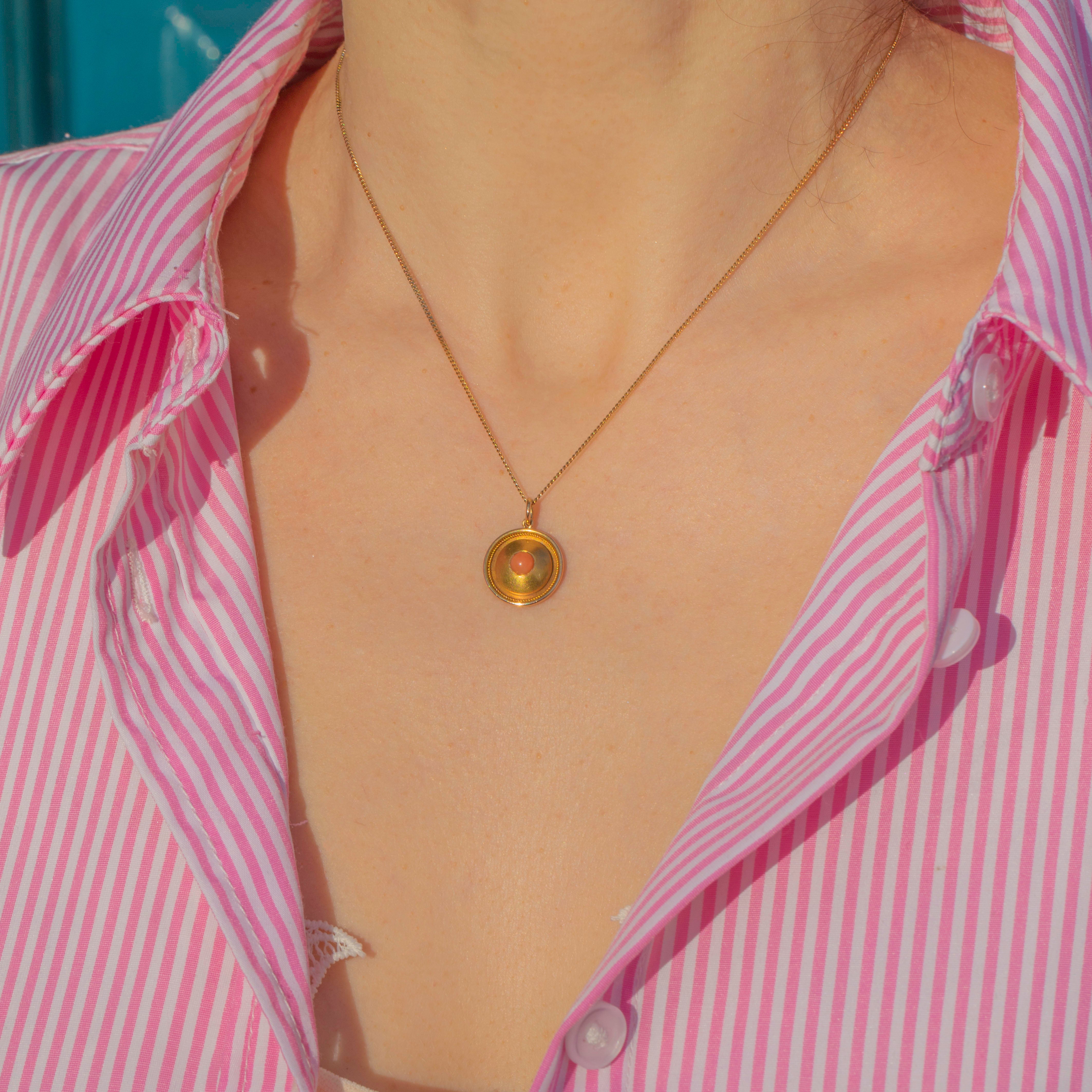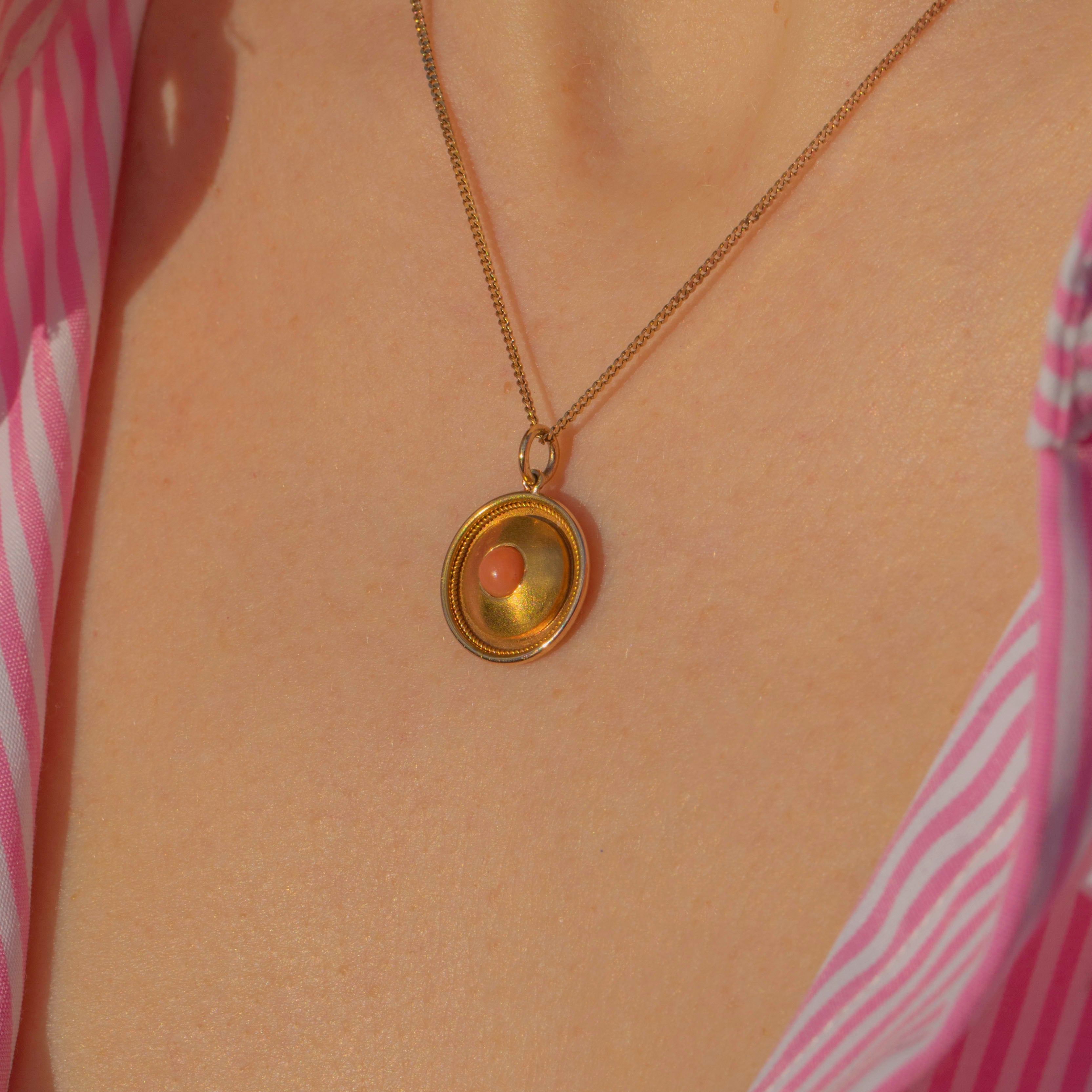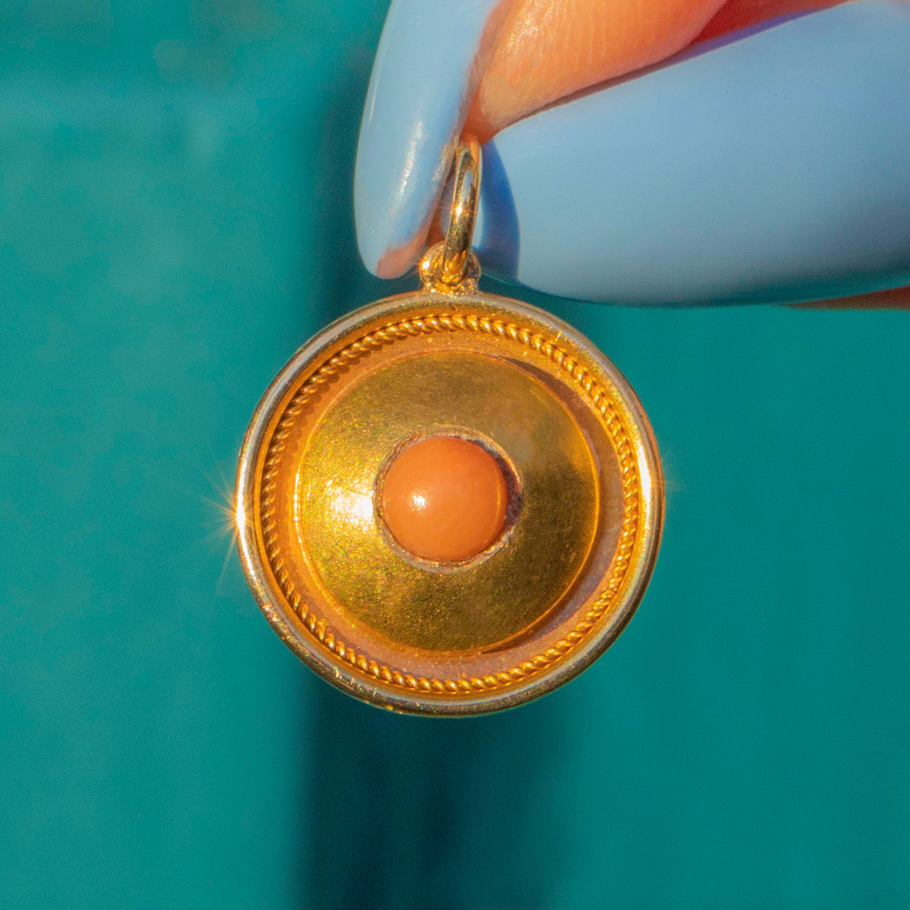 This Victorian 18ct Gold Coral button charm will make a lovely adornment for your favourite Gold chain! This antique pendant is a curvaceous little treat, crafted from saturated 18ct Gold with a satisfying satin finish and inlaid with a pastel-hued natural Coral cabochon.