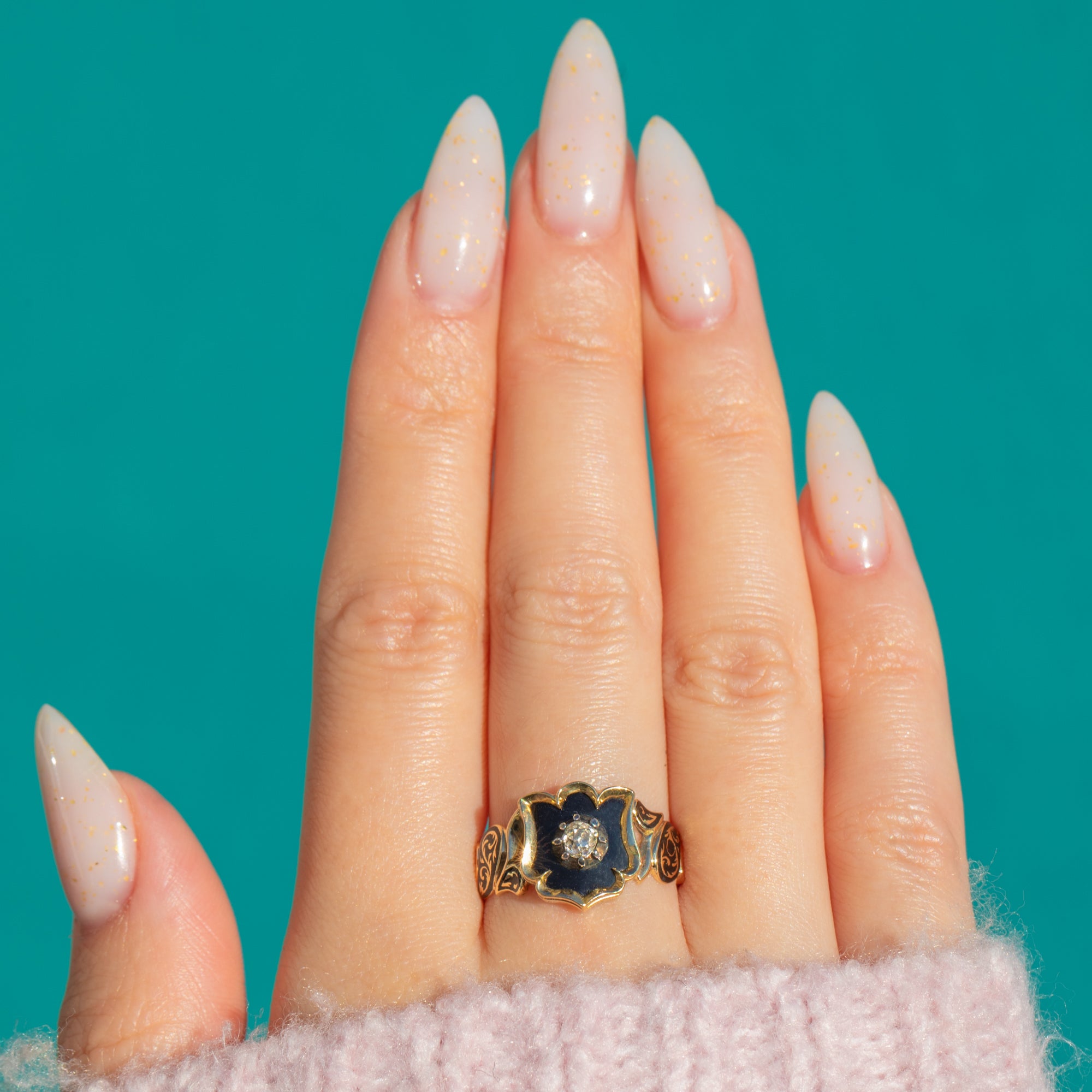 A beautifully preserved Victorian mourning ring in rich 18ct Gold, c.1850. The scalloped cartouche head gleams with glossy black Enamel, centred by a Silver collet holding a bright Diamond for striking contrast. Foliate and scrollwork shoulder panels, including a tiny heart detail, lead to a bold black enamel legend reading “IN MEMORY OF”.