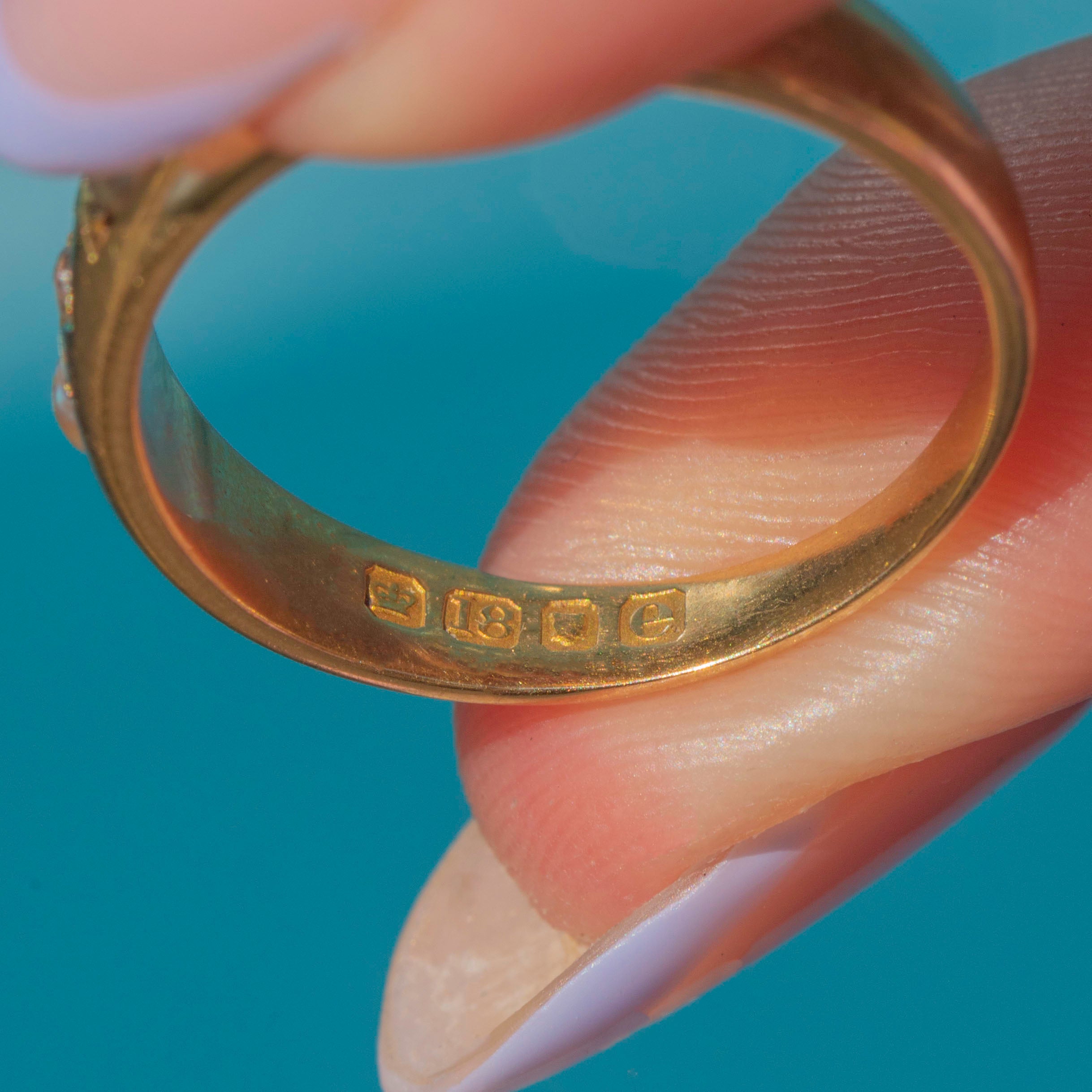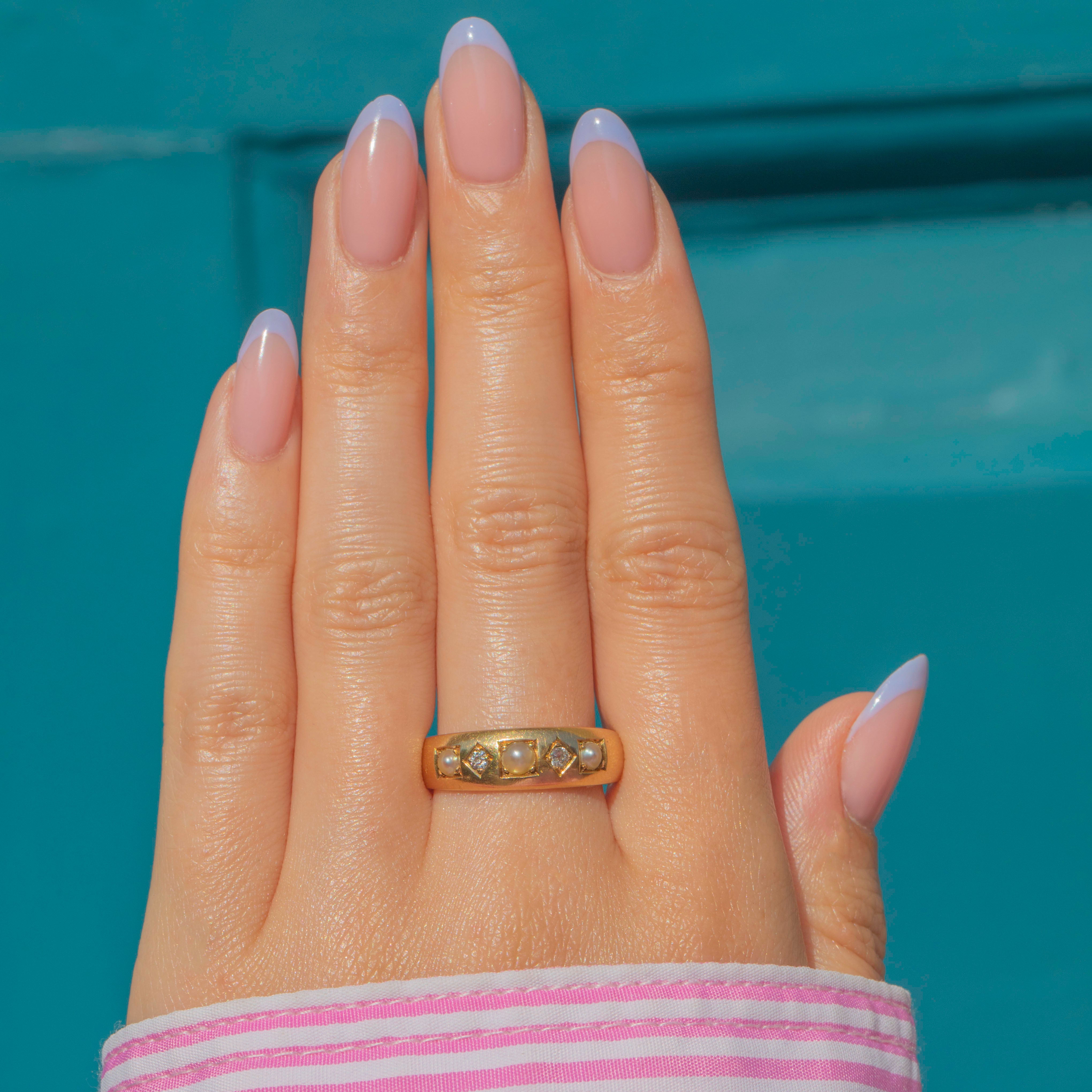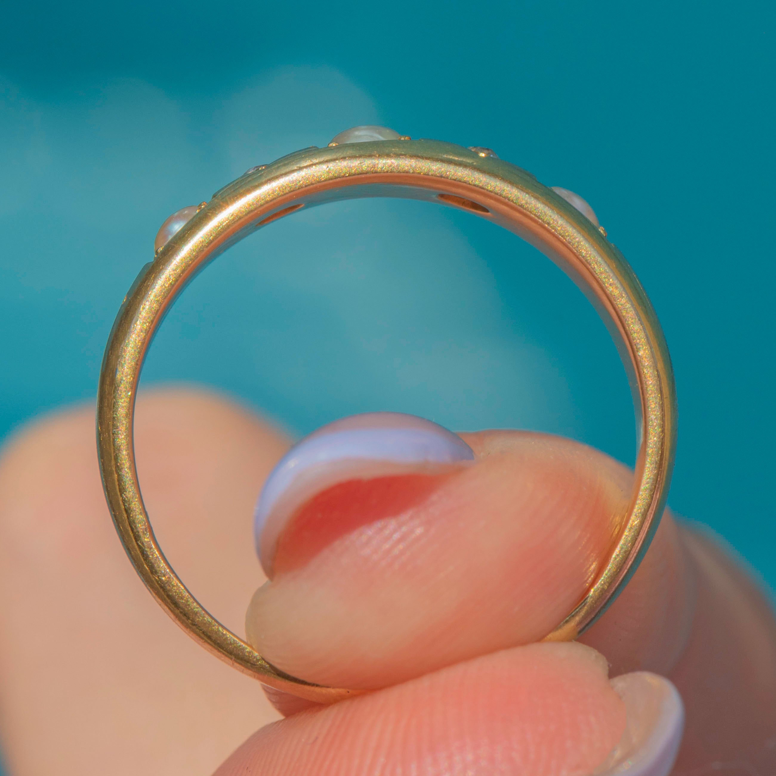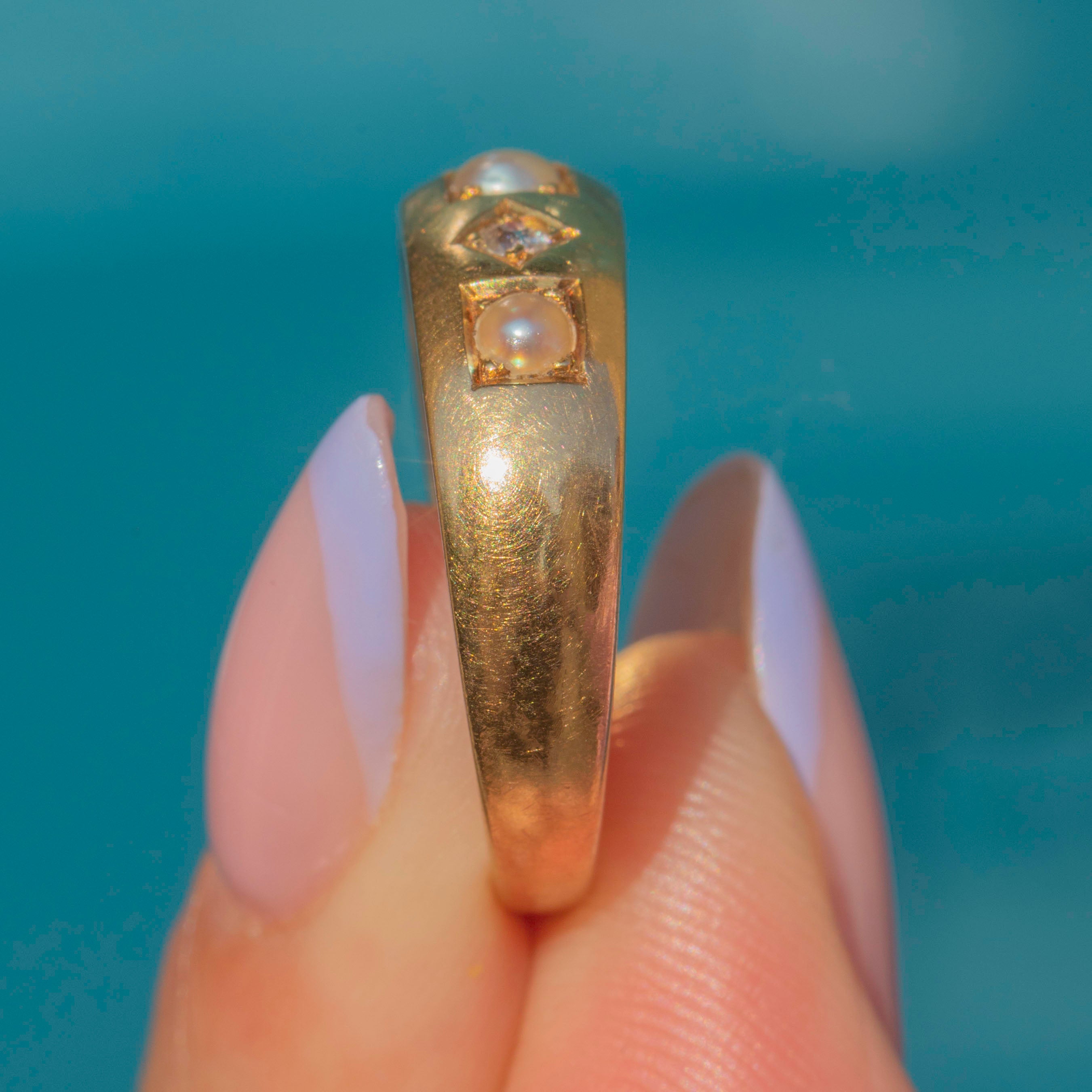 EXCELLENT: This Victorian 18ct Gold Diamond Pearl five stone gypsy ring is in excellent condition. The Gold is bright and buttery, and each of her gemstones are securely set. With little else to note, she is in brilliant condition.
