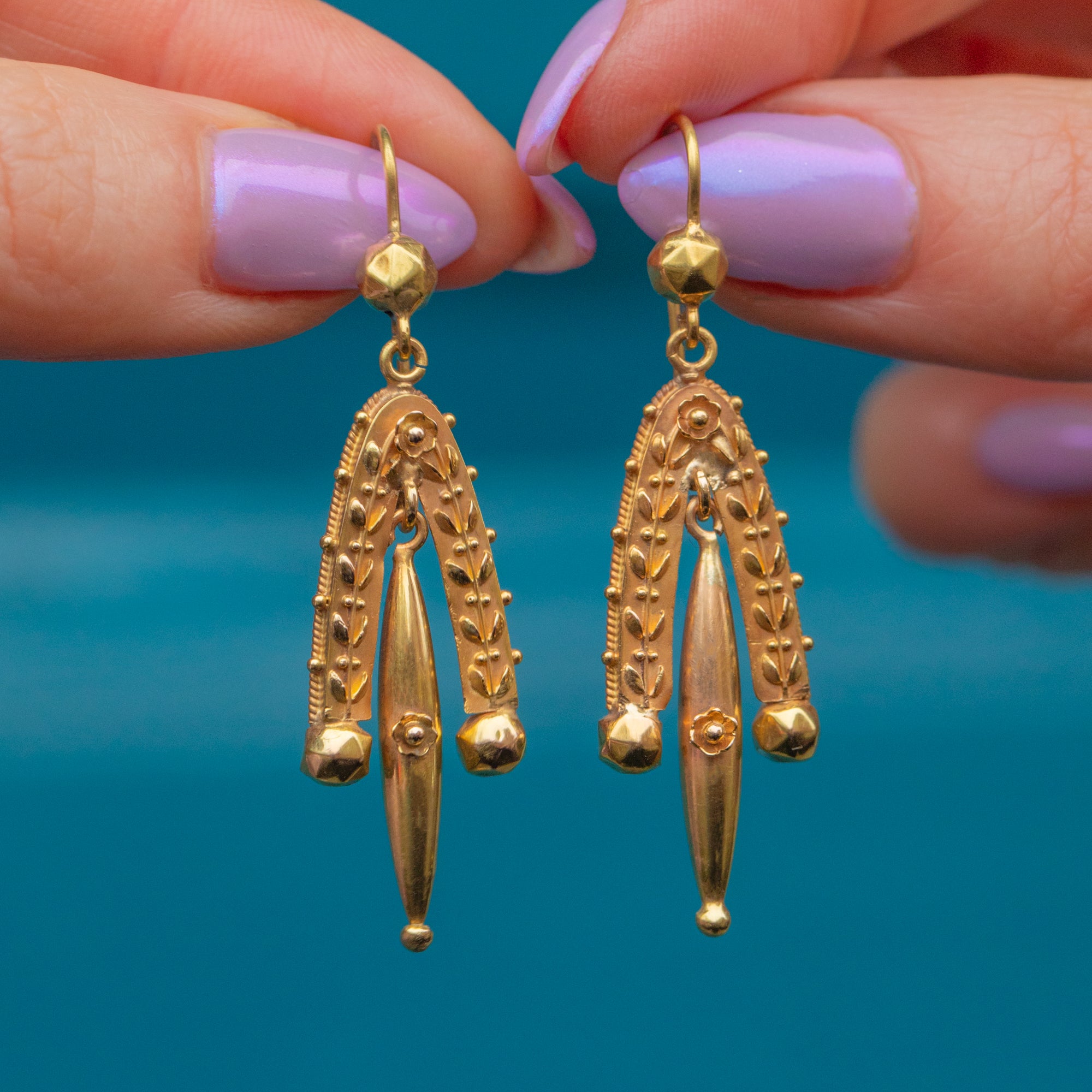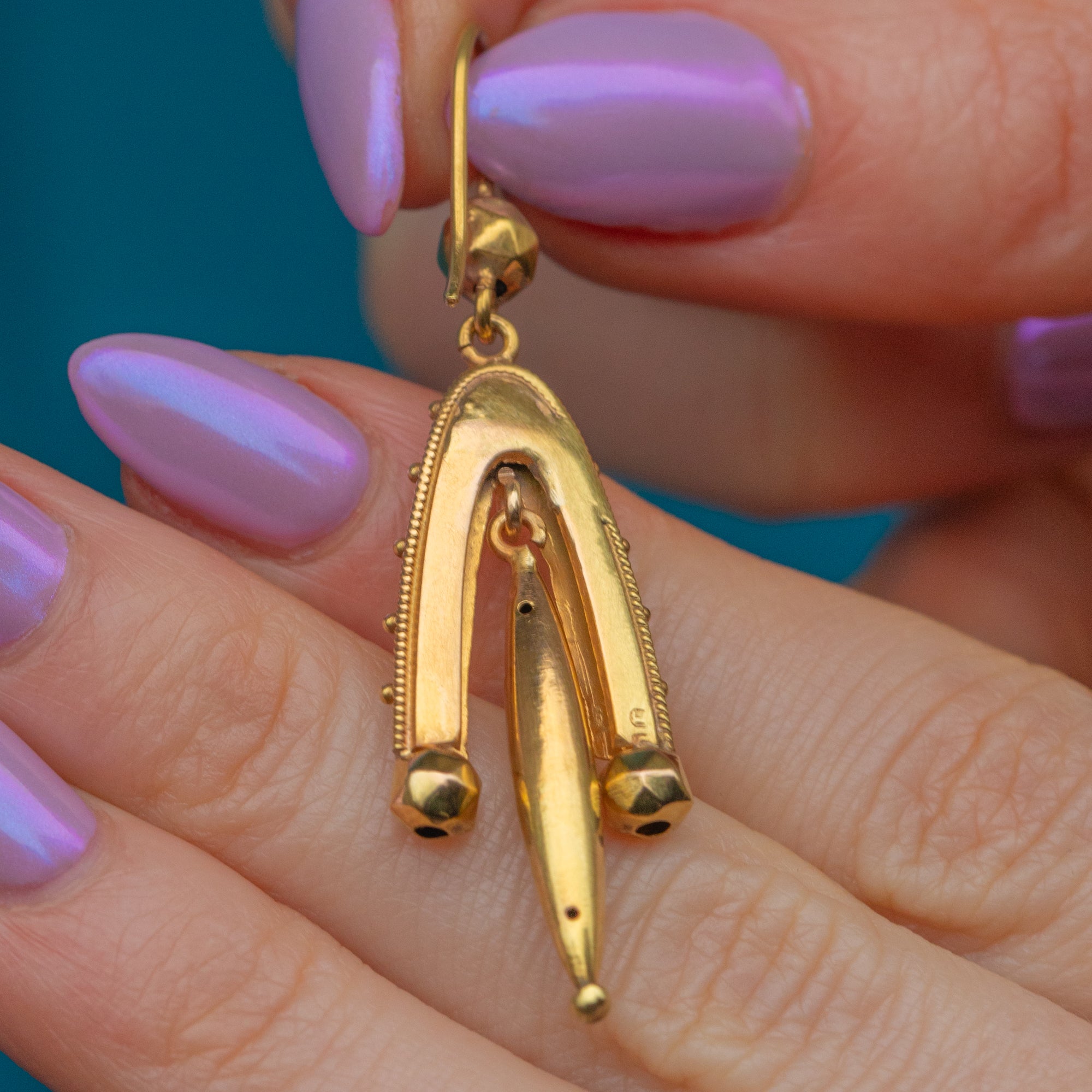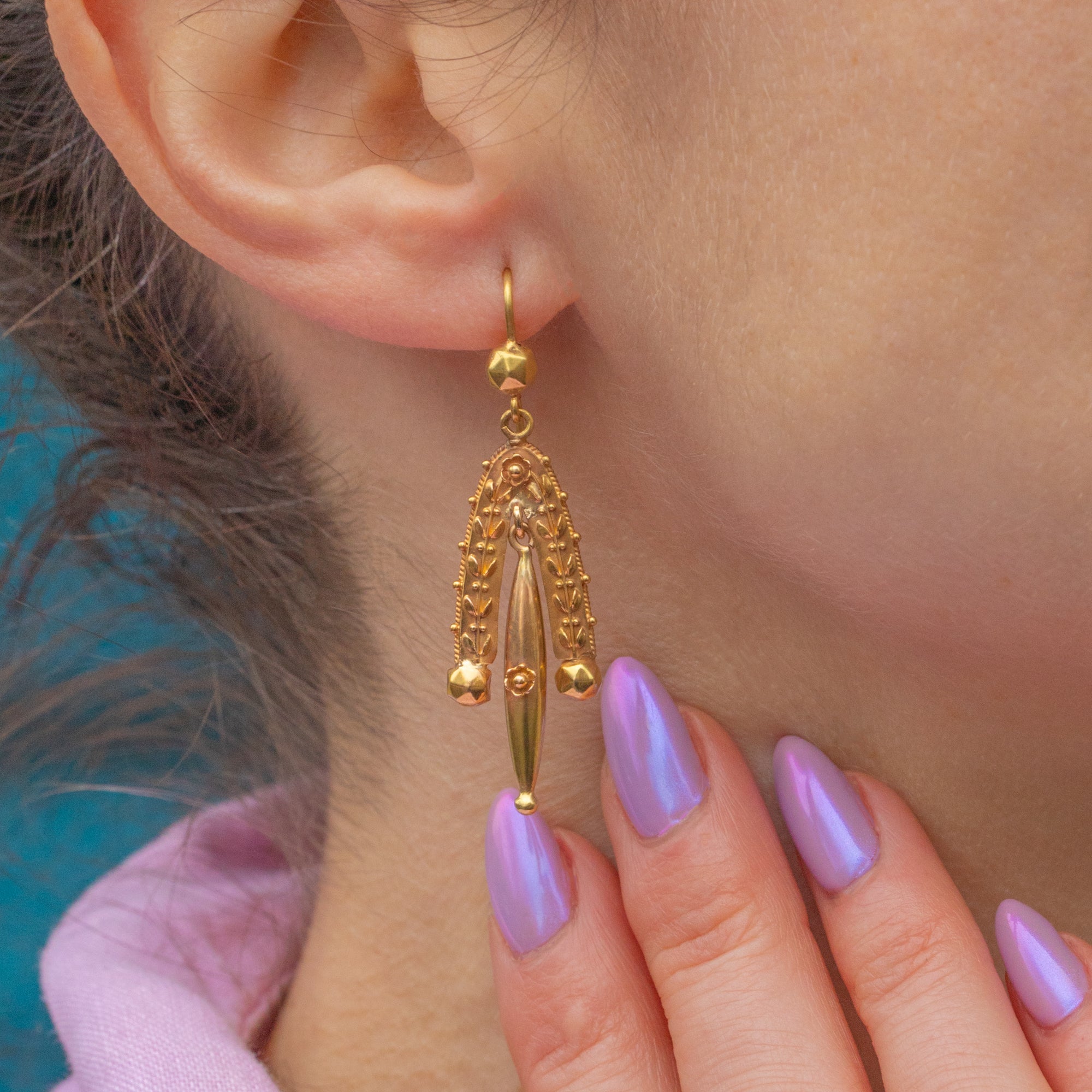 They are complete with a torpedo-style drop in the centre, suspending with lovely movement as they rest from your lobes. Lightweight and intricately detailed, these Victorian 18ct Gold drop earrings are the perfect pair to instantly elevate your attire!