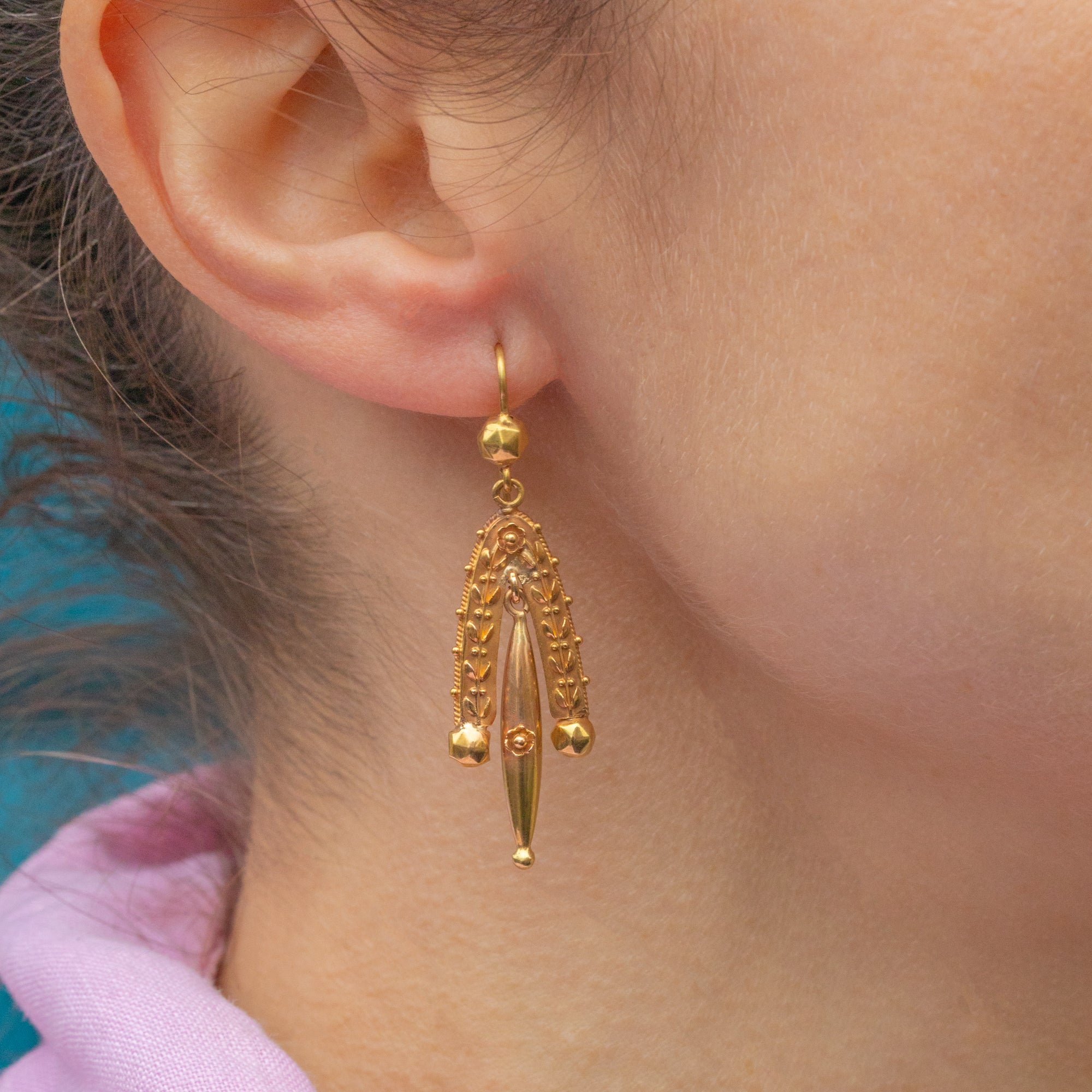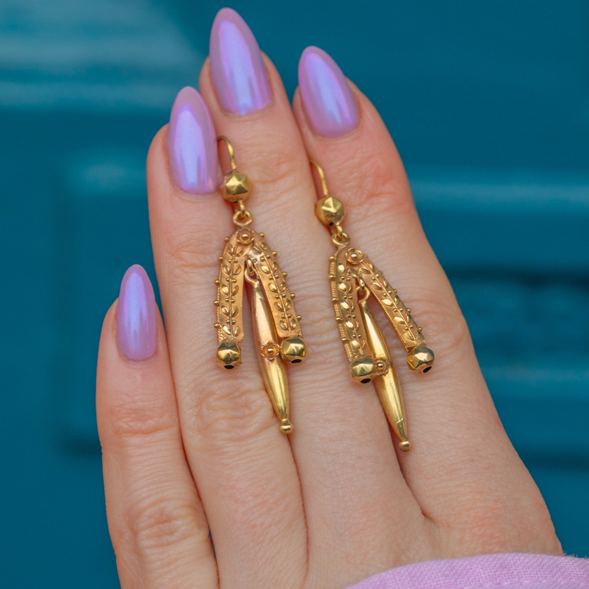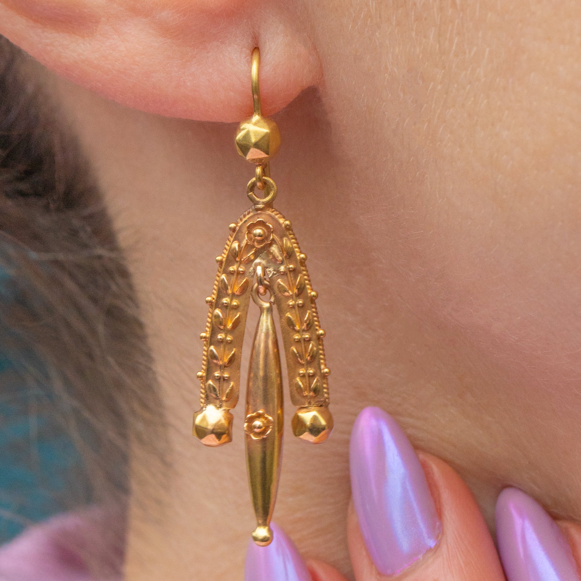 They are complete with a torpedo-style drop in the centre, suspending with lovely movement as they rest from your lobes. Lightweight and intricately detailed, these Victorian 18ct Gold drop earrings are the perfect pair to instantly elevate your attire!
