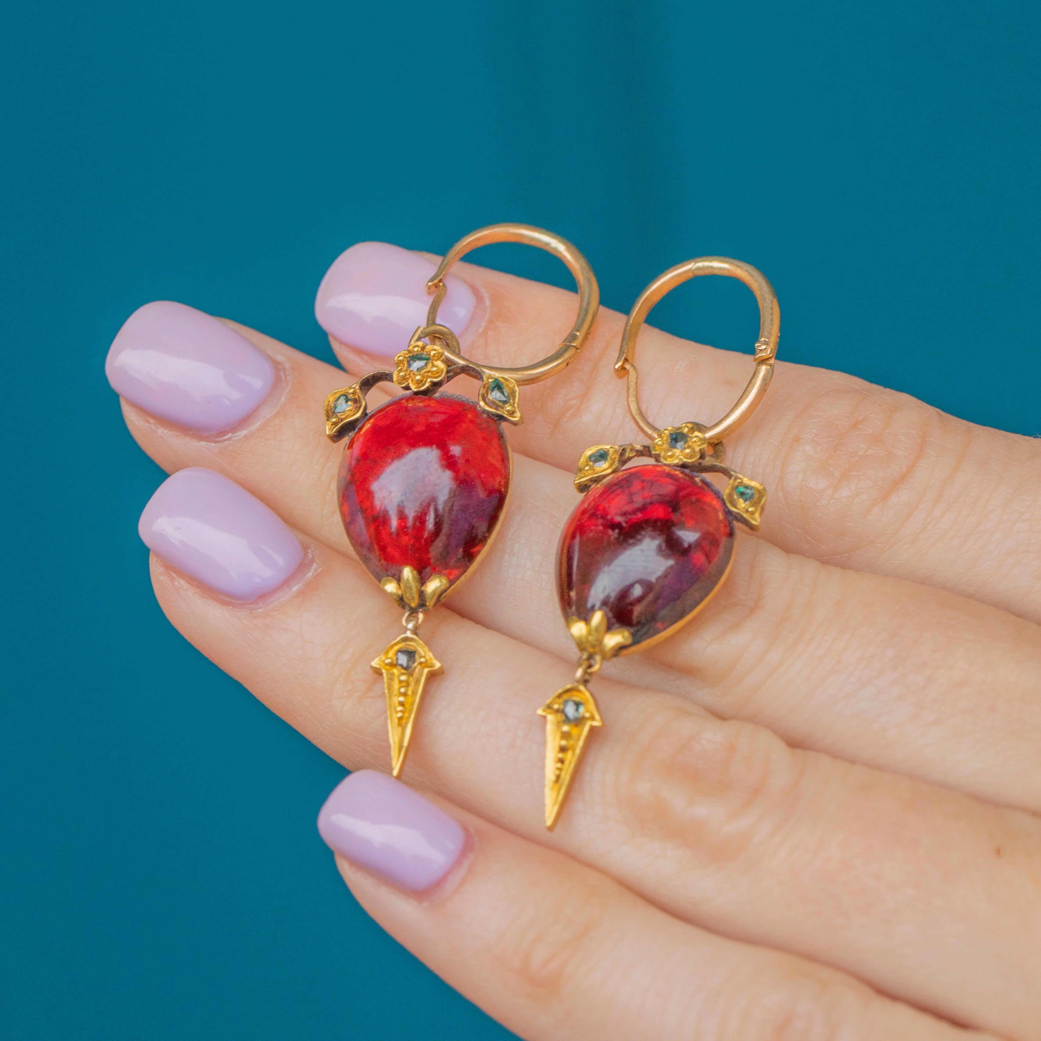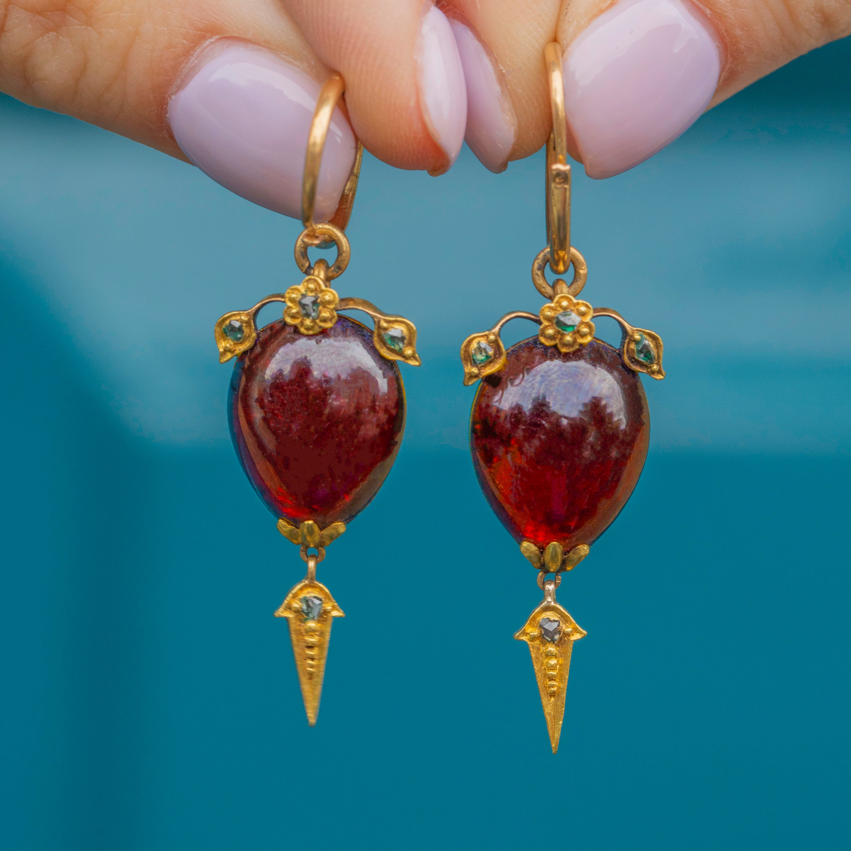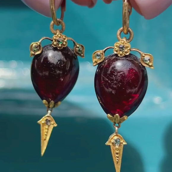 Their Garnets are crowned with sweet floral details, embellished with green foiled rose-cut Diamonds providing a charismatic sparkle. Suspending a splendorous 18ct Gold torpedo drop, these Gold Victorian earrings provide wonderful fluidity with every swish and sway.