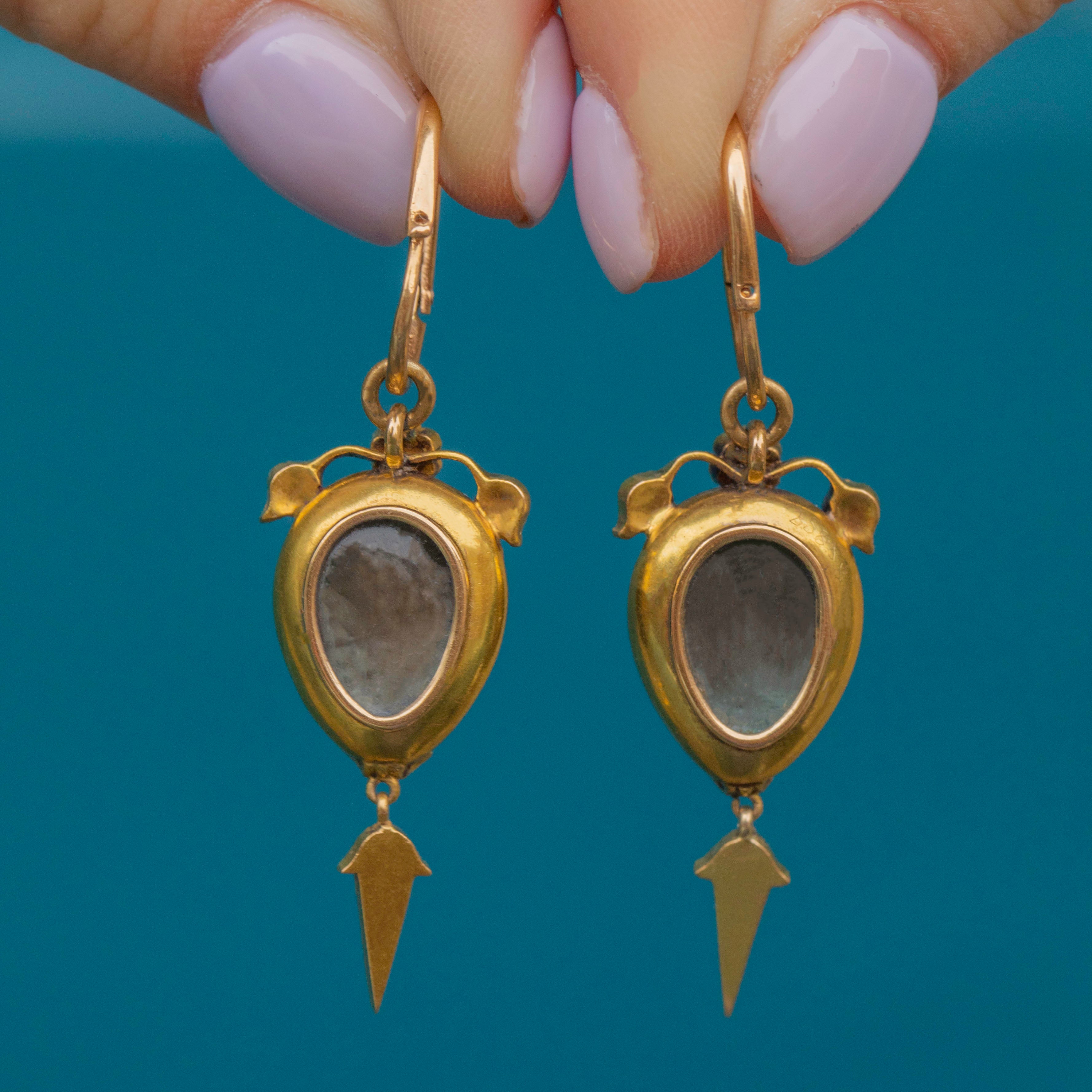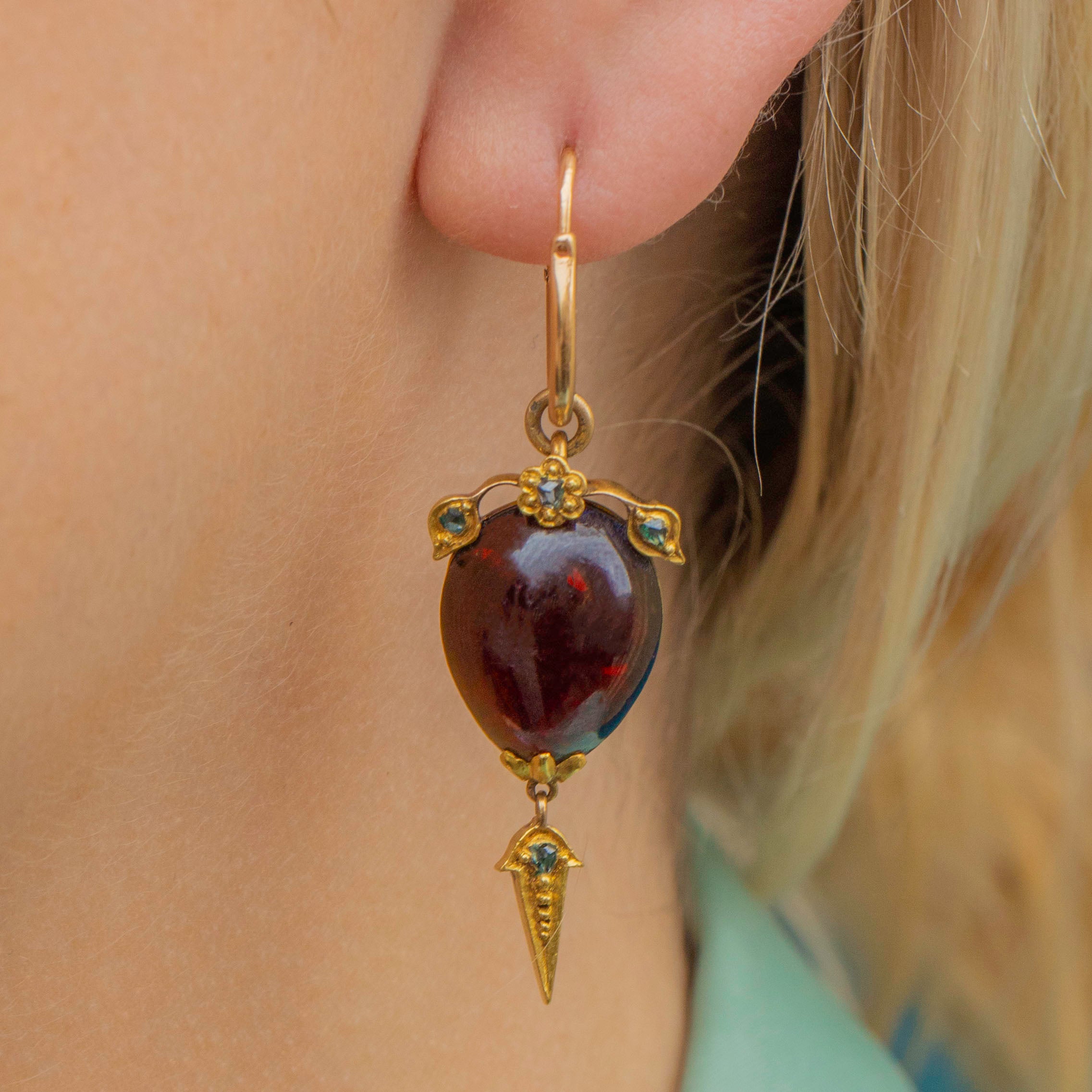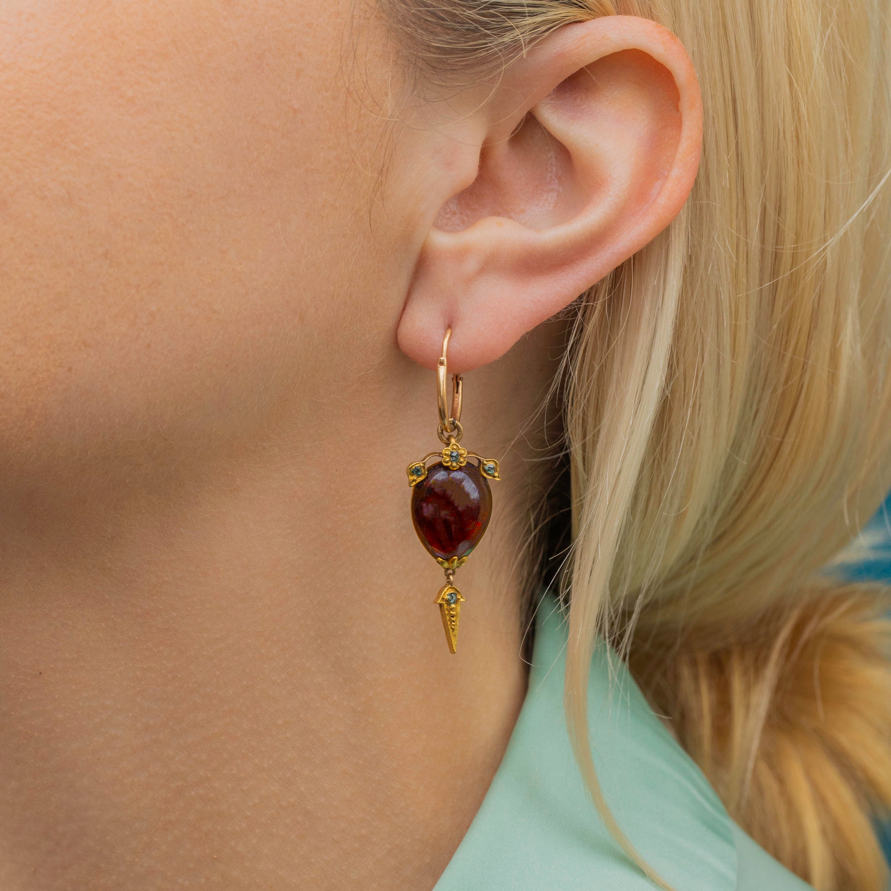 Their Garnets are crowned with sweet floral details, embellished with green foiled rose-cut Diamonds providing a charismatic sparkle. Suspending a splendorous 18ct Gold torpedo drop, these Gold Victorian earrings provide wonderful fluidity with every swish and sway.