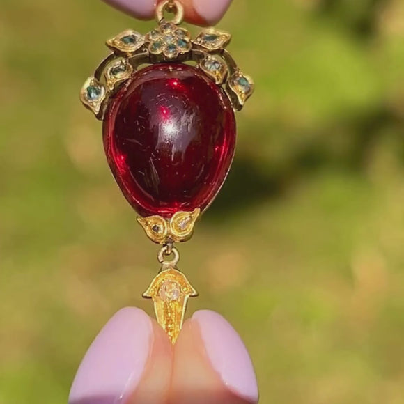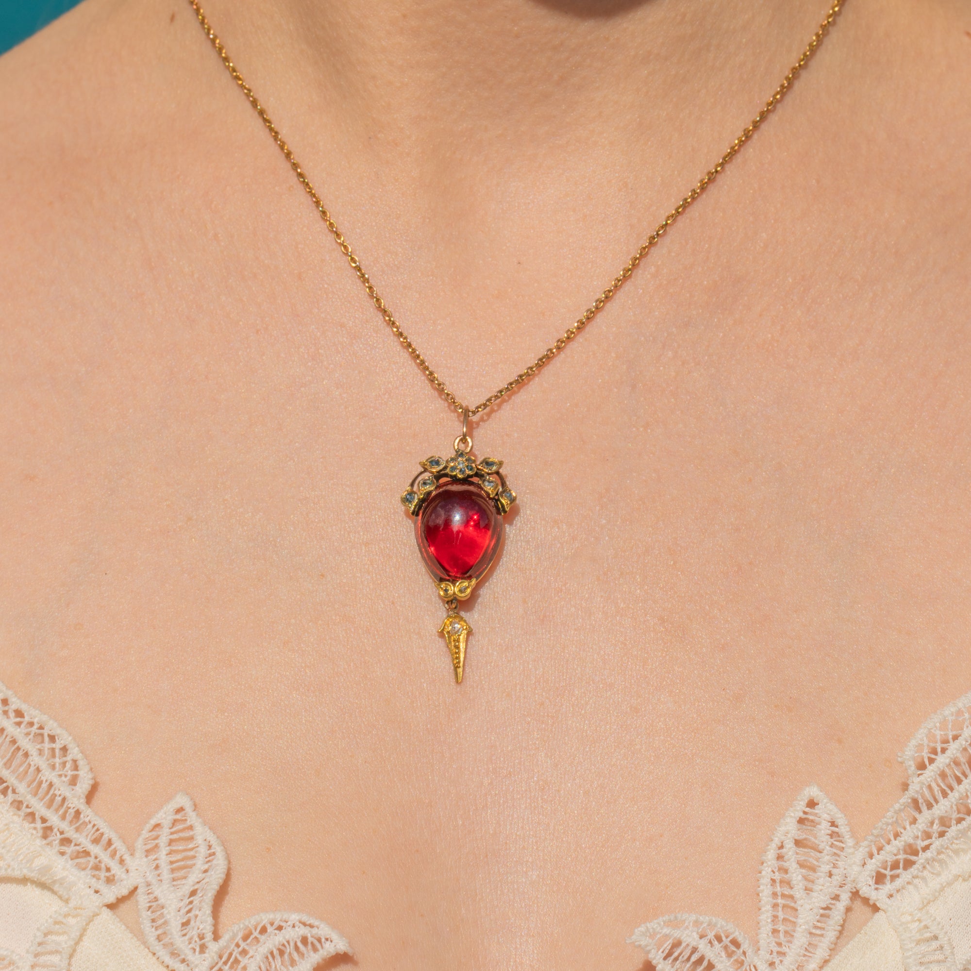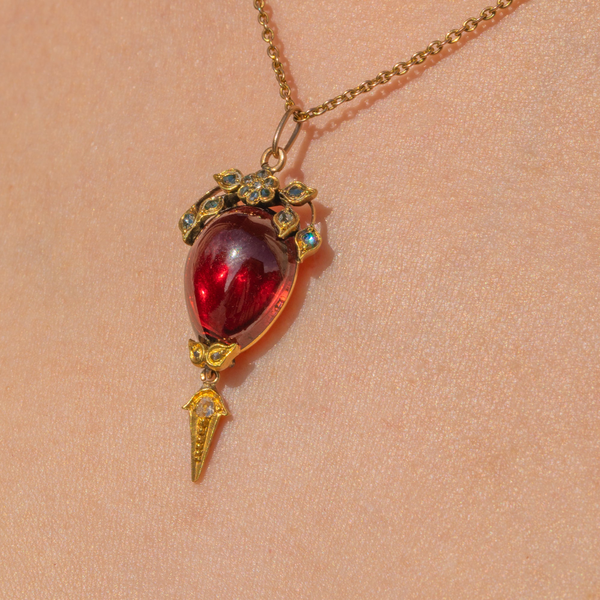 This Victorian 18ct Garnet cabochon Diamond pendant is an absolute feast for the eyes! Crafted from 18ct Gold, this antique pendant is home to a 17.00ct cabochon cut Garnet, embellished with a peppery Floral Diamond crown.