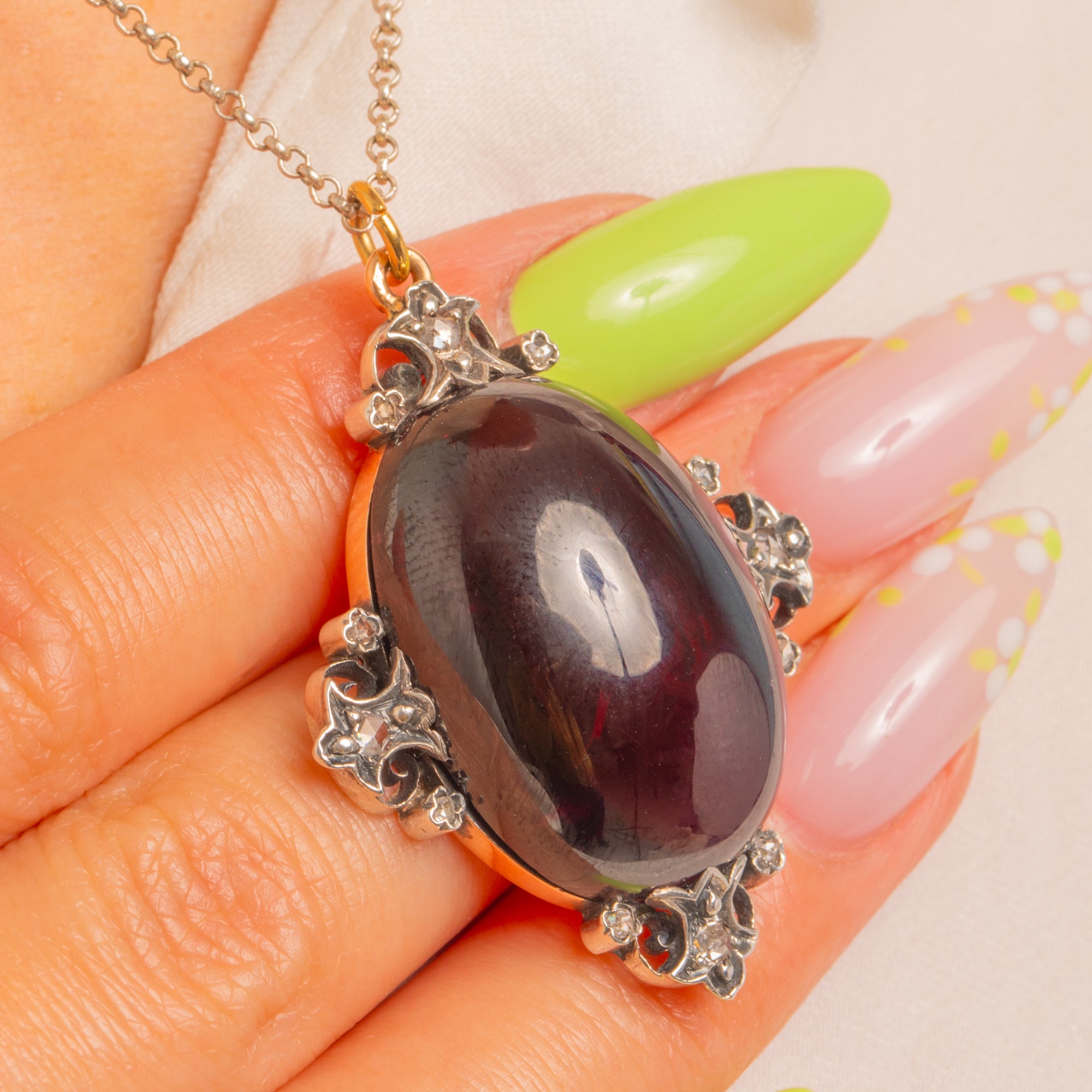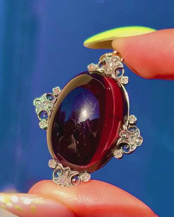 A sumptuous Victorian pendant centred by a highly domed Garnet cabochon of impressive presence, glowing a deep purplish-red. The rich 18ct Gold mount is accented with Sterling Silver settings, each sprinkled with antique rose-cut Diamonds for a delicate, scintillating halo. Ornate foliate and scrollwork terminals frame the stone, lending the piece its romantic, theatrical allure.