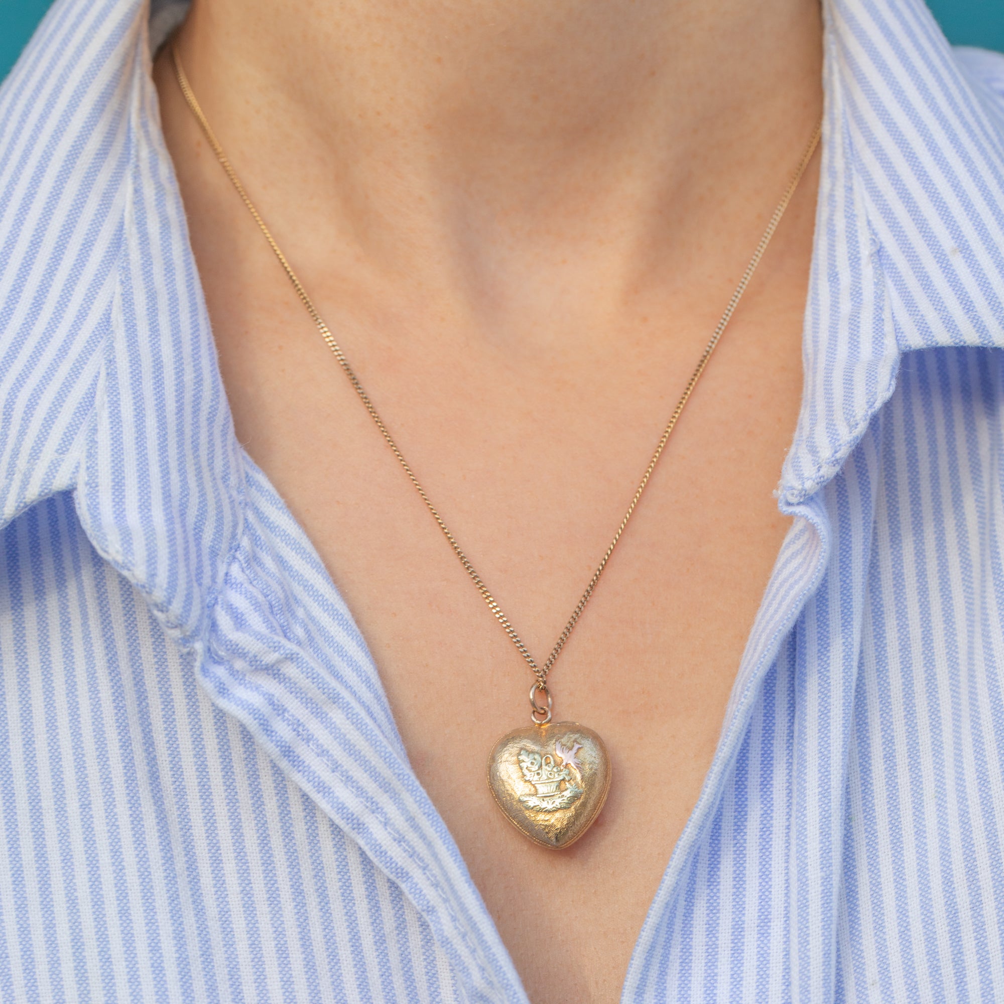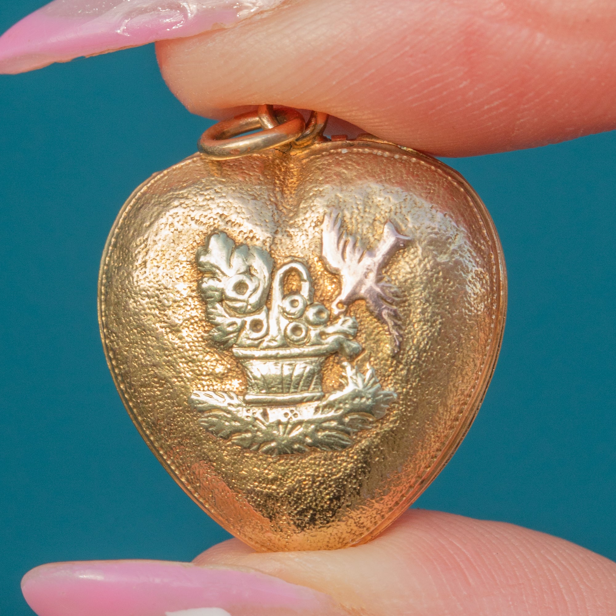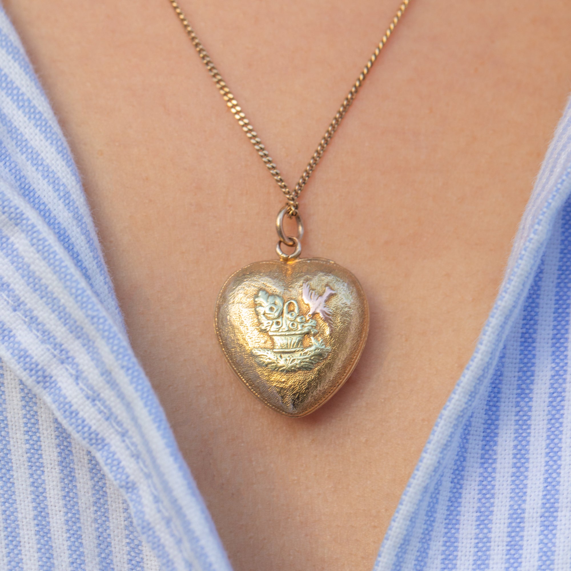 Victorian Médaillon en or 18 carats en forme de cœur avec bouquet et oiseau, vers 1870
