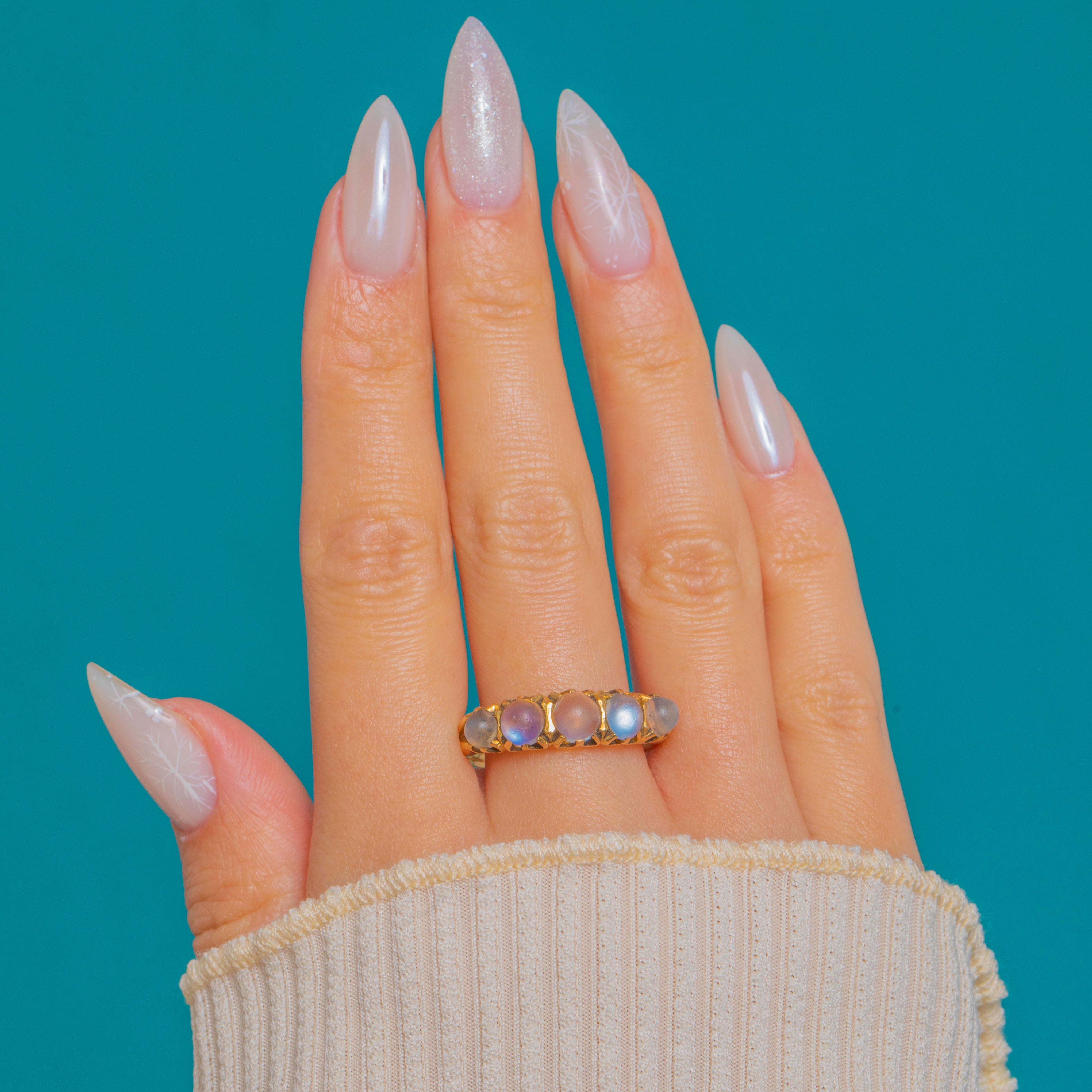 Ethereal and unmistakably Victorian, this five-stone Moonstone ring is crafted in rich 18ct Gold and hallmarked for Chester, 1899. The graduating cabochons glow with that coveted bluish-lilac adularescence, arranged across the finger in a romantic line that feels both delicate and enduring.