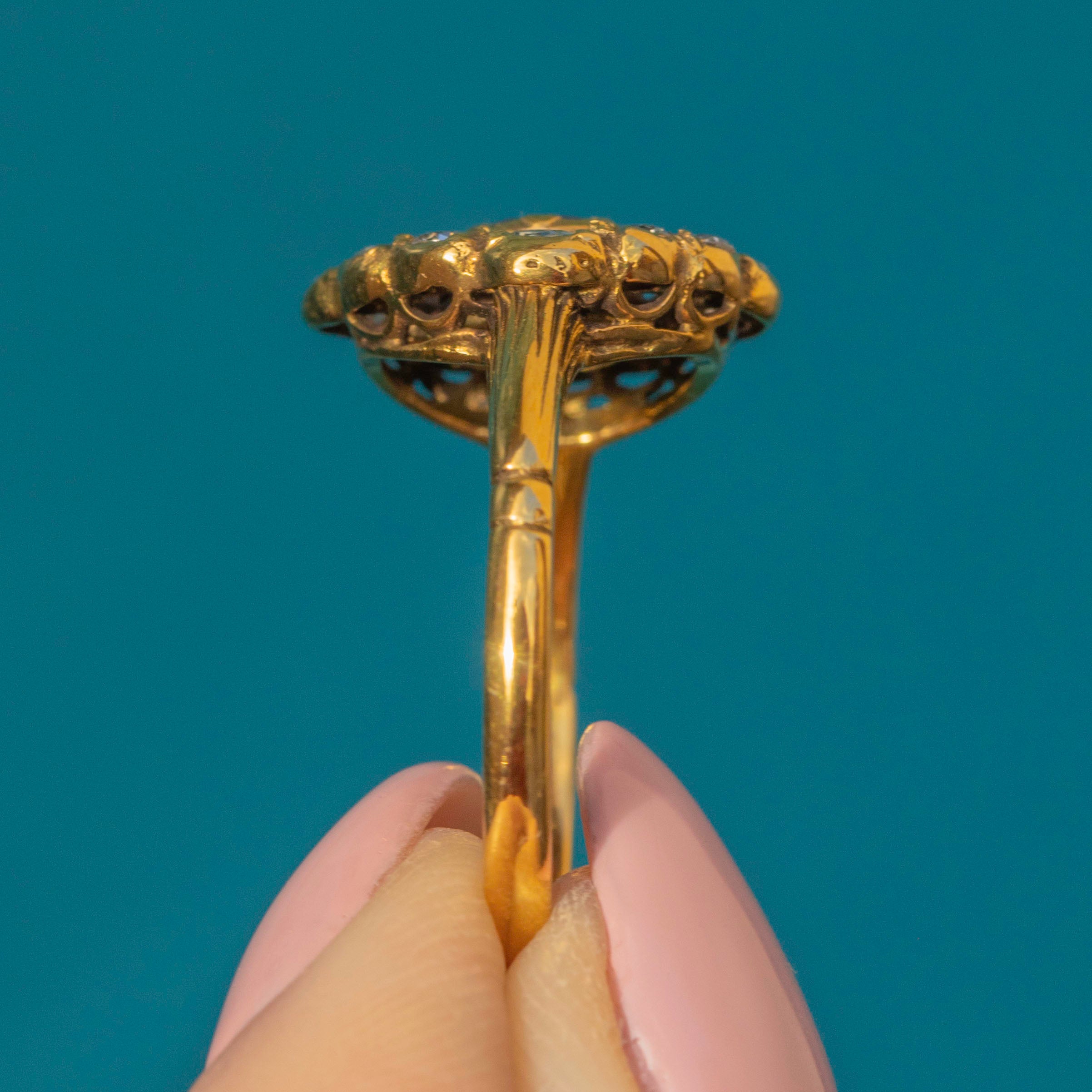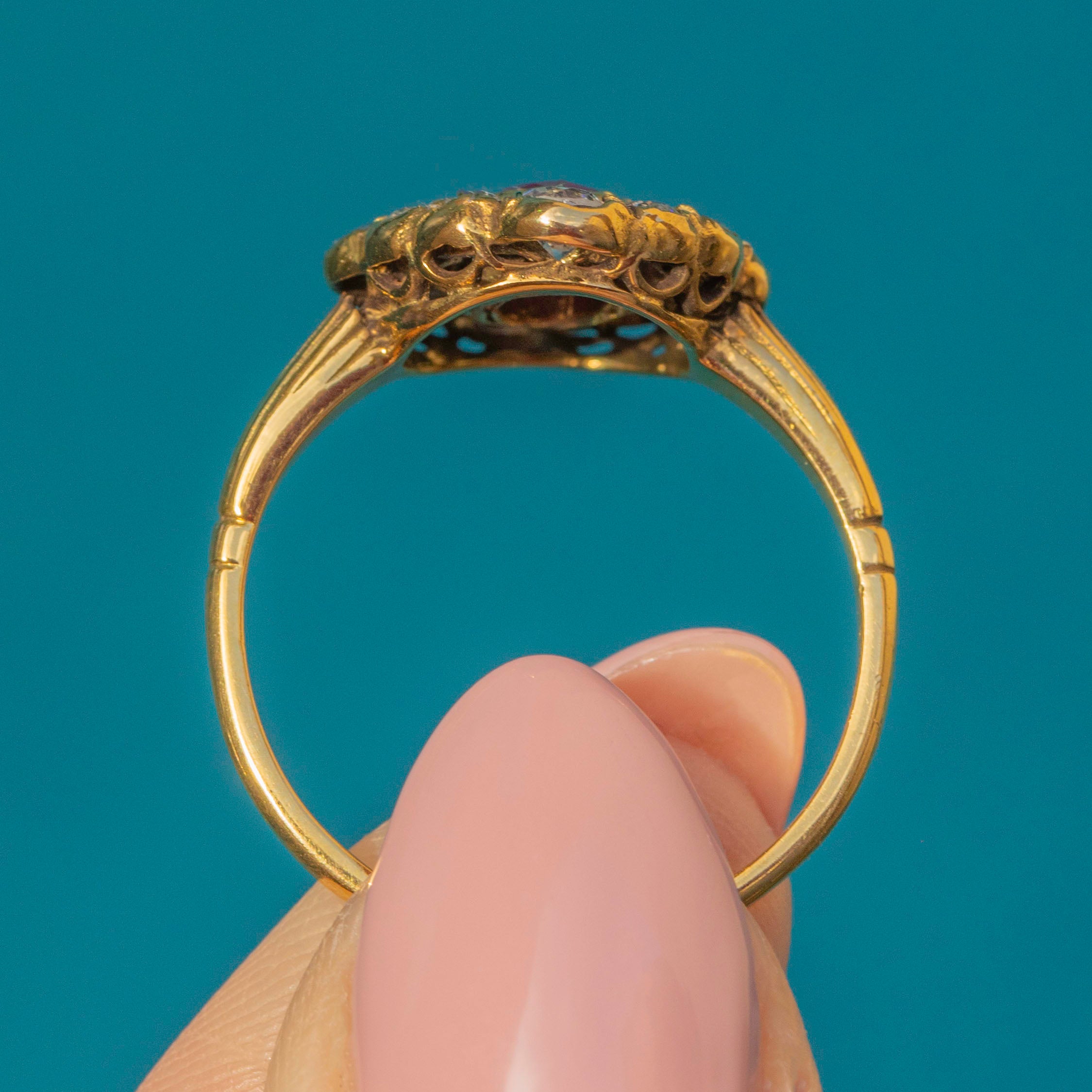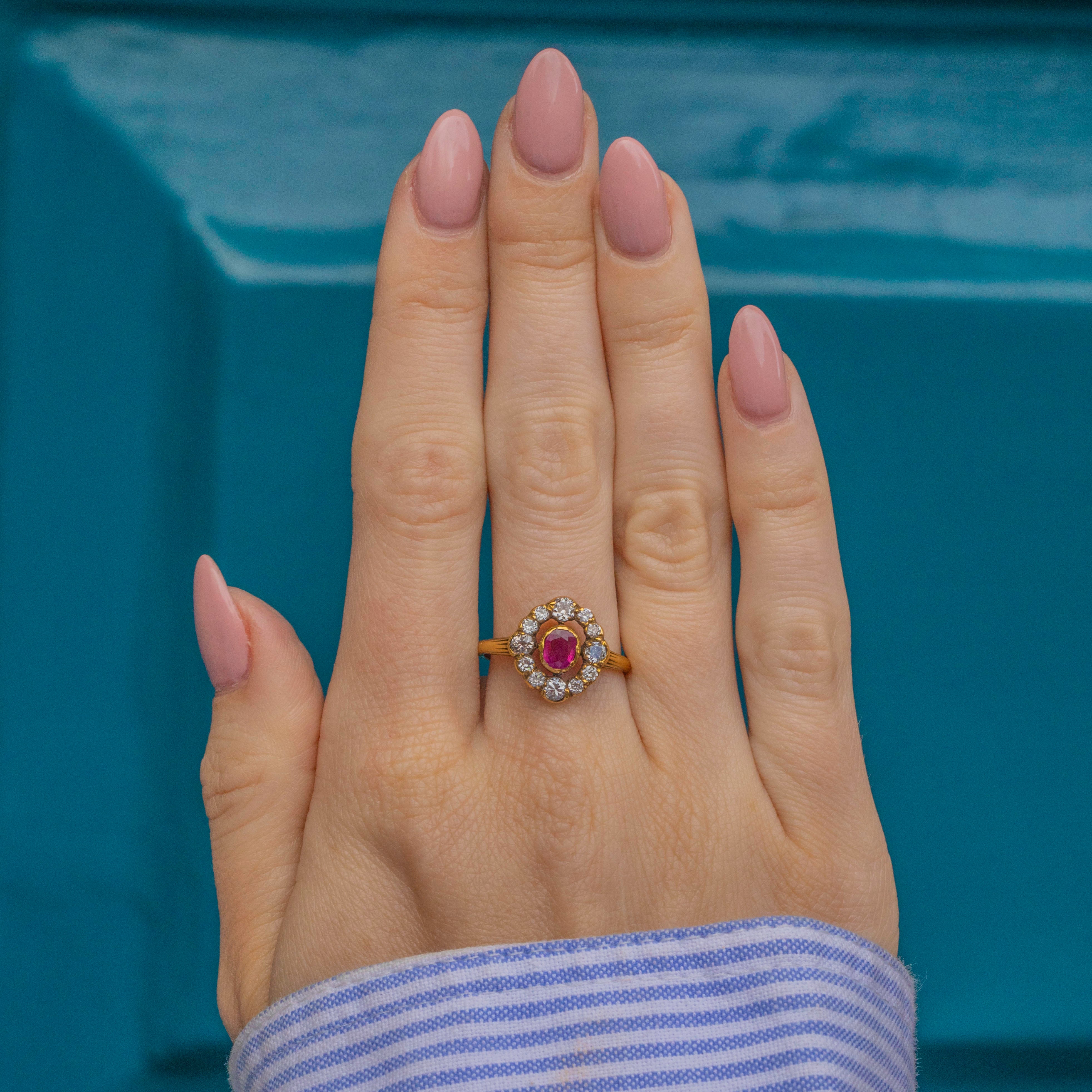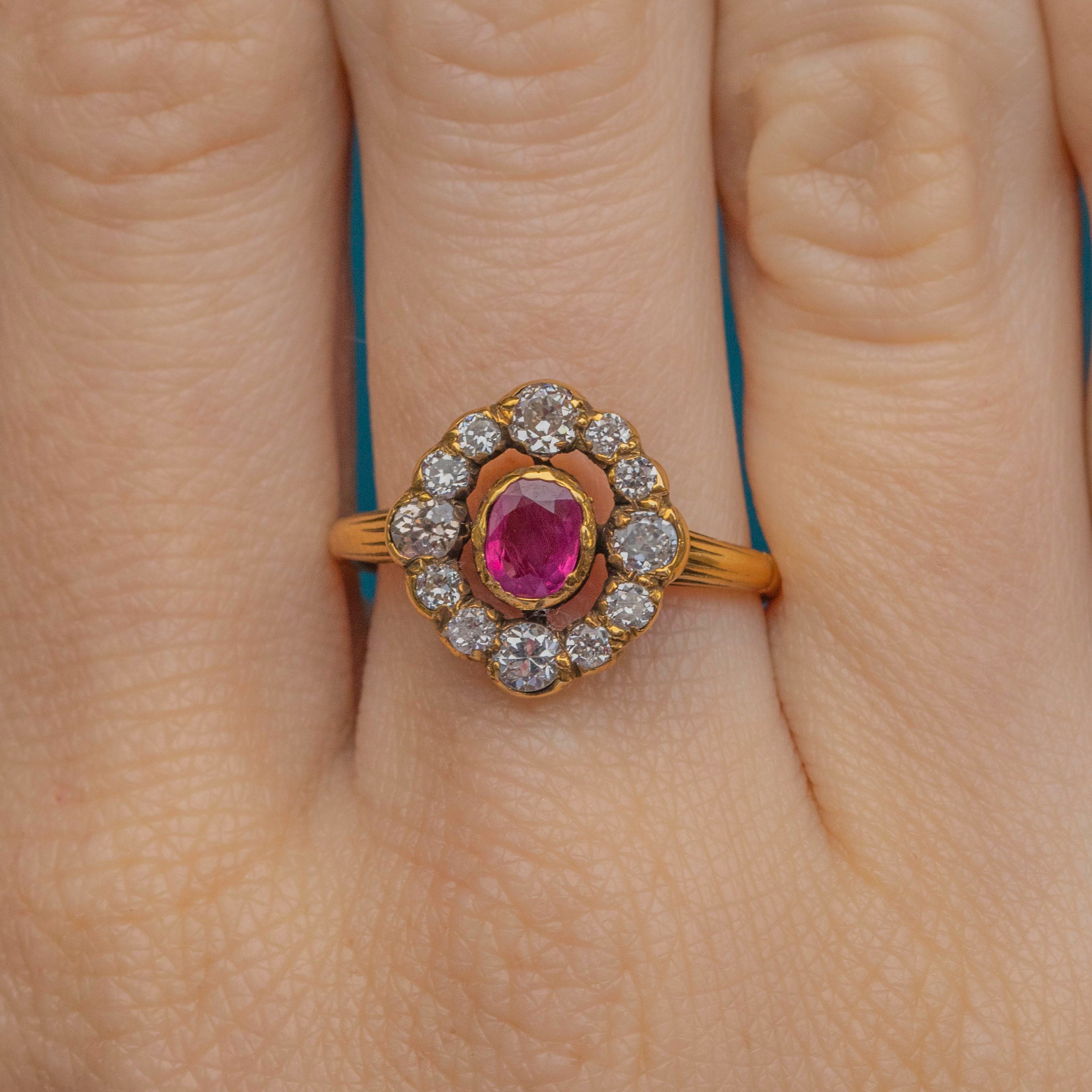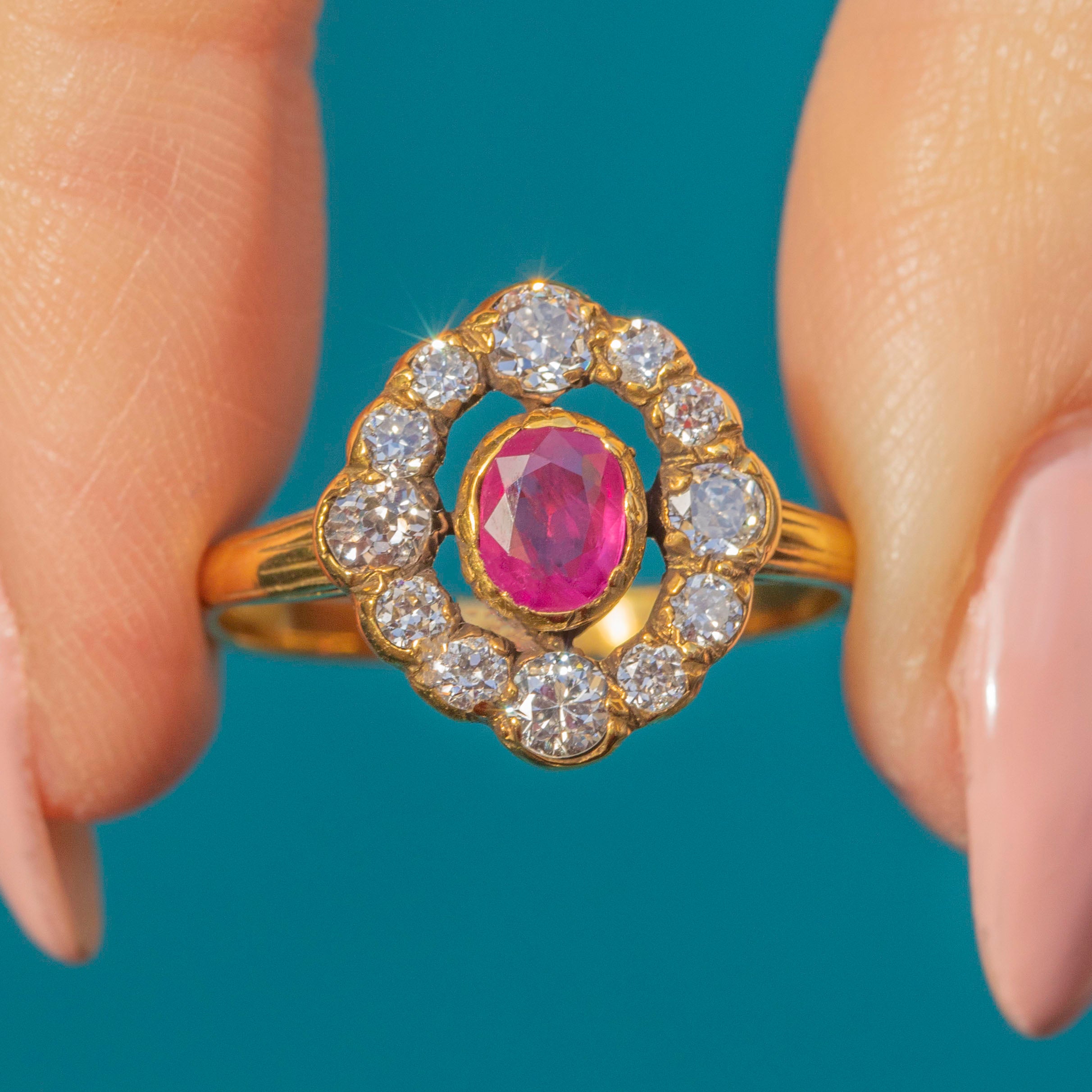 This Victorian 18ct Gold natural Ruby Diamond cluster ring is an exquisite example of the craftsmanship of the Victorian era! With a delectable selection of hand-cut gemstones arranged in a striking cluster and set in sumptuous 18ct Gold, this antique Ruby Diamond ring would make the most phenomenal engagement ring choice.