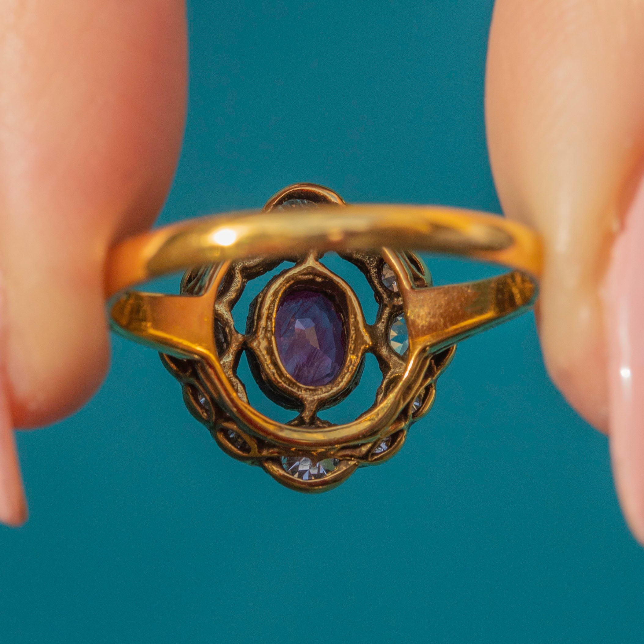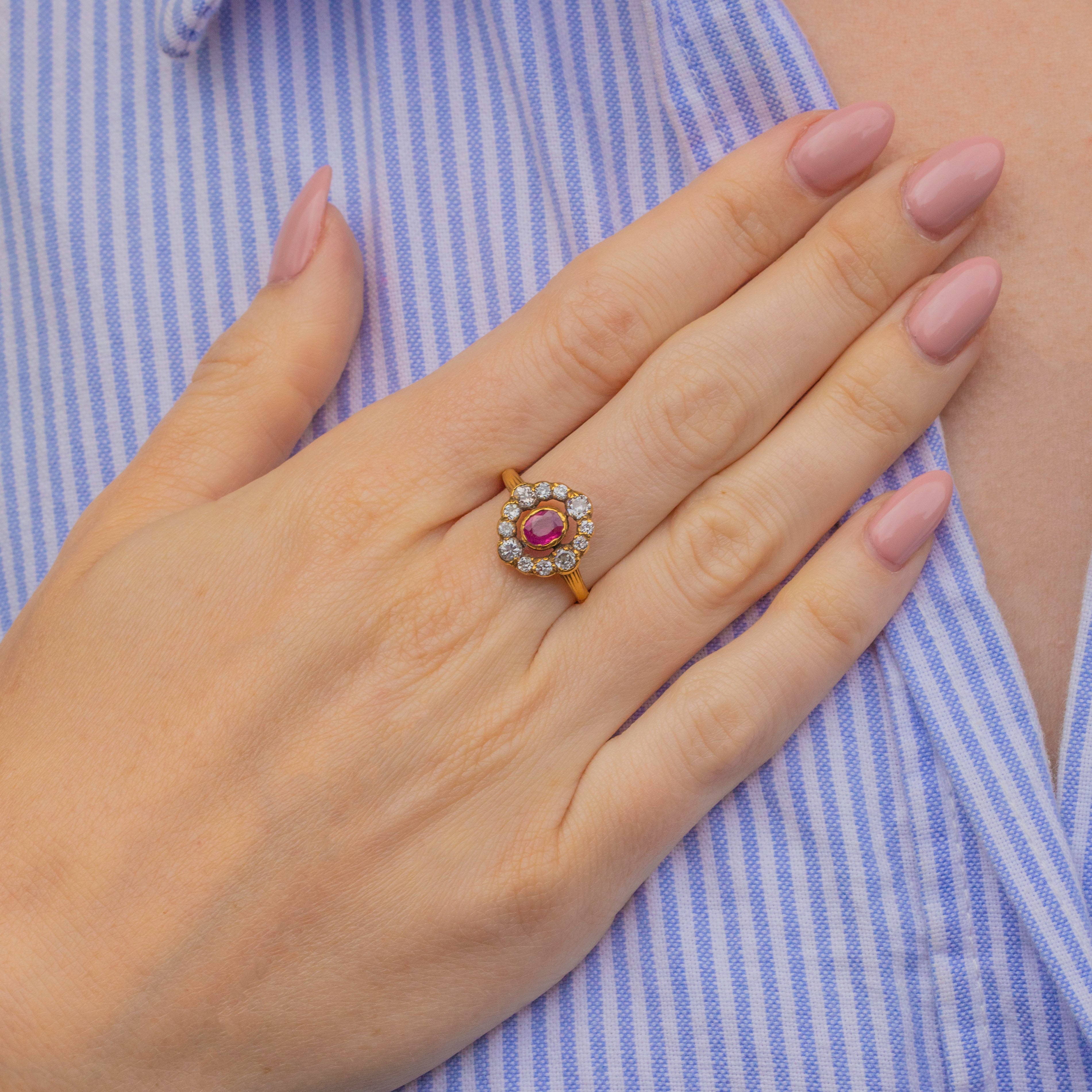 The natural Ruby will instantly seduce you with its rose-pink hue, surrounded by a halo of scintillating Diamonds with a combined weight of 0.36ct! The cluster is held proudly by a decorative gallery that allows the light to beam through each gemstone, and the low profile makes this Victorian Ruby Diamond ring comfortable for everyday wear.